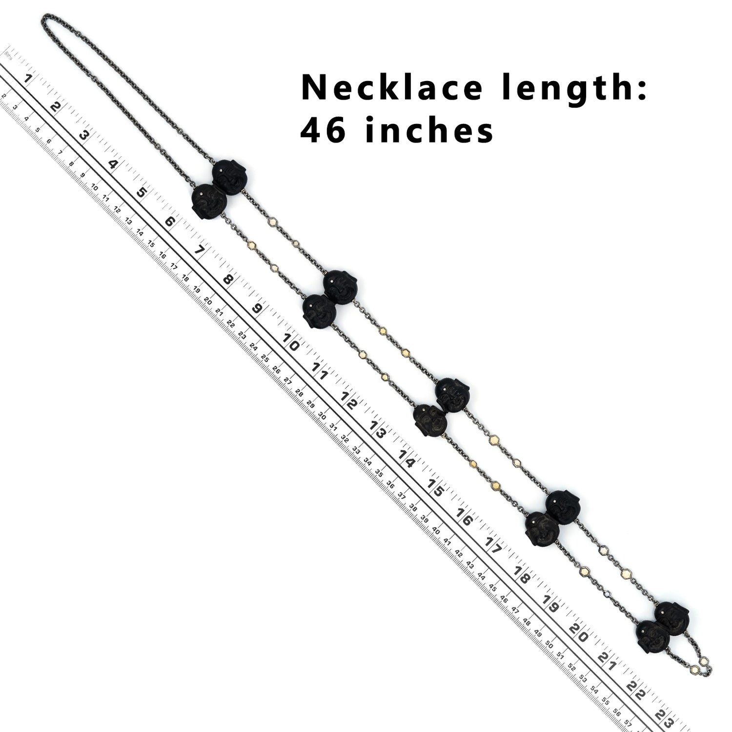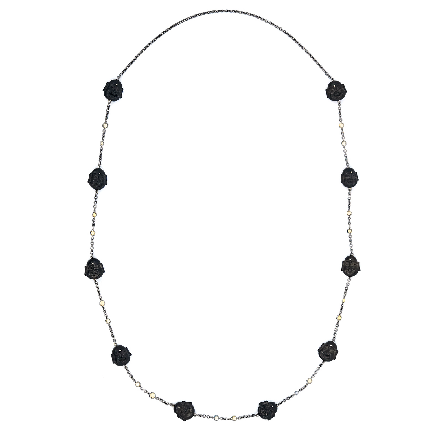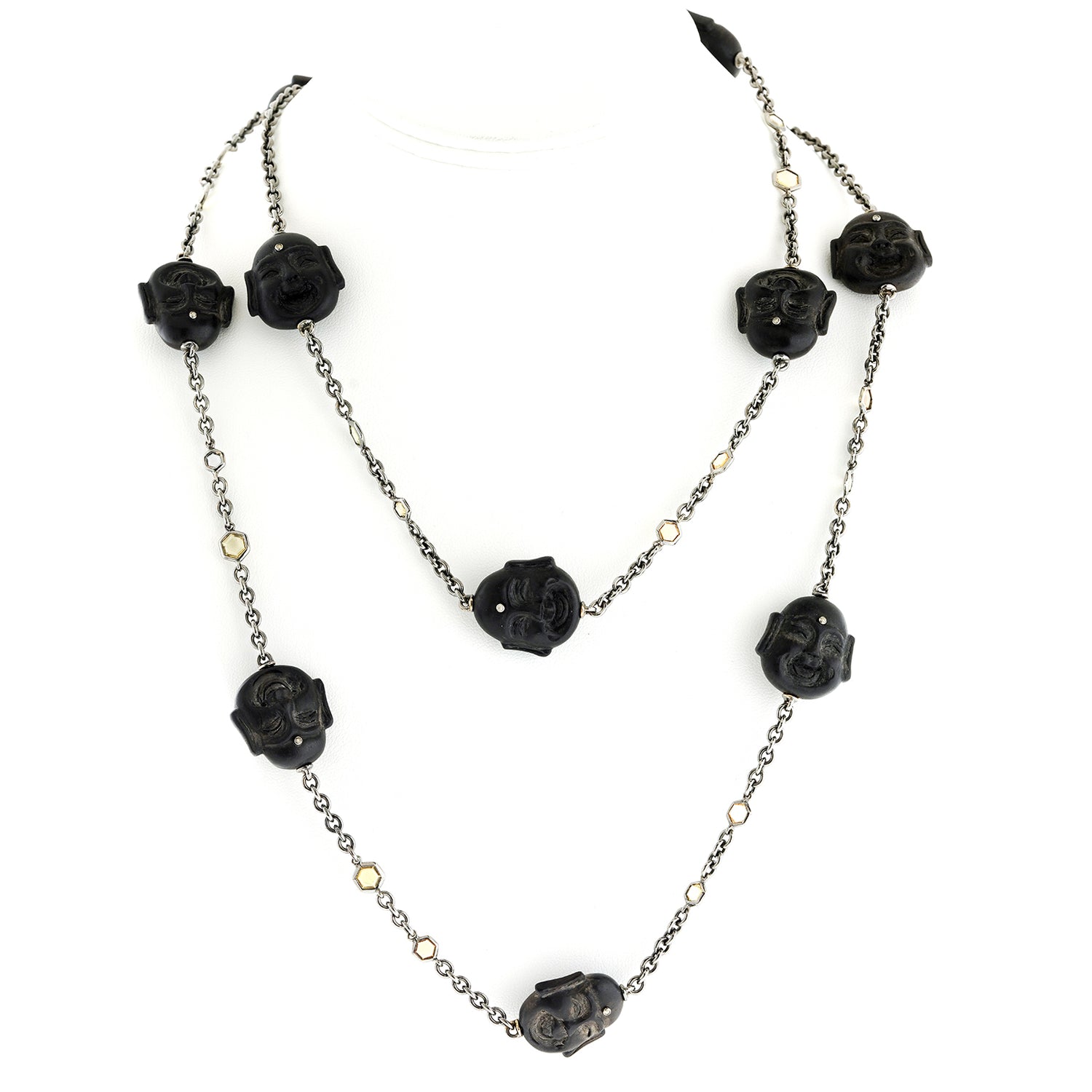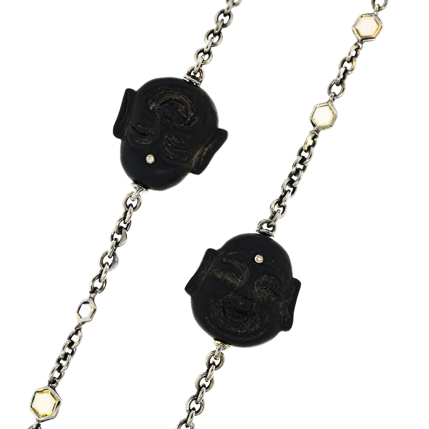 Circa 1960s, 18k, Blackened Gold, Switzerland. This fabulous Buddha necklace blends playful style, enlightenment, and fashion. Joyfully chic, we all meditate in our own way. Ten beautifully carved wood Buddha heads are set with brilliant white diamonds interspersed with soft yellow topaz. Wear the divine, have fun with it, and look and feel amazing. Excellent condition.