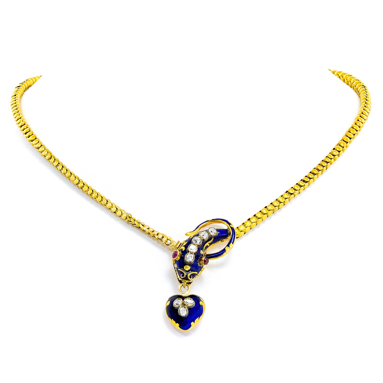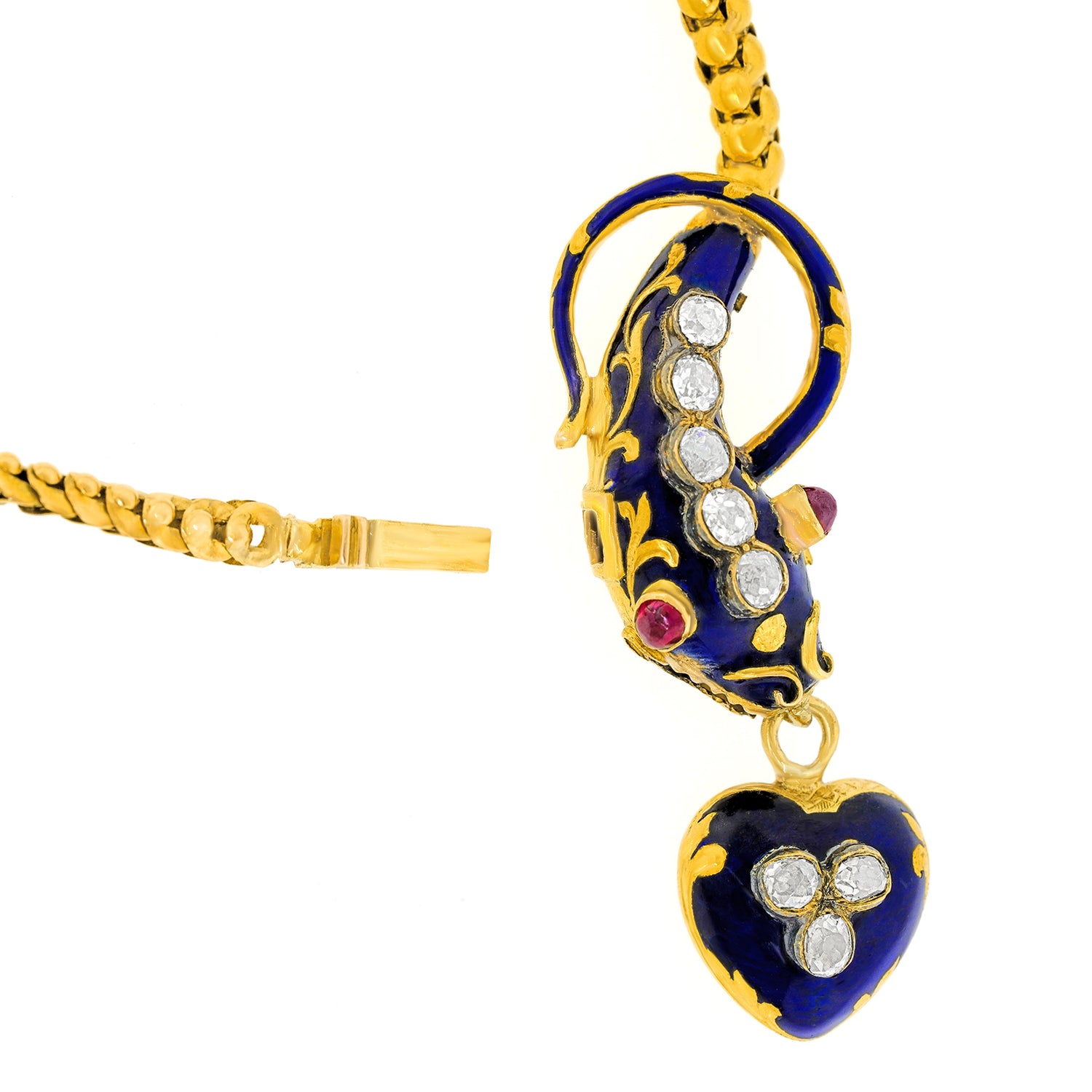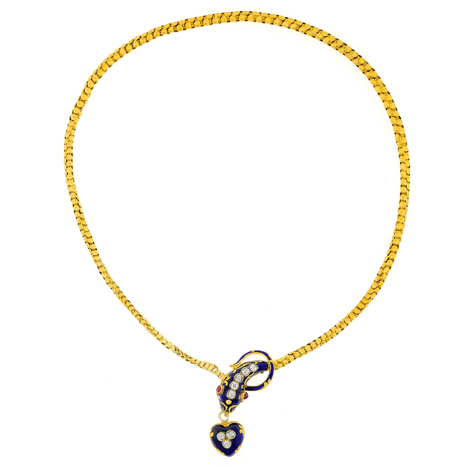 Circa 1870s, 15k. Holding a heart in his mouth, this wonderful antique snake necklace is adorned with 1.0 carats of fine old cut diamonds and rich blue enamel. The detailed gold scales feel smooth and comfortable on the neck while adding visual depth. Adorning our fingers and wrists for thousands of years, snake jewelry has been one of our most beloved fashion accessories. Meticulous gold work and fine white diamonds complete the look. Excellent condition.