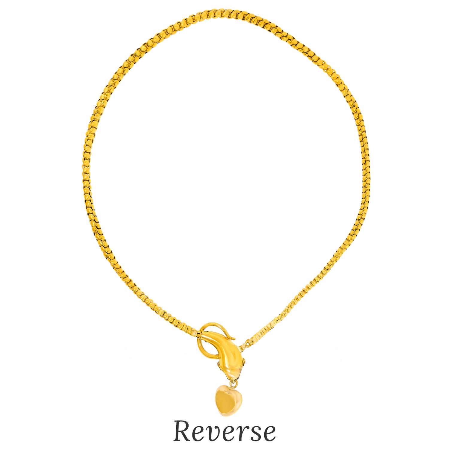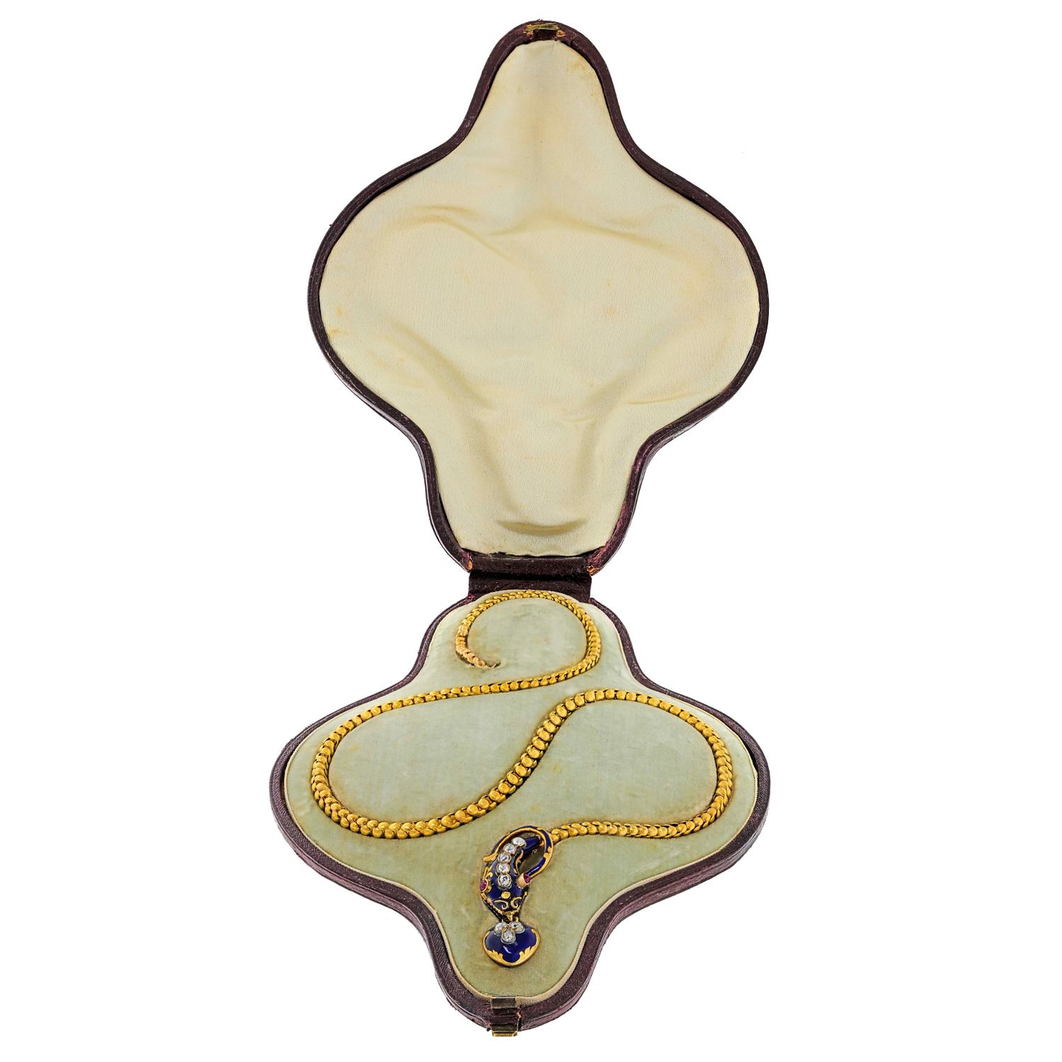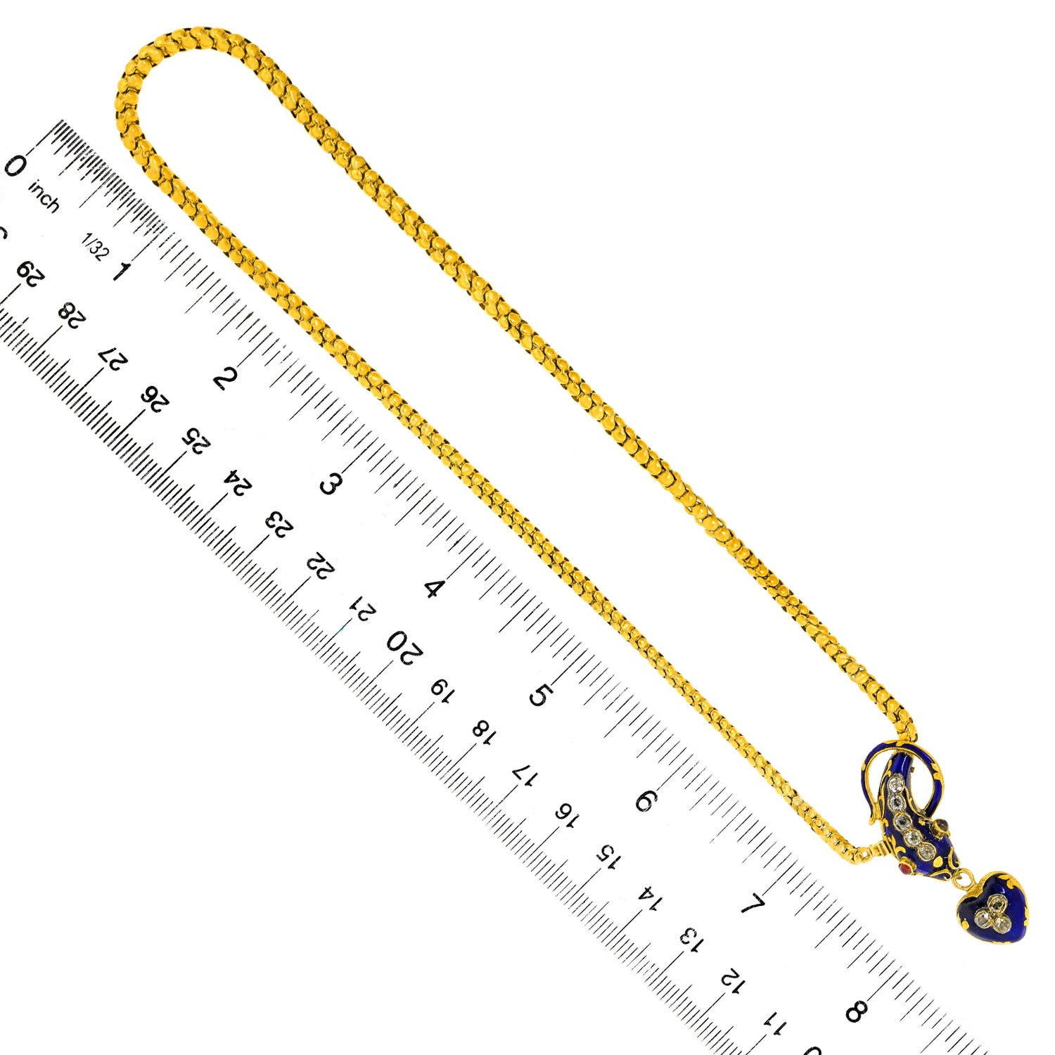 Circa 1870s, 15k. Holding a heart in his mouth, this wonderful antique snake necklace is adorned with 1.0 carats of fine old cut diamonds and rich blue enamel. The detailed gold scales feel smooth and comfortable on the neck while adding visual depth. Adorning our fingers and wrists for thousands of years, snake jewelry has been one of our most beloved fashion accessories. Meticulous gold work and fine white diamonds complete the look. Excellent condition.