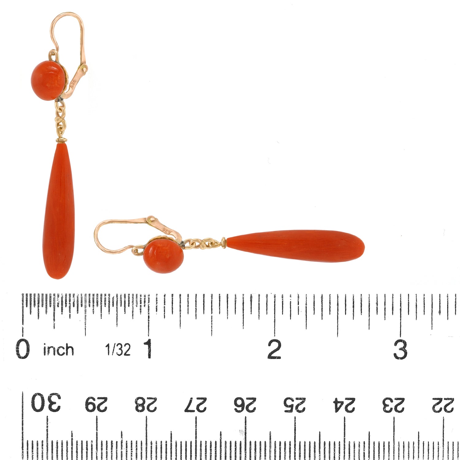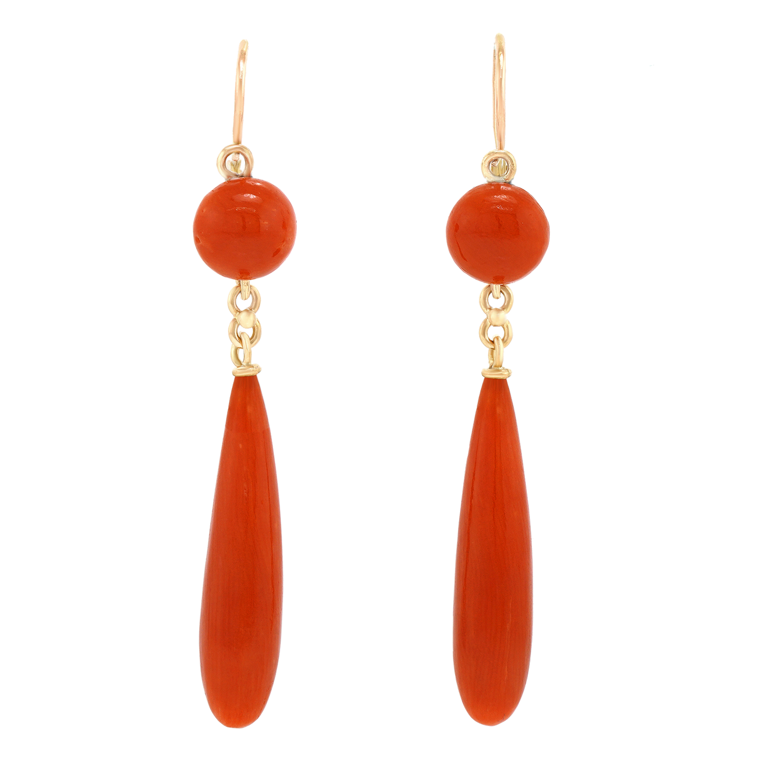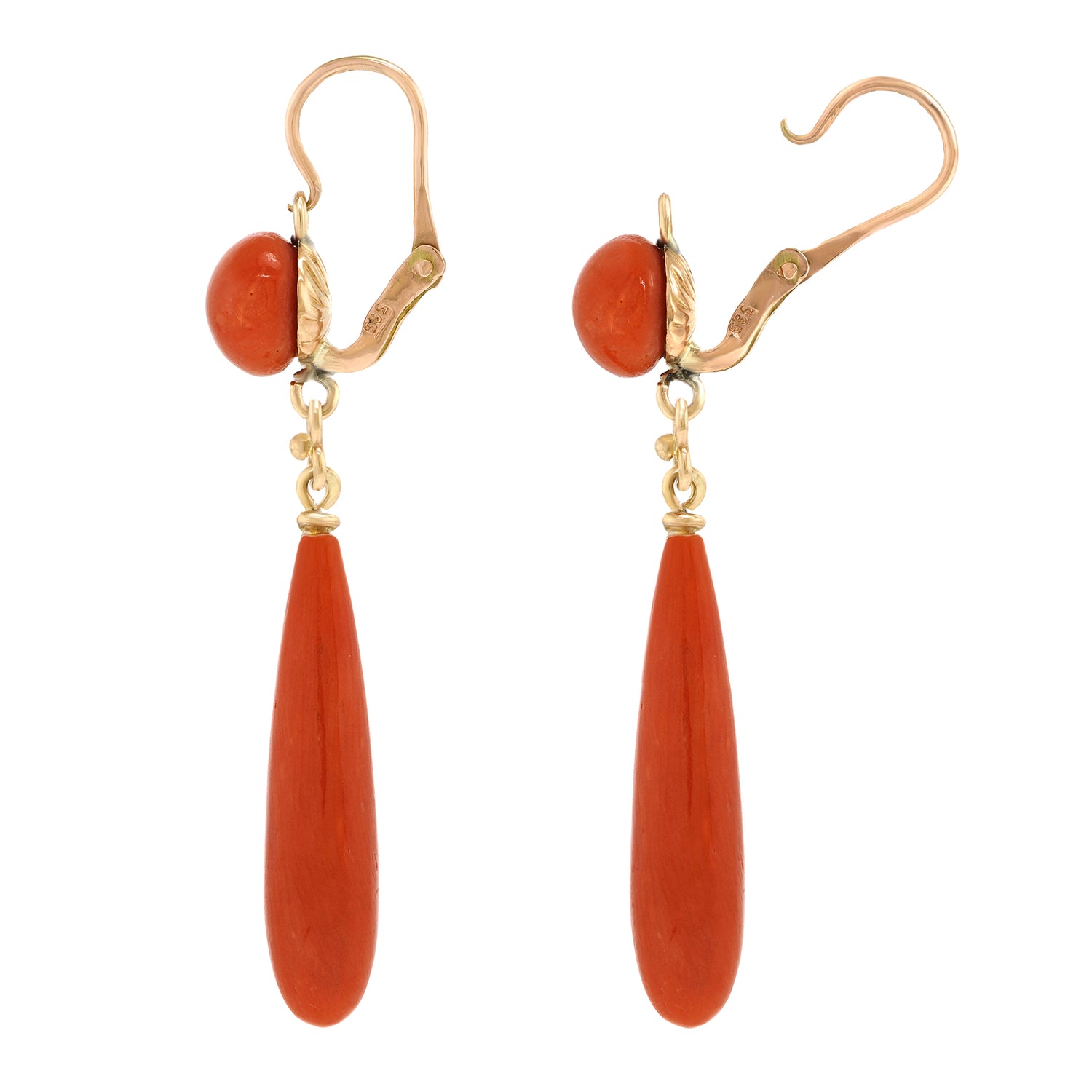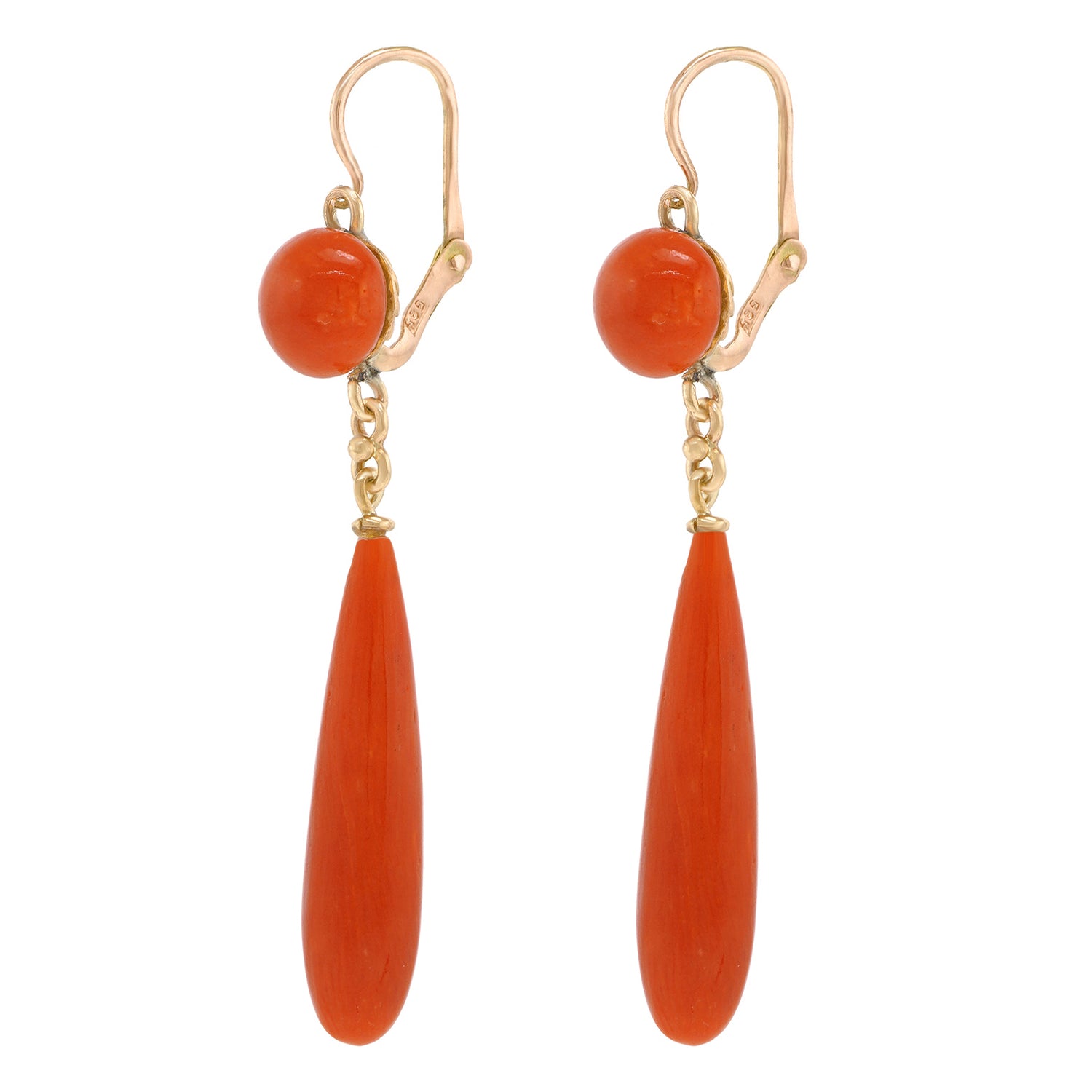 Circa 1920s, 14k, possibly Swiss or Italian. Delightfully bright, these graceful Art Deco chandelier earrings feature vibrant coral complemented by polished yellow gold and playful movement. Excellent condition.