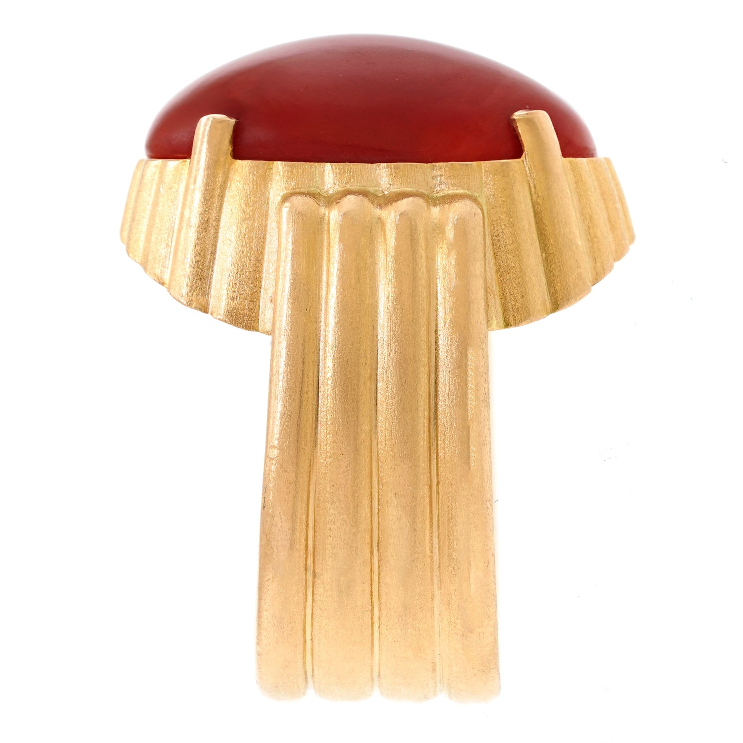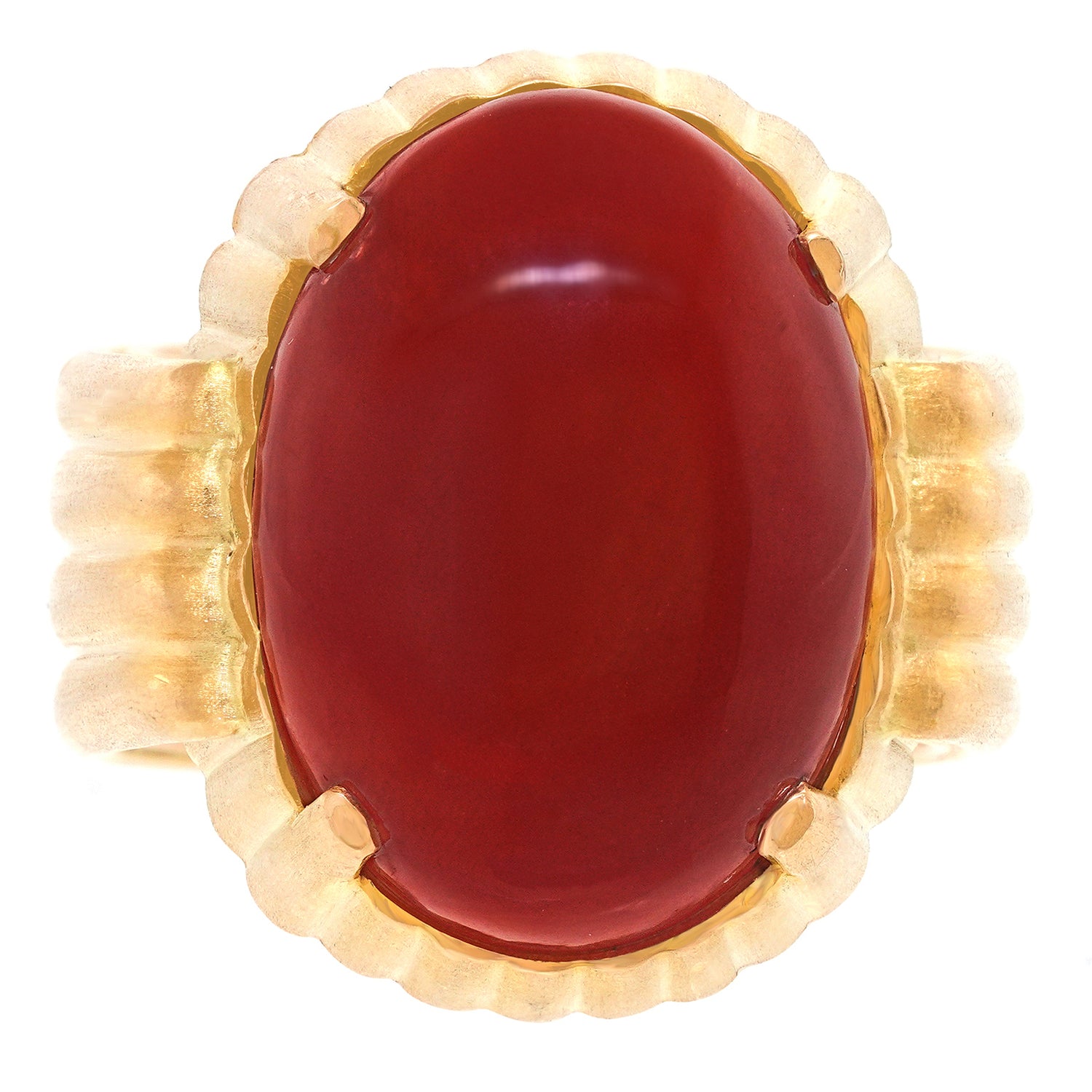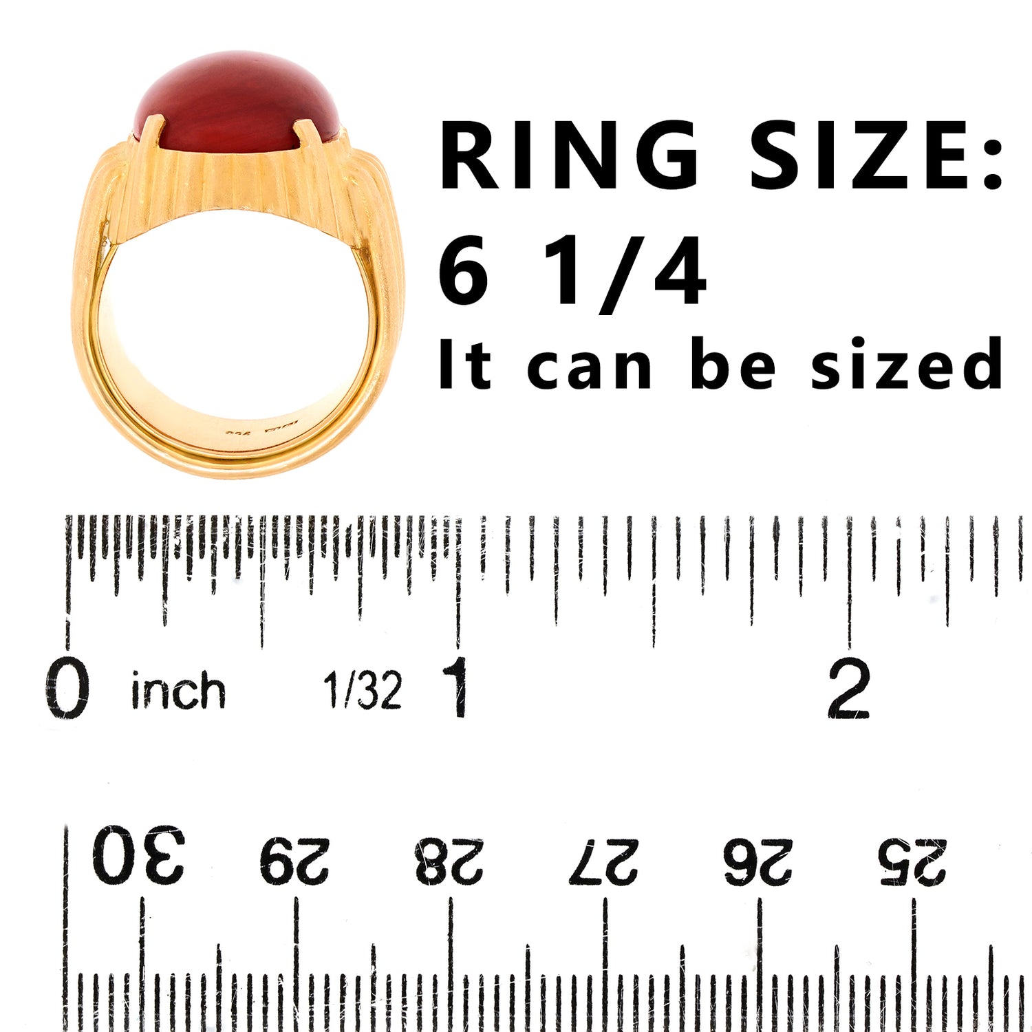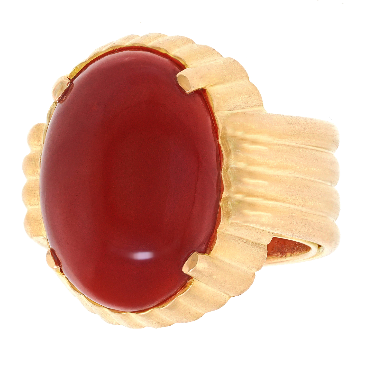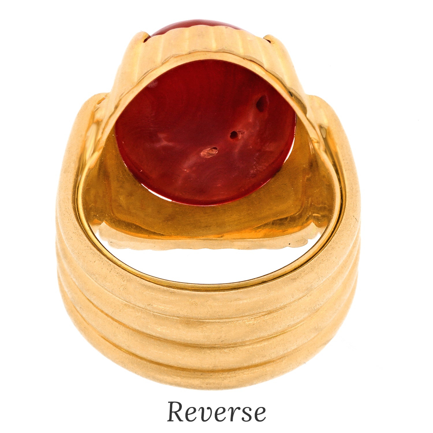 Circa 1970s, 18k, by Paul Binder, Zurich, Switzerland. From Art Deco to Modernism, Paul Binder exemplifies the Zurich aesthetic. The Swiss never lost their taste for Deco and this modernist ring, with its stunning coral cabochon, has that look. Excellent condition.