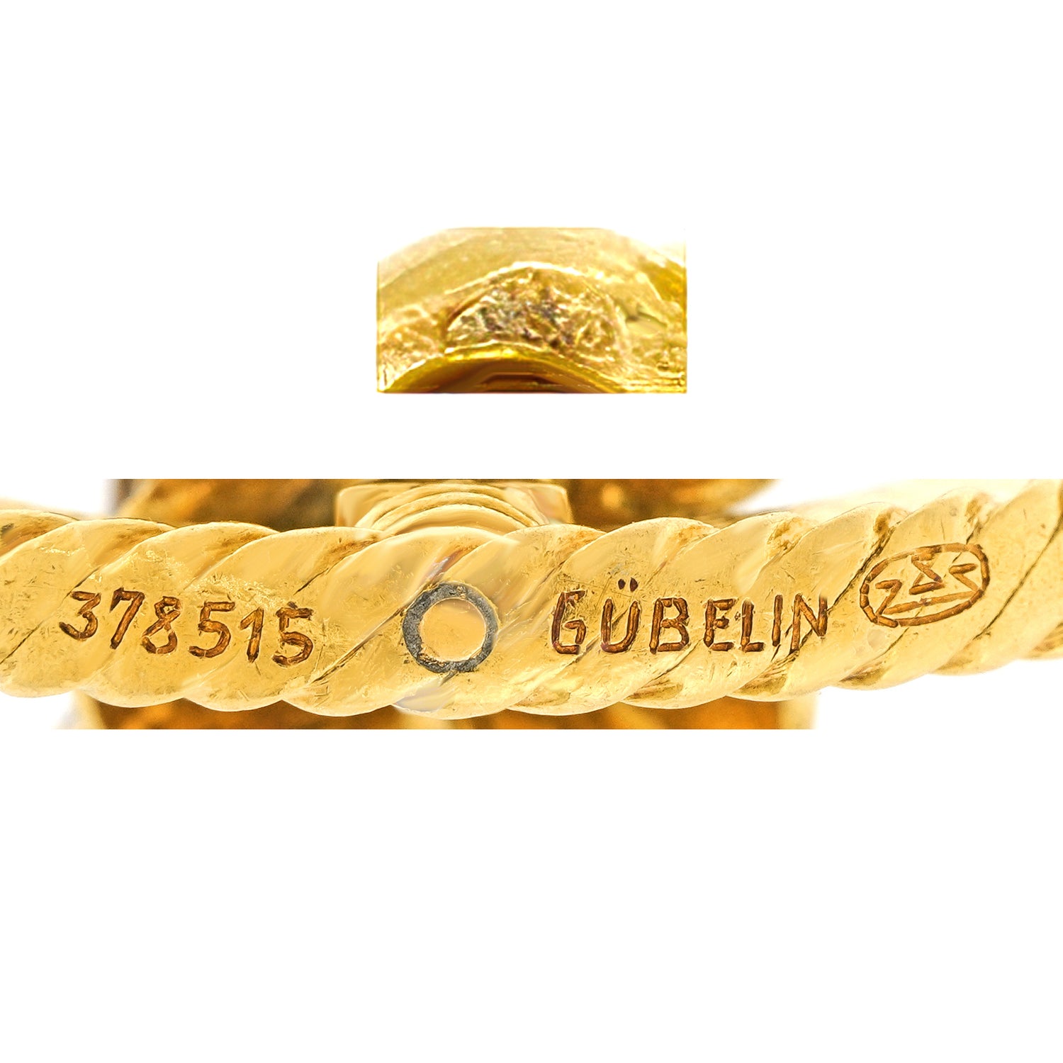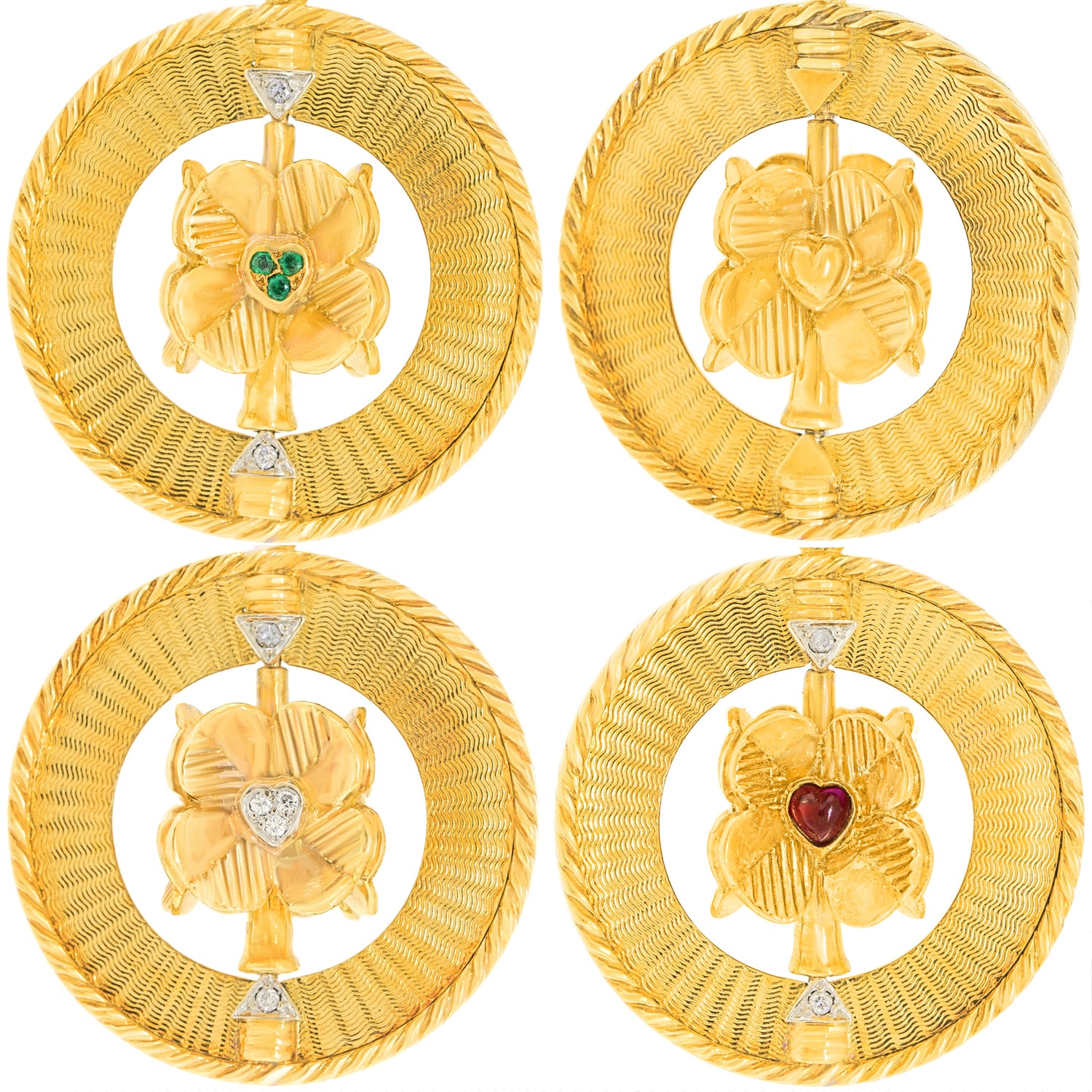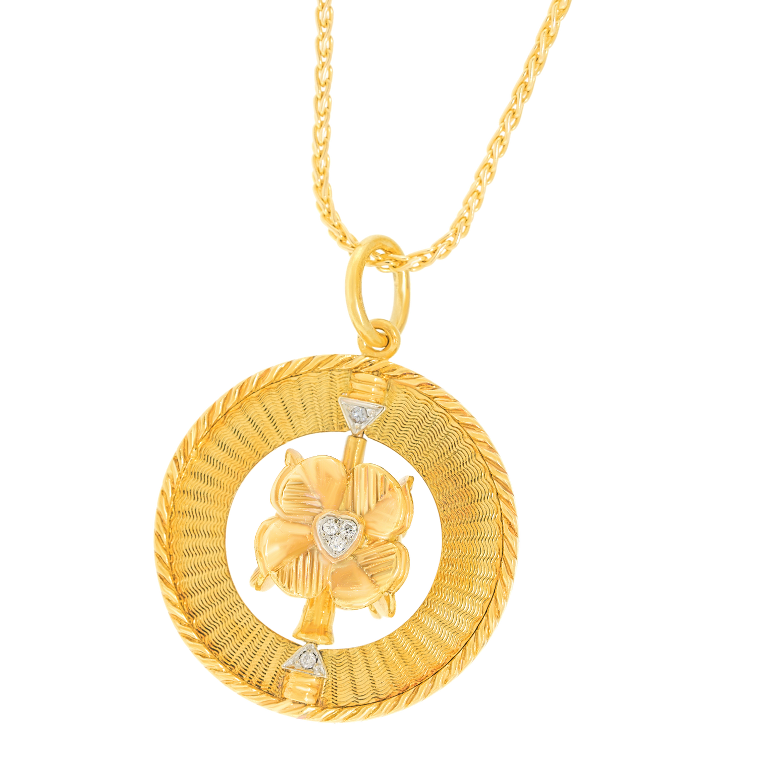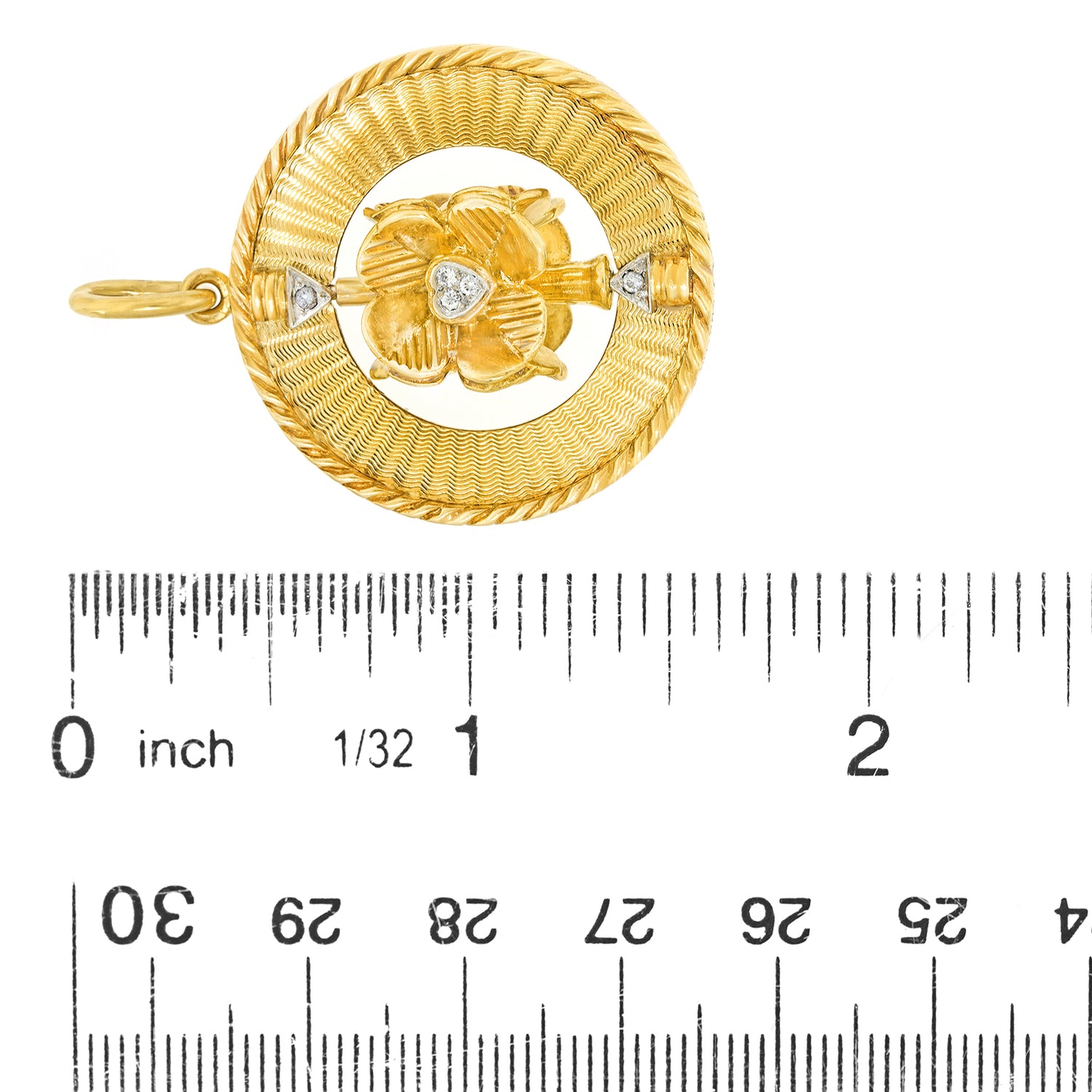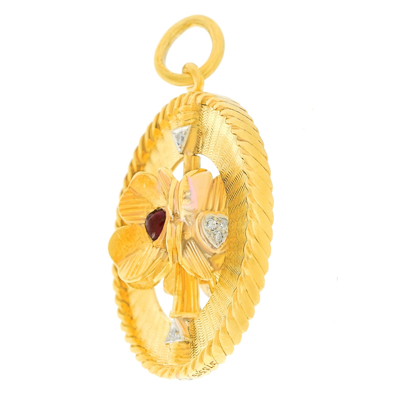 Circa 1950s, 18k, by Gubelin, Swiss. Perfect for a multiples look, this charming fifties pendant features a whimsical spinning flower motif set with a diamond, ruby, and emerald. Beautifully made, this superb quality pendant, by the renown Swiss firm Gubelin, is in excellent condition.