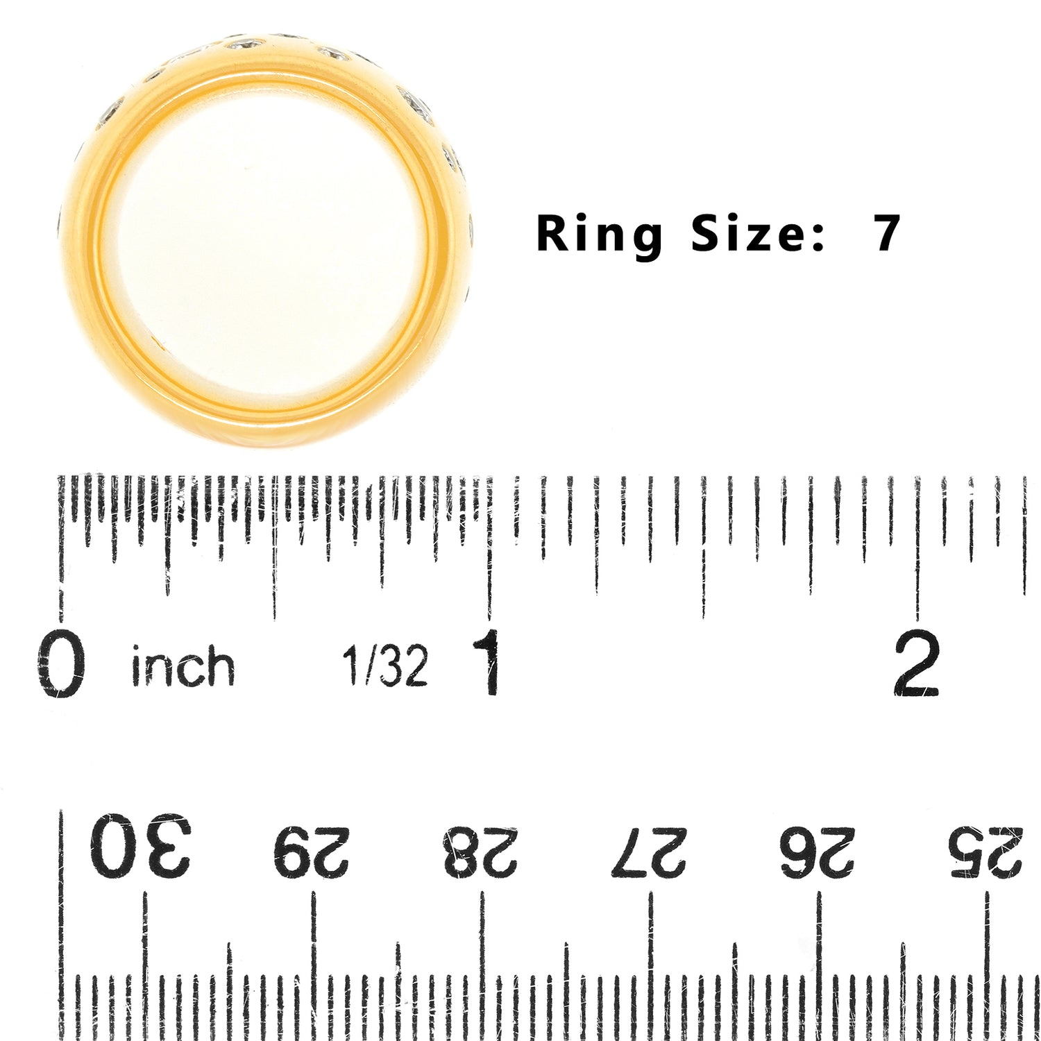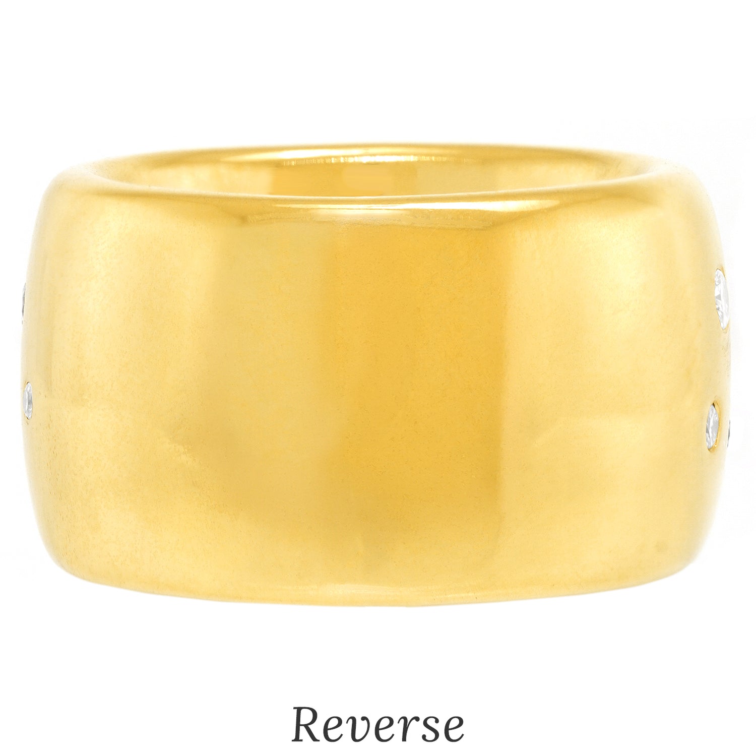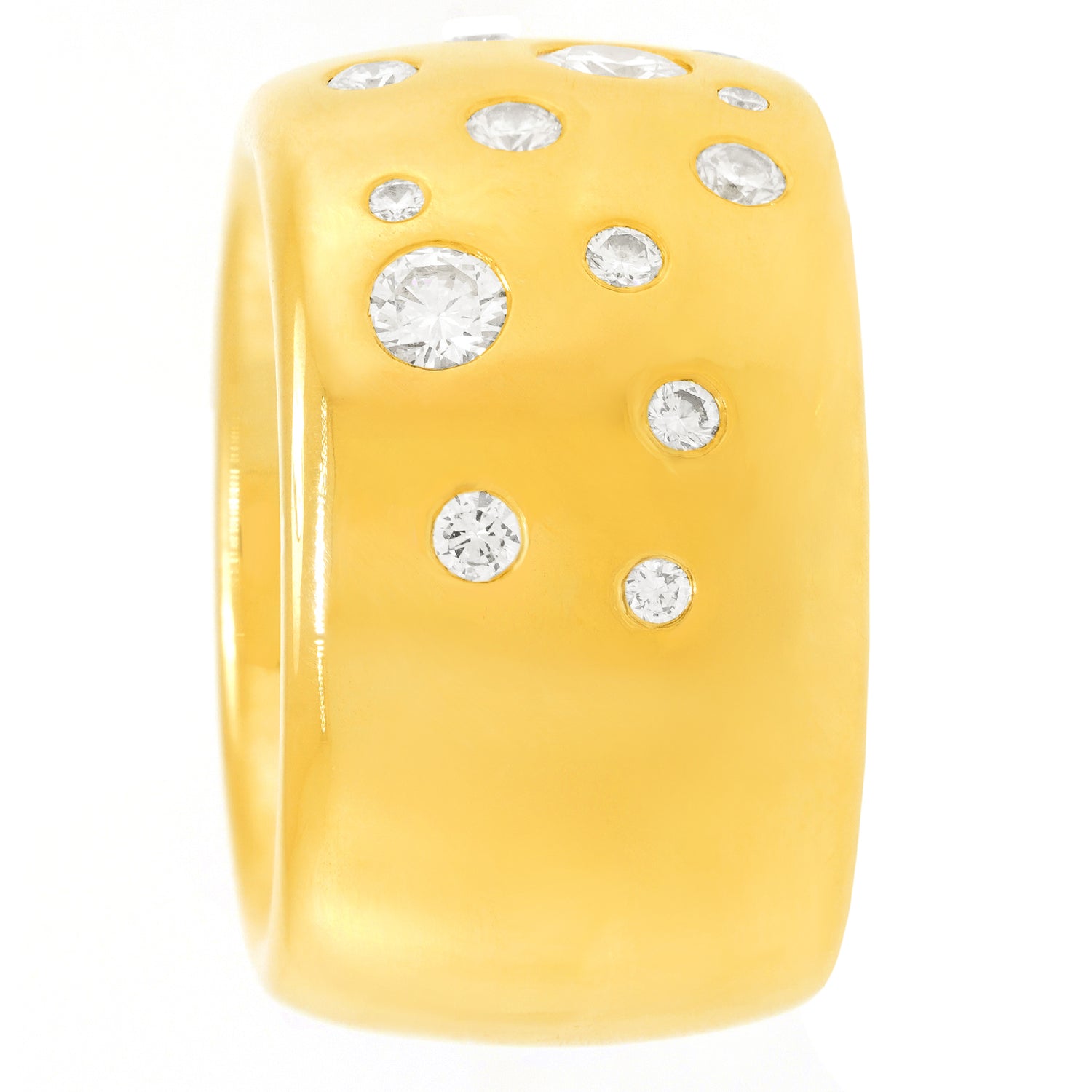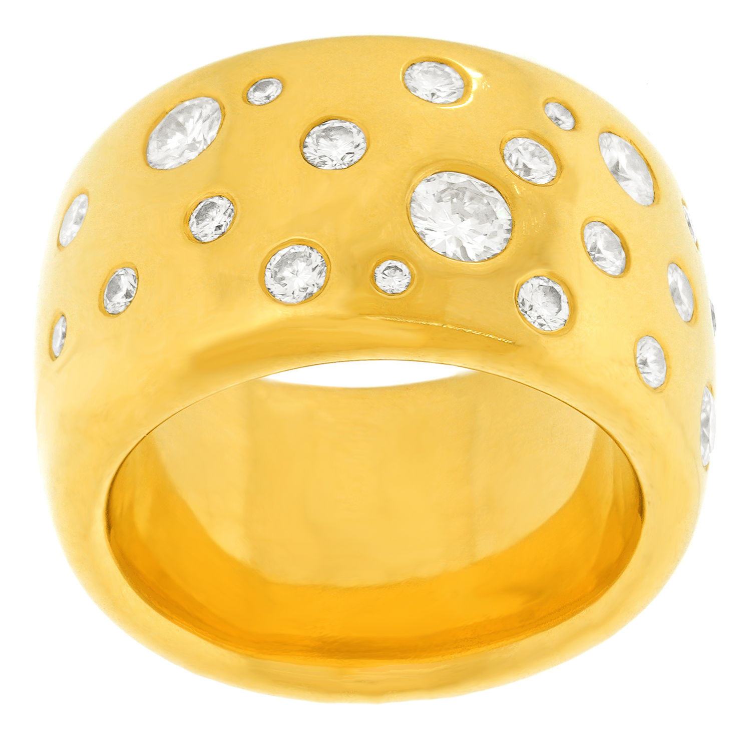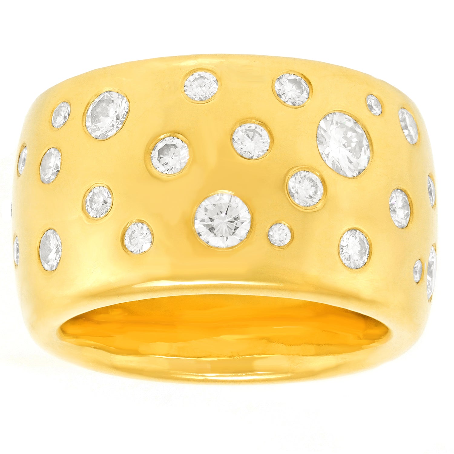 Circa 1990s, 18k, Swiss. This stunning contemporary nineties-style ring features brightly polished yellow gold sprinkled with 1.55 carats of brilliant white diamonds (G color, VS clarity). Perfect for everyday, the look is sleek, bold, and very chic. Excellent condition.