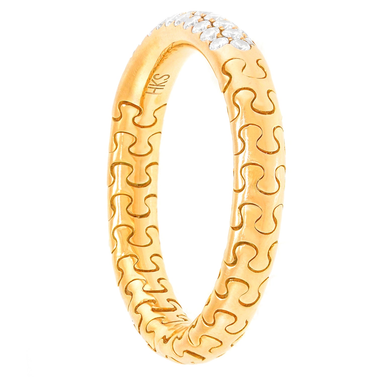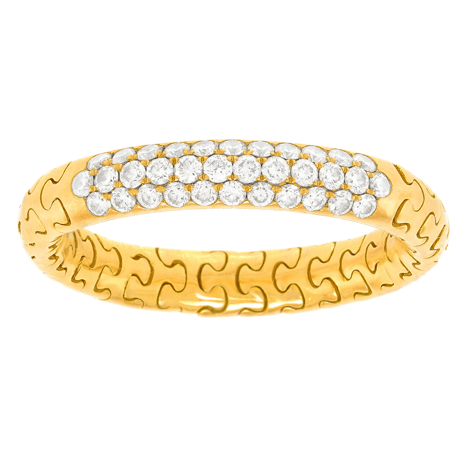 Circa 1970s, 18k, Swiss. This ring embodies everyday ease. With a flash of diamonds set in 18k gold, its slightly flexible design is very comfortable to wear. Perfect on its own, or wonderful in a stack, this Swiss jewel is in excellent condition.
