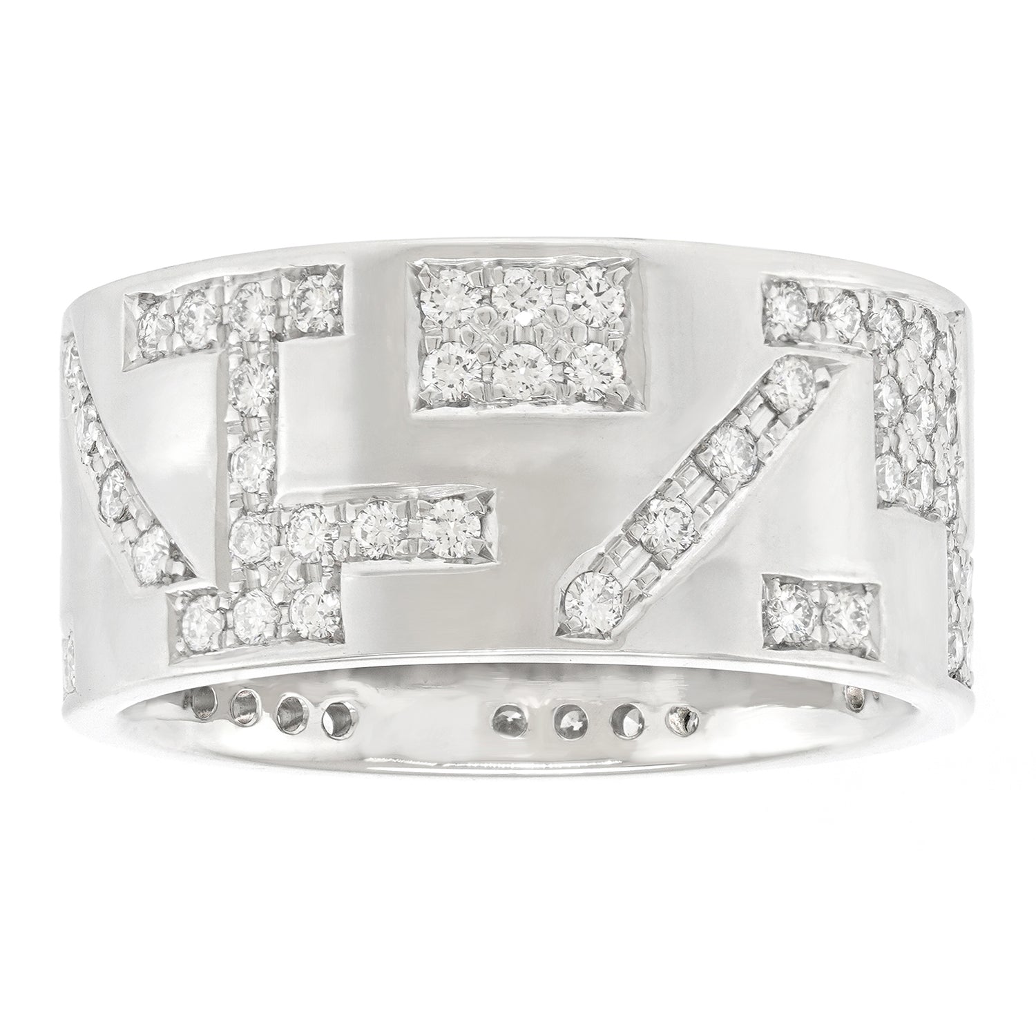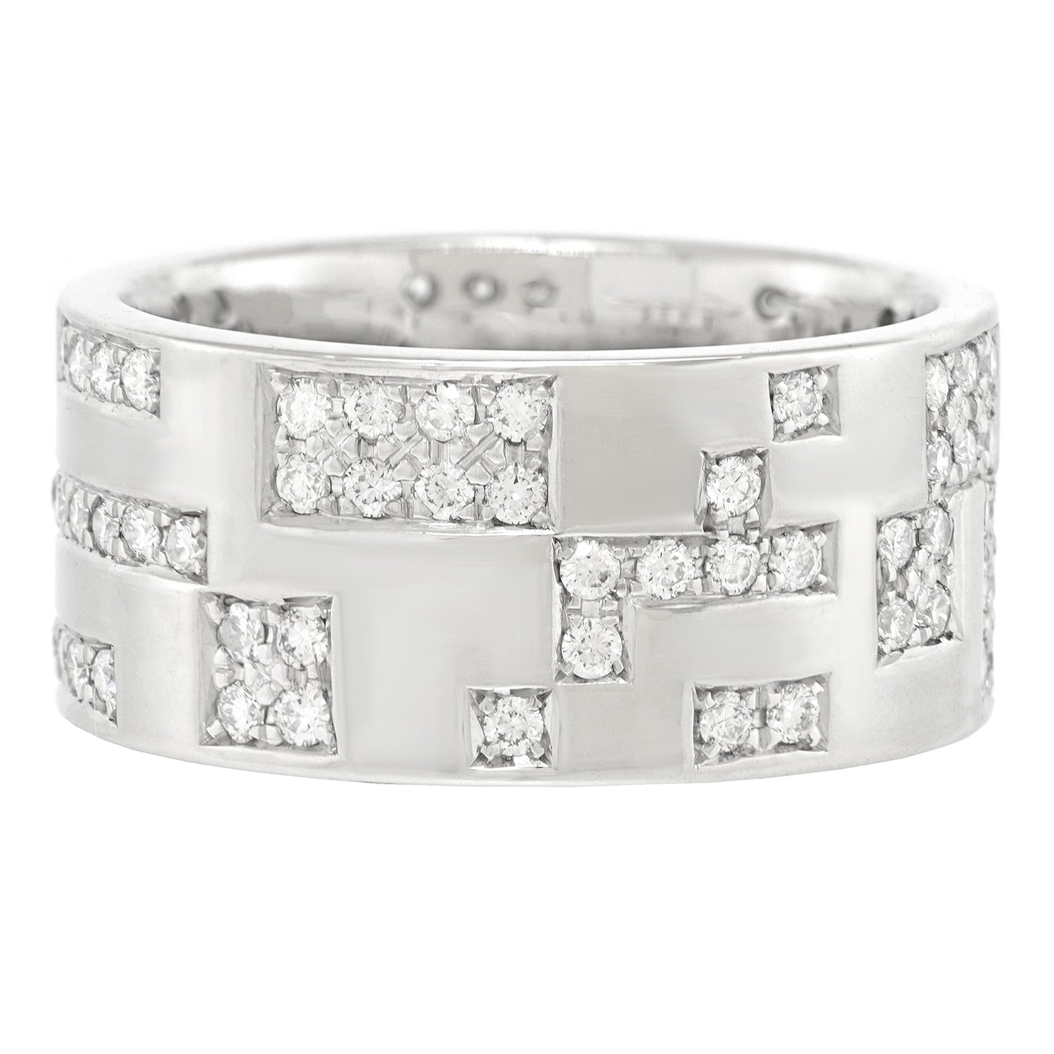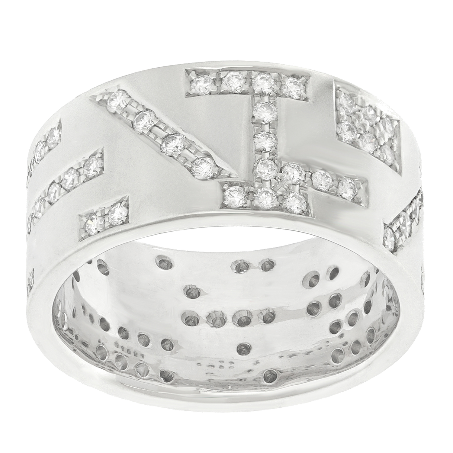 Circa 1990s, Platinum, by Killer & Co., Solothurn, Switzerland. This cool modernist diamond ring radiates glamour. Underscored by 1.0 carat of brilliant white diamonds (G color and VS clarity) set in mystic runes, the look is everyday luxury on steroids, …we always say yes to diamonds! Fine fabrication in platinum and meticulous attention to detail completes the visual narrative. Excellent condition.