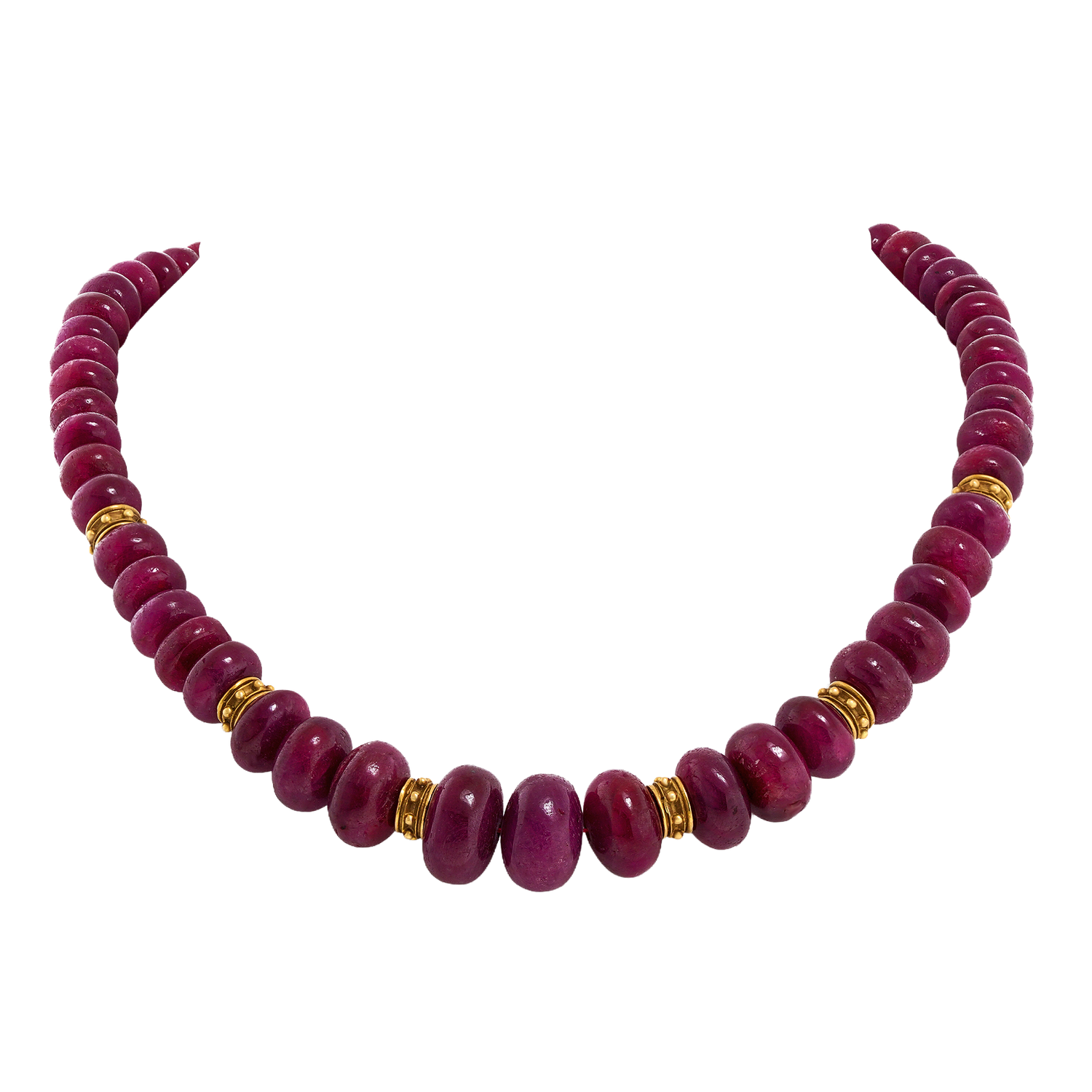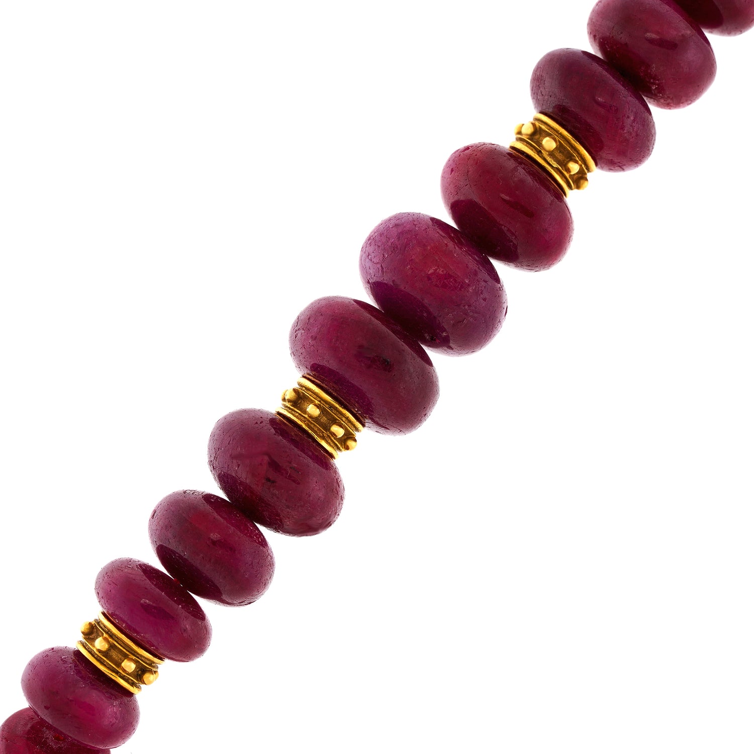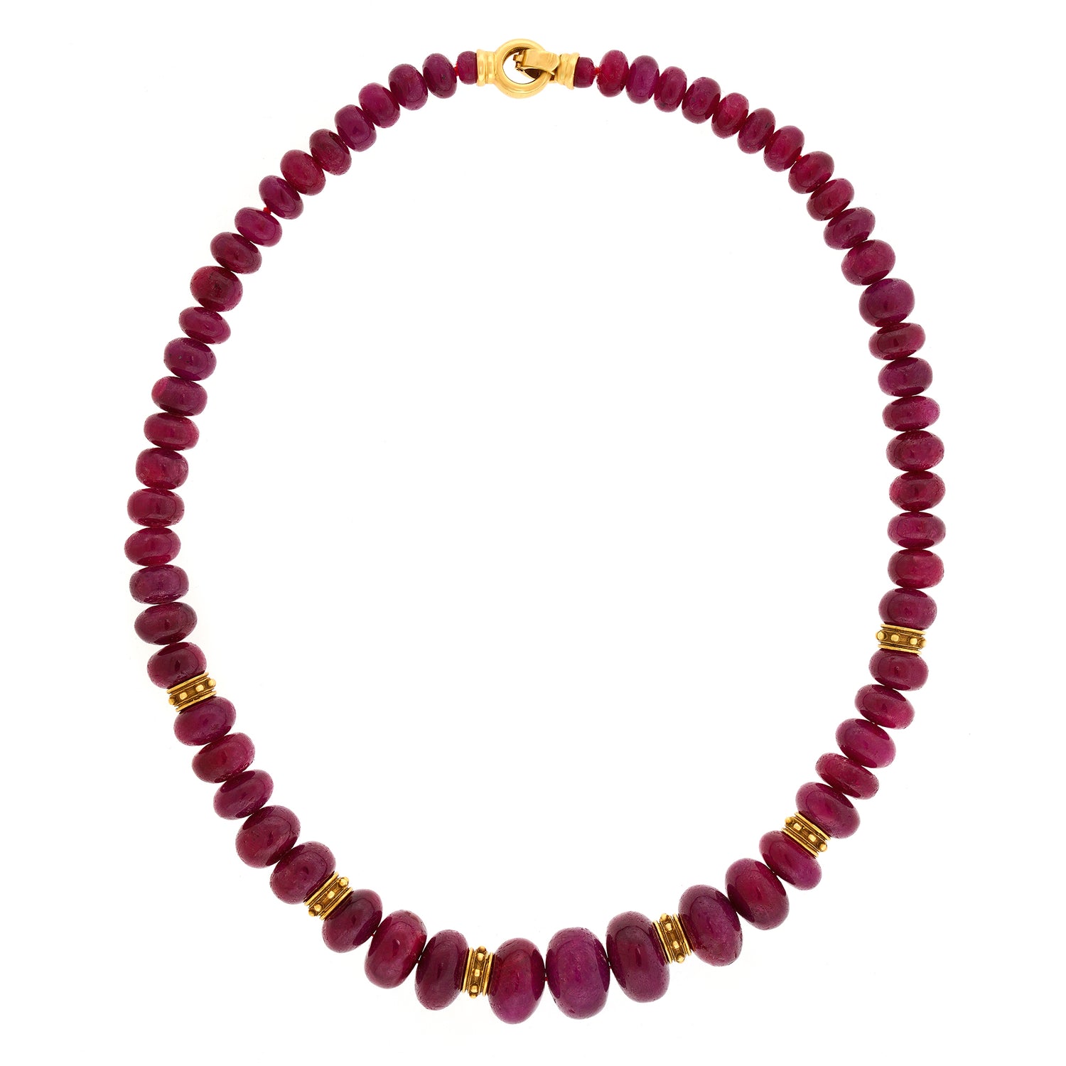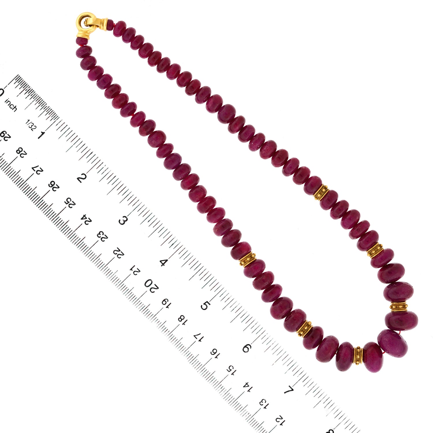 Circa 1960s, 18k, Swiss. Extra large with beautiful color, this ruby strand is lovely. Perfect for a pop of color or layered with other necklaces, especially gold. Excellent condition.
