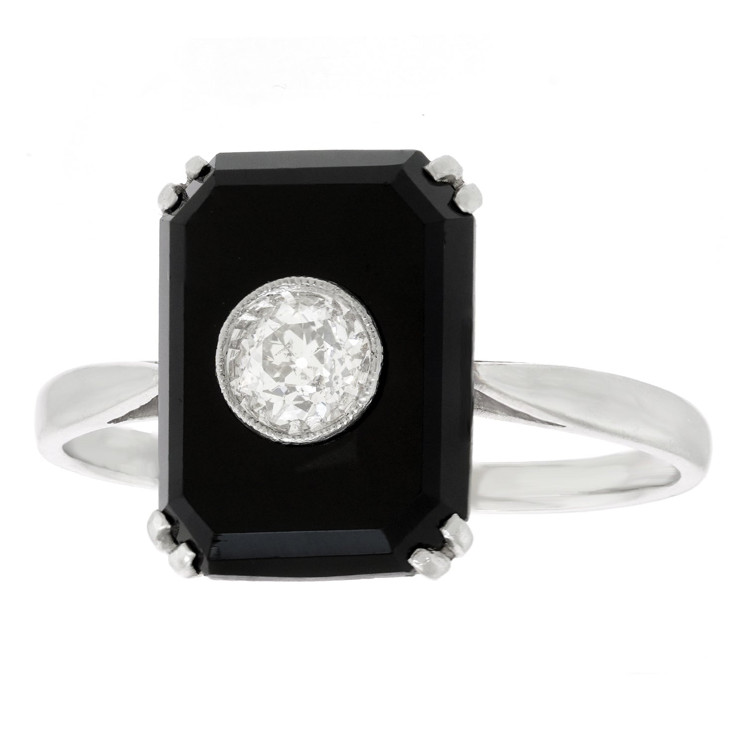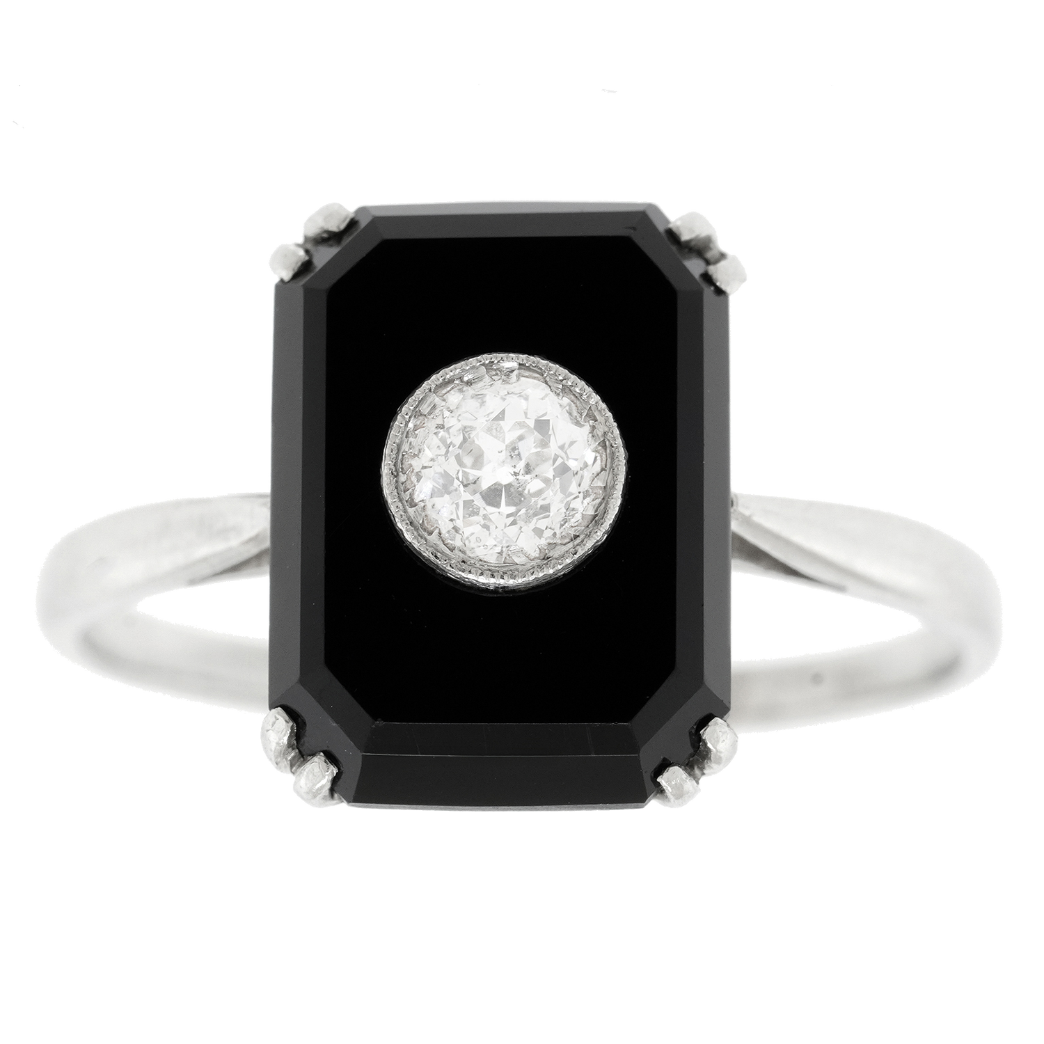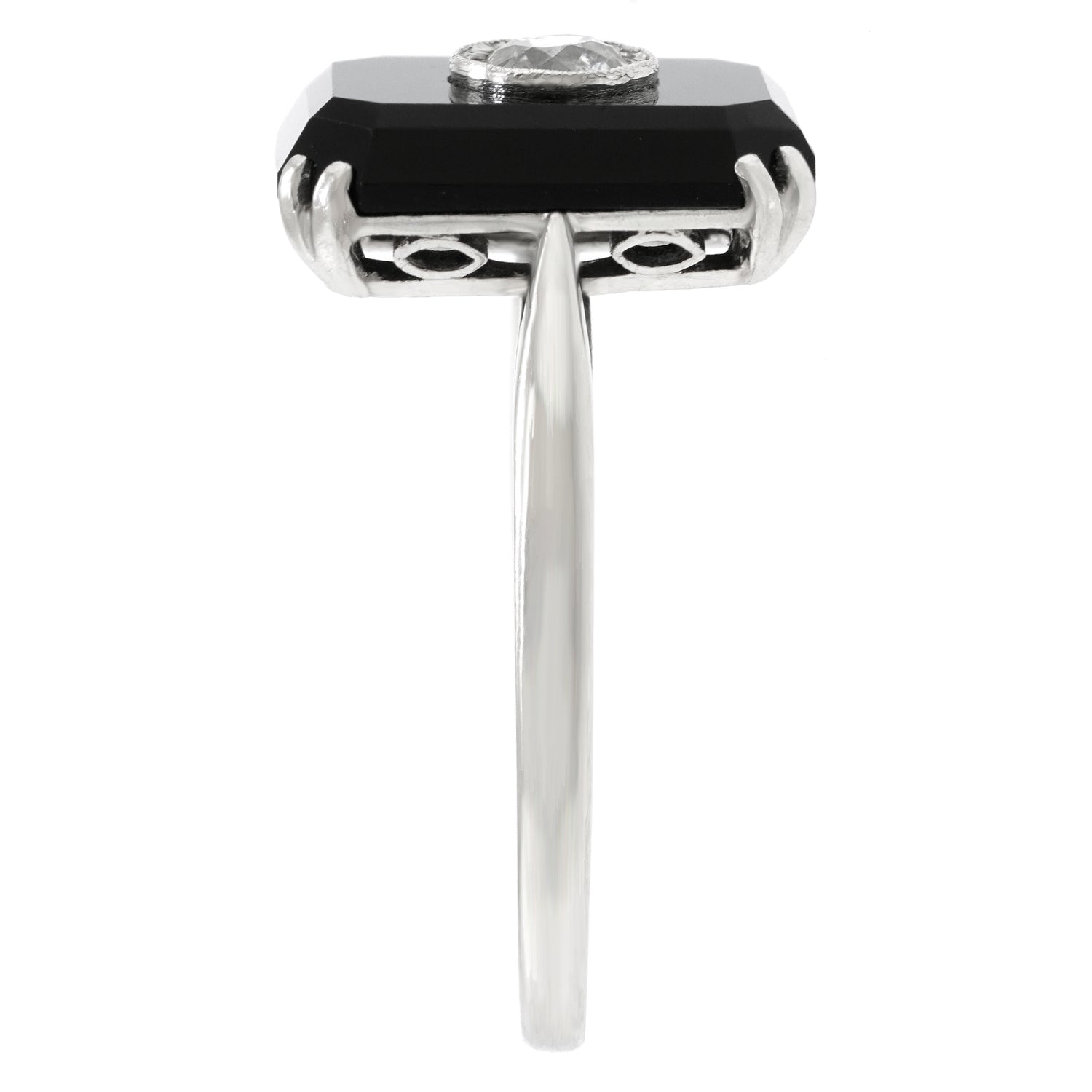 Circa 1920s, Platinum, France. This confidently chic Arts Decoratifs ring stylishly incorporates the ground-breaking black and white fashion of the twenties for an exceptionally fresh au courant look. From its architectural geometry to the contrasting color palette, this Deco jewel has a strikingly graphic appearance. Finely fabricated, its sparkly .28 carat diamond (I color, SI2 clarity) is set in black onyx. Easily dressed up or down, this elegant French ring is in excellent condition.