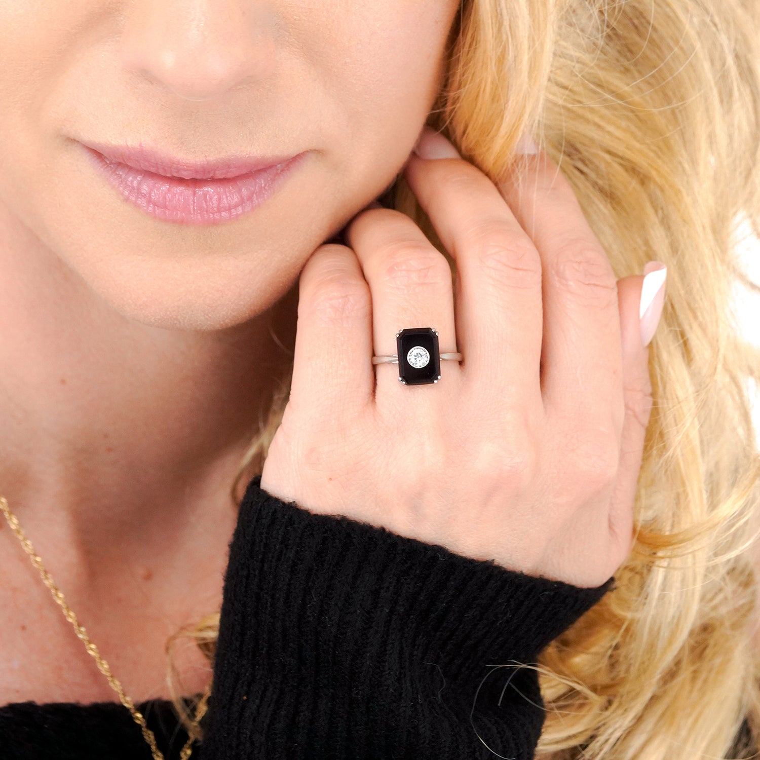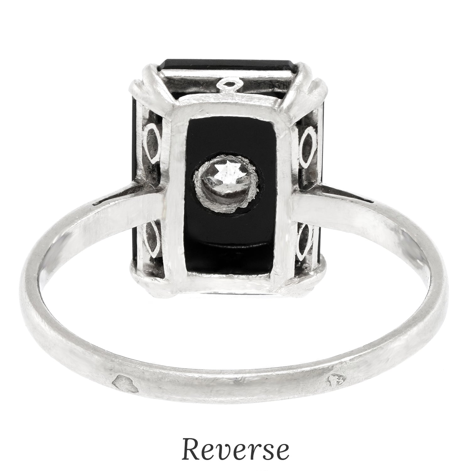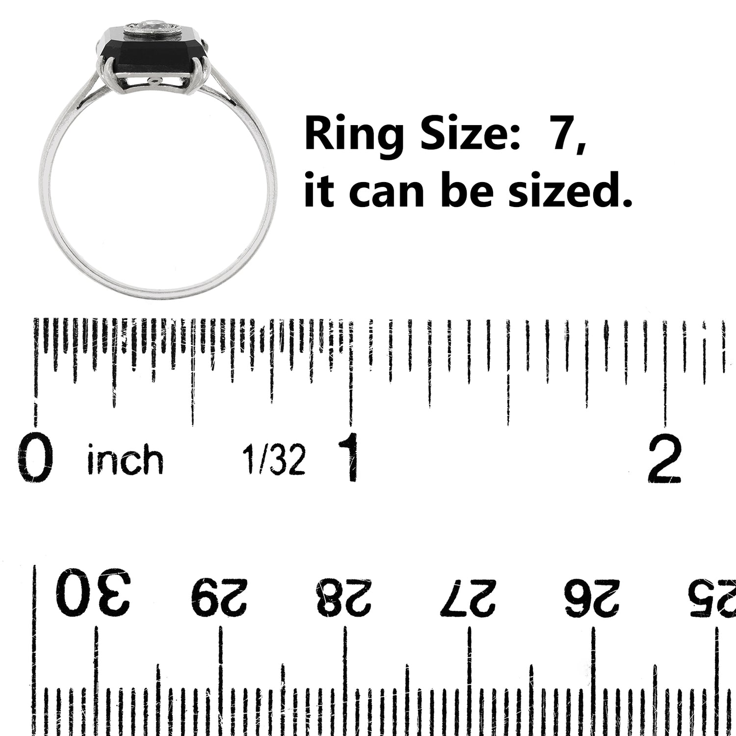 Circa 1920s, Platinum, France. This confidently chic Arts Decoratifs ring stylishly incorporates the ground-breaking black and white fashion of the twenties for an exceptionally fresh au courant look. From its architectural geometry to the contrasting color palette, this Deco jewel has a strikingly graphic appearance. Finely fabricated, its sparkly .28 carat diamond (I color, SI2 clarity) is set in black onyx. Easily dressed up or down, this elegant French ring is in excellent condition.