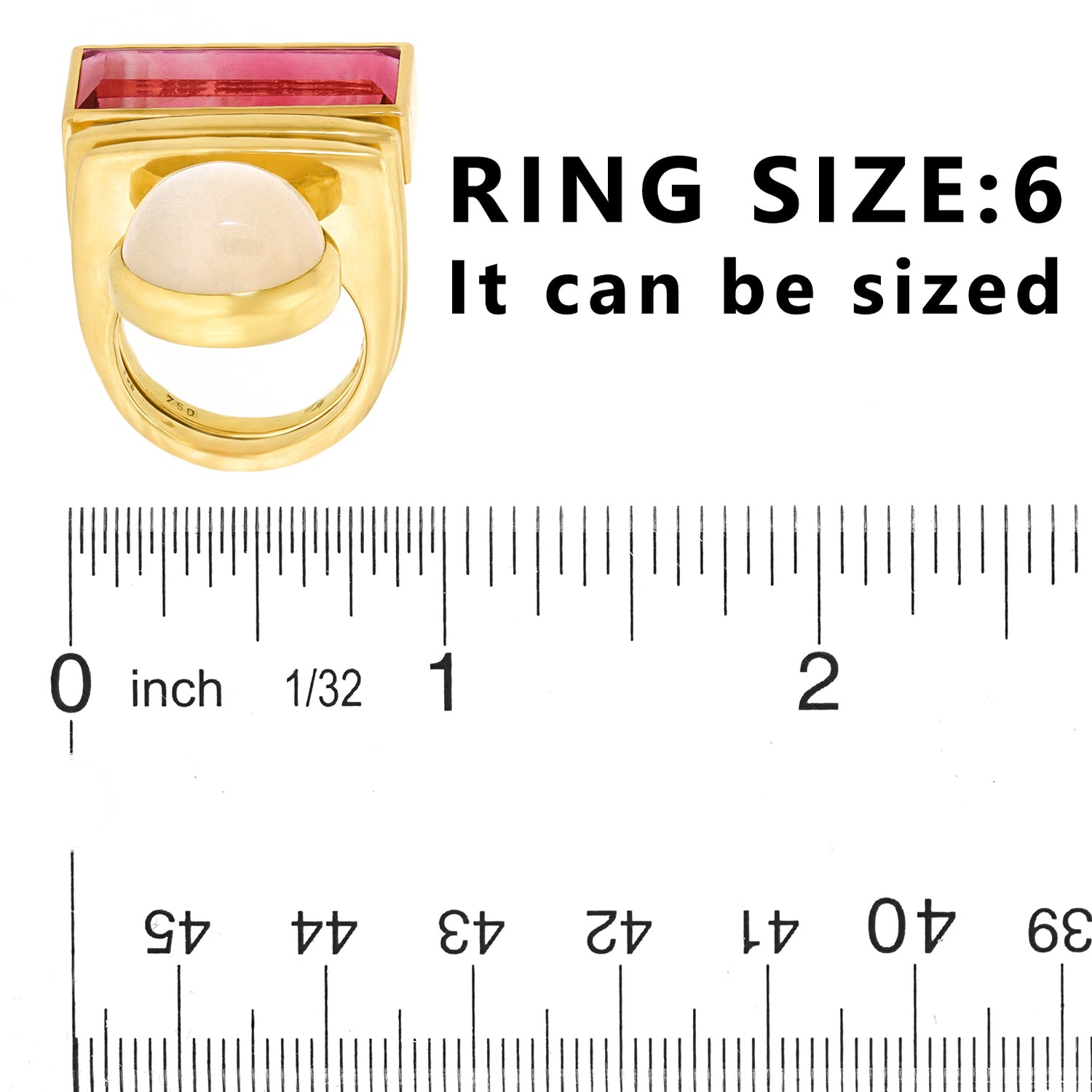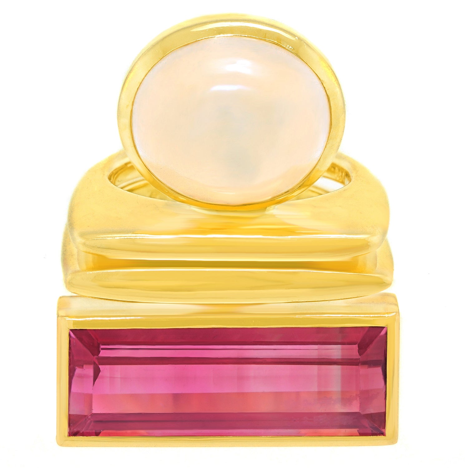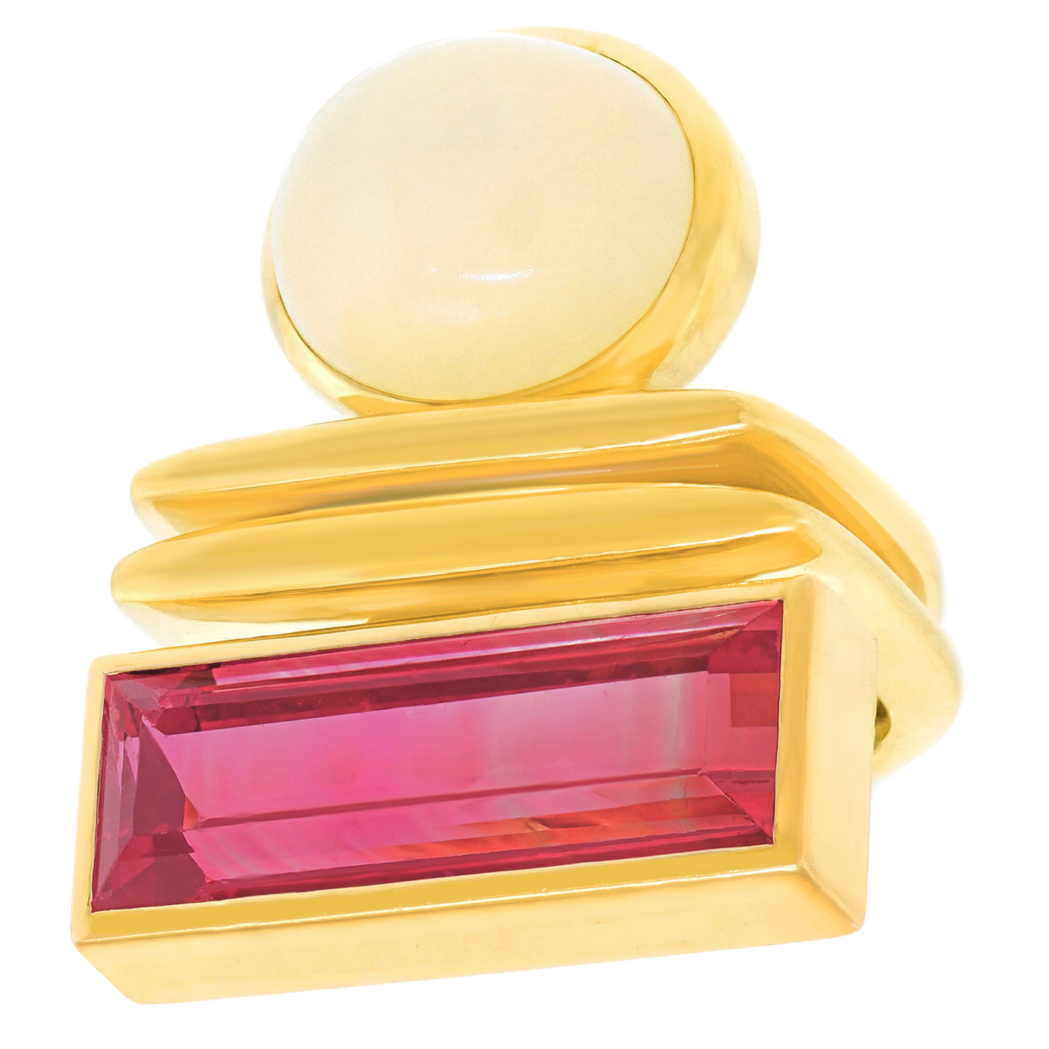 Circa 1960s, 18k, Switzerland. This ring is a beautiful example of Swiss Modern sixties style. Elegantly balanced, the two-ring design is just plain cool! A 12.0-carat pink tourmaline and a 9.5-carat moonstone are the soul of this jewel. Flawlessly fabricated, this is a refined example of post-modern design. Excellent condition.