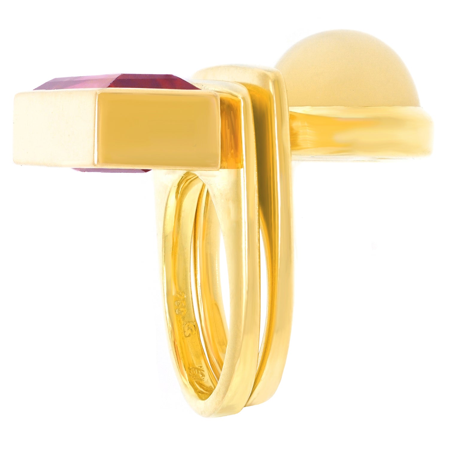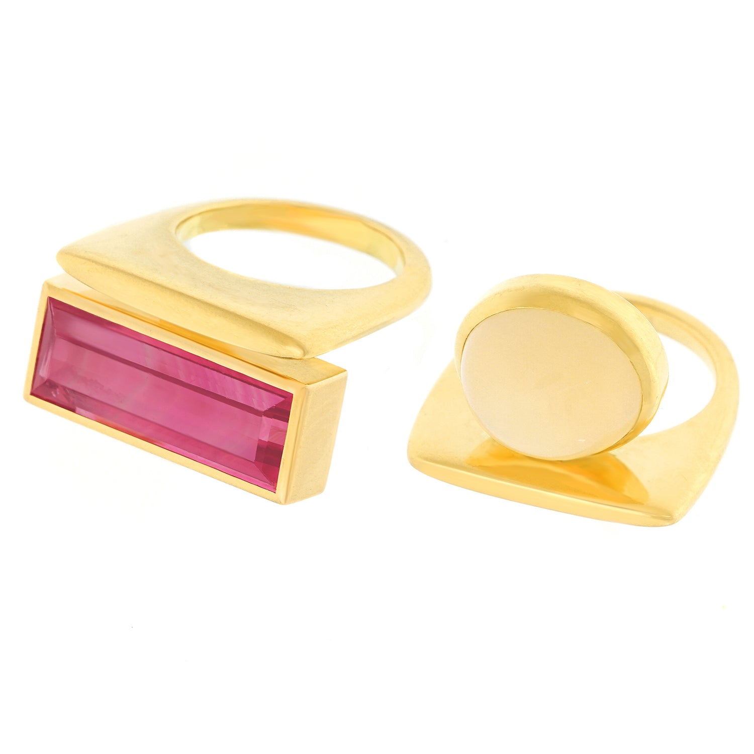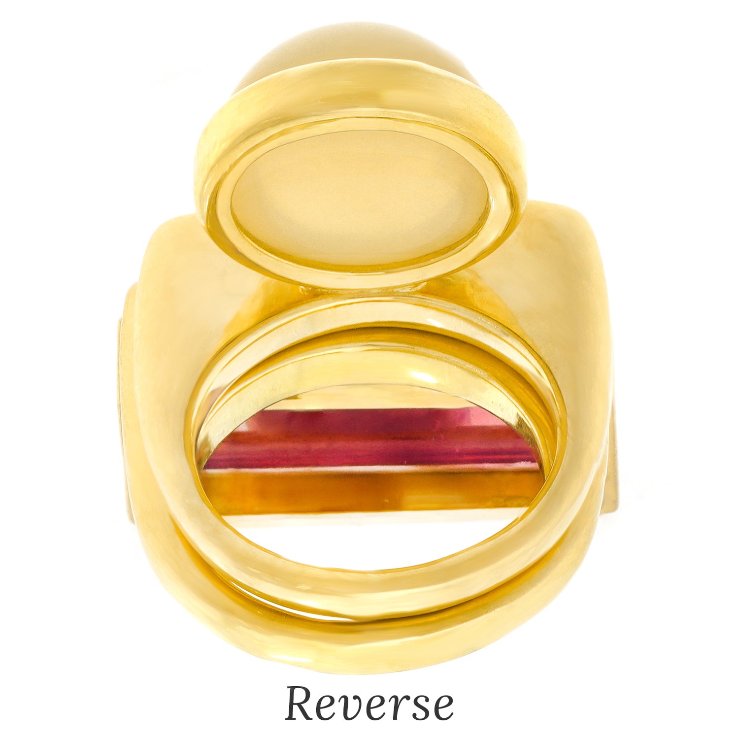 Circa 1960s, 18k, Switzerland. This ring is a beautiful example of Swiss Modern sixties style. Elegantly balanced, the two-ring design is just plain cool! A 12.0-carat pink tourmaline and a 9.5-carat moonstone are the soul of this jewel. Flawlessly fabricated, this is a refined example of post-modern design. Excellent condition.