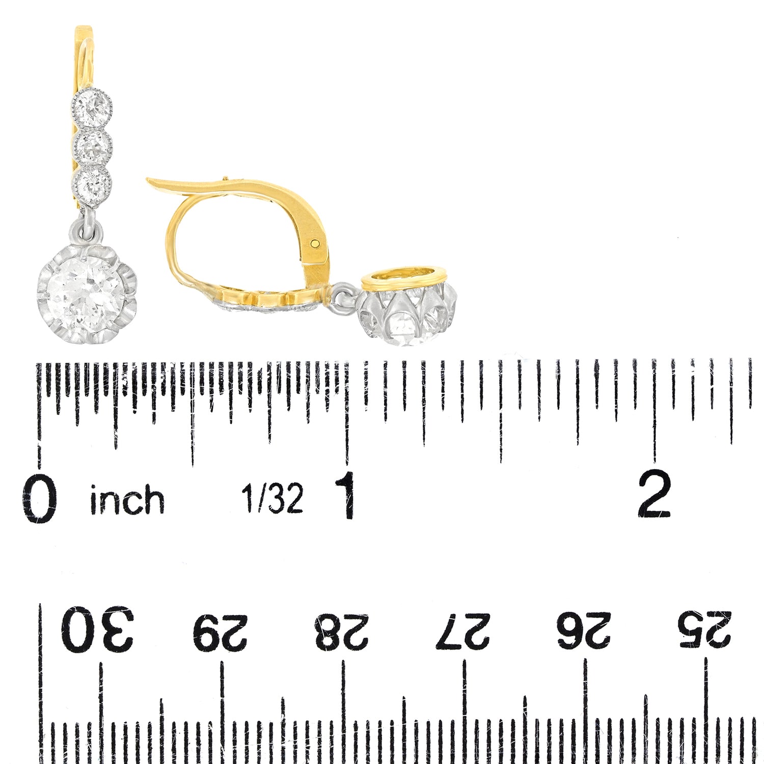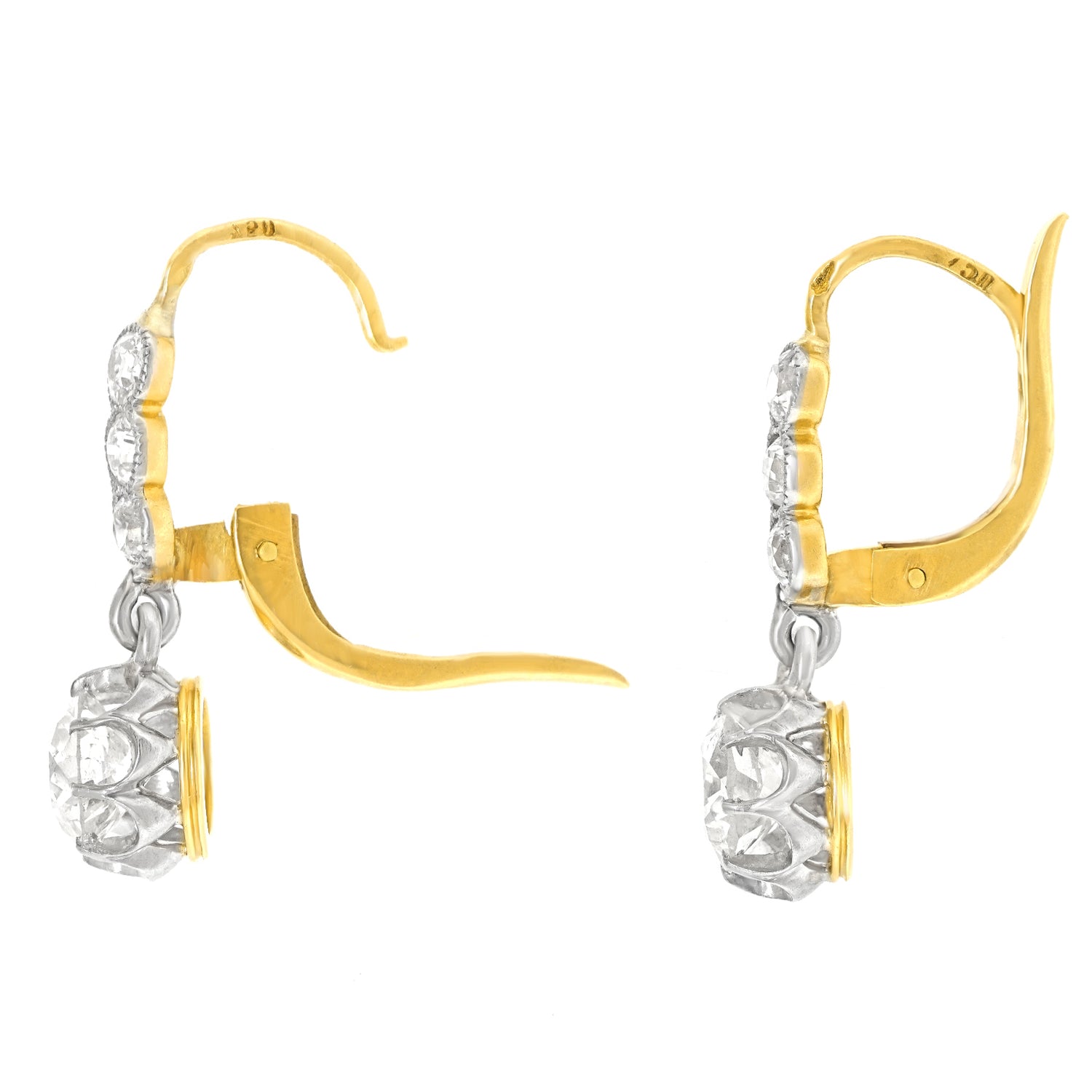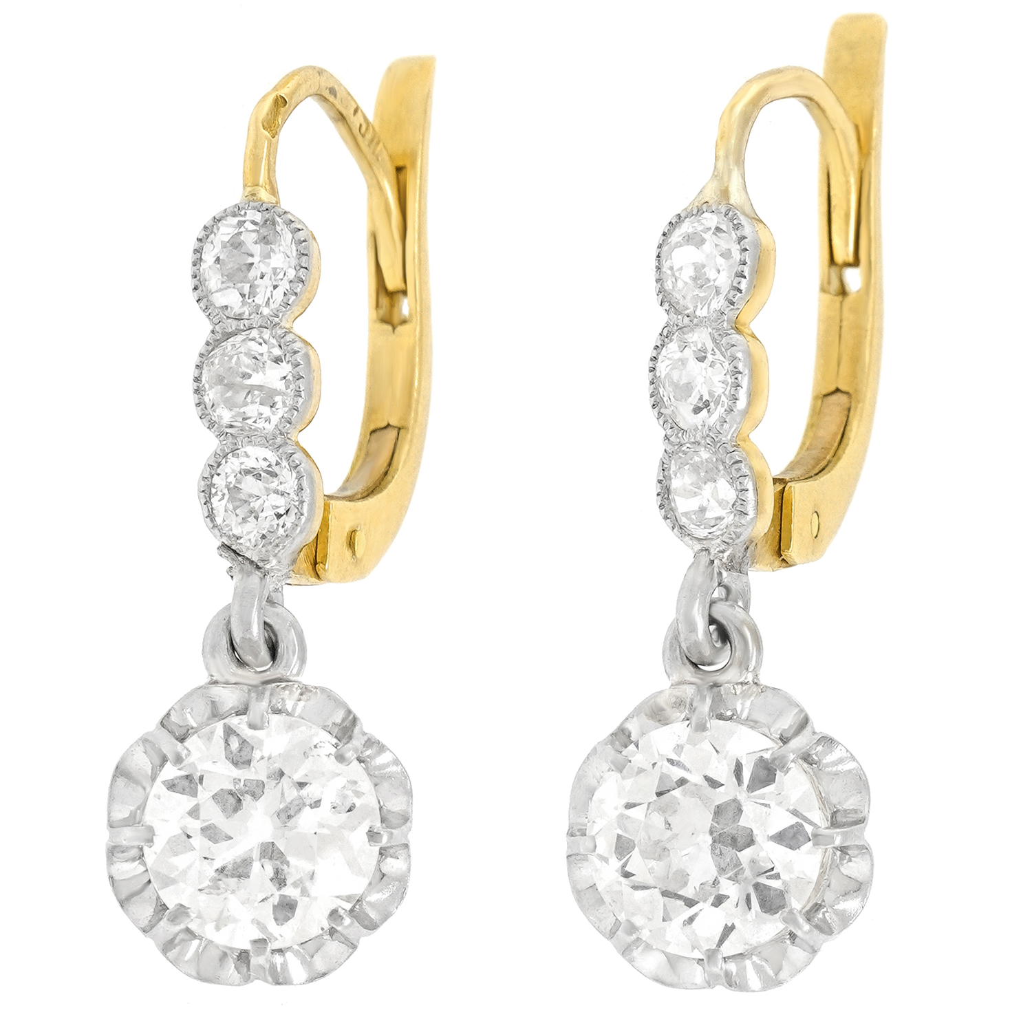 Circa 1920s, 18k and Platinum, France. The two brilliant white .95 carat diamonds make this pair of antique earrings very special. It is rare to find fine quality antique diamonds (H-G color and SI1 clarity) in their original mountings. With a demure drop, playful movement, and a classic design, the look is stunning. Masterful platinum and eighteen-karat gold construction and a total carat weight of 2.54 cttw complete the picture. Excellent condition.
