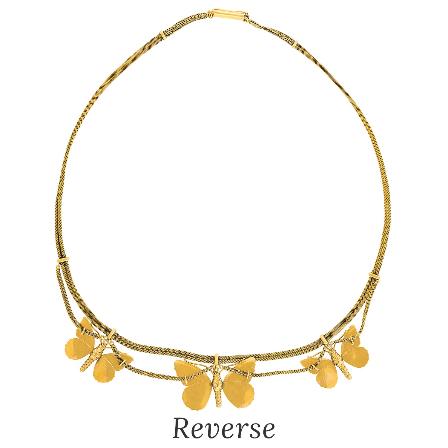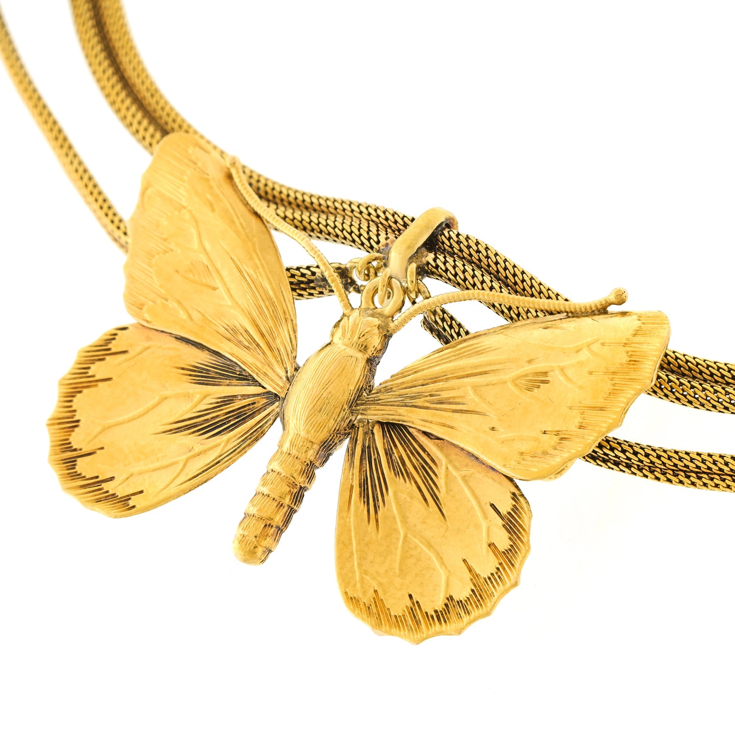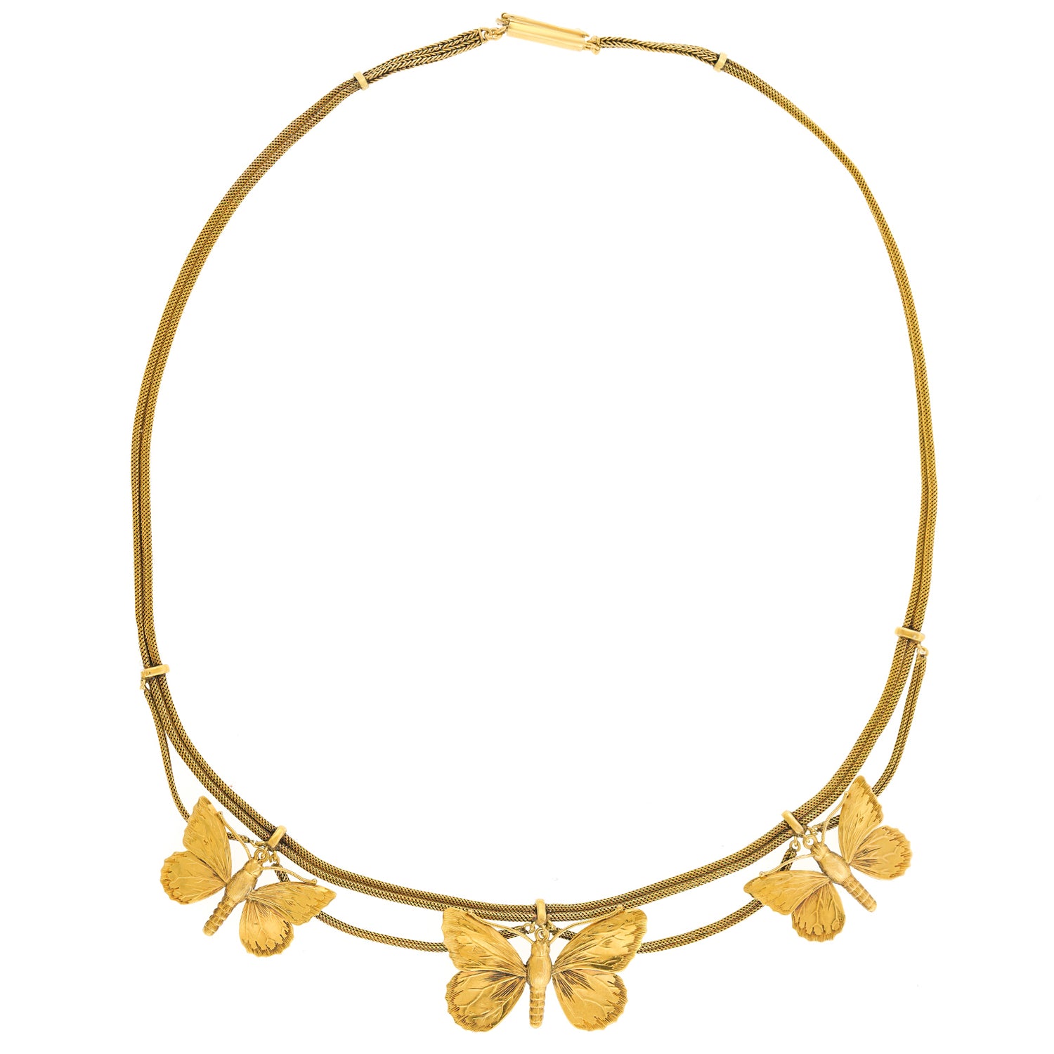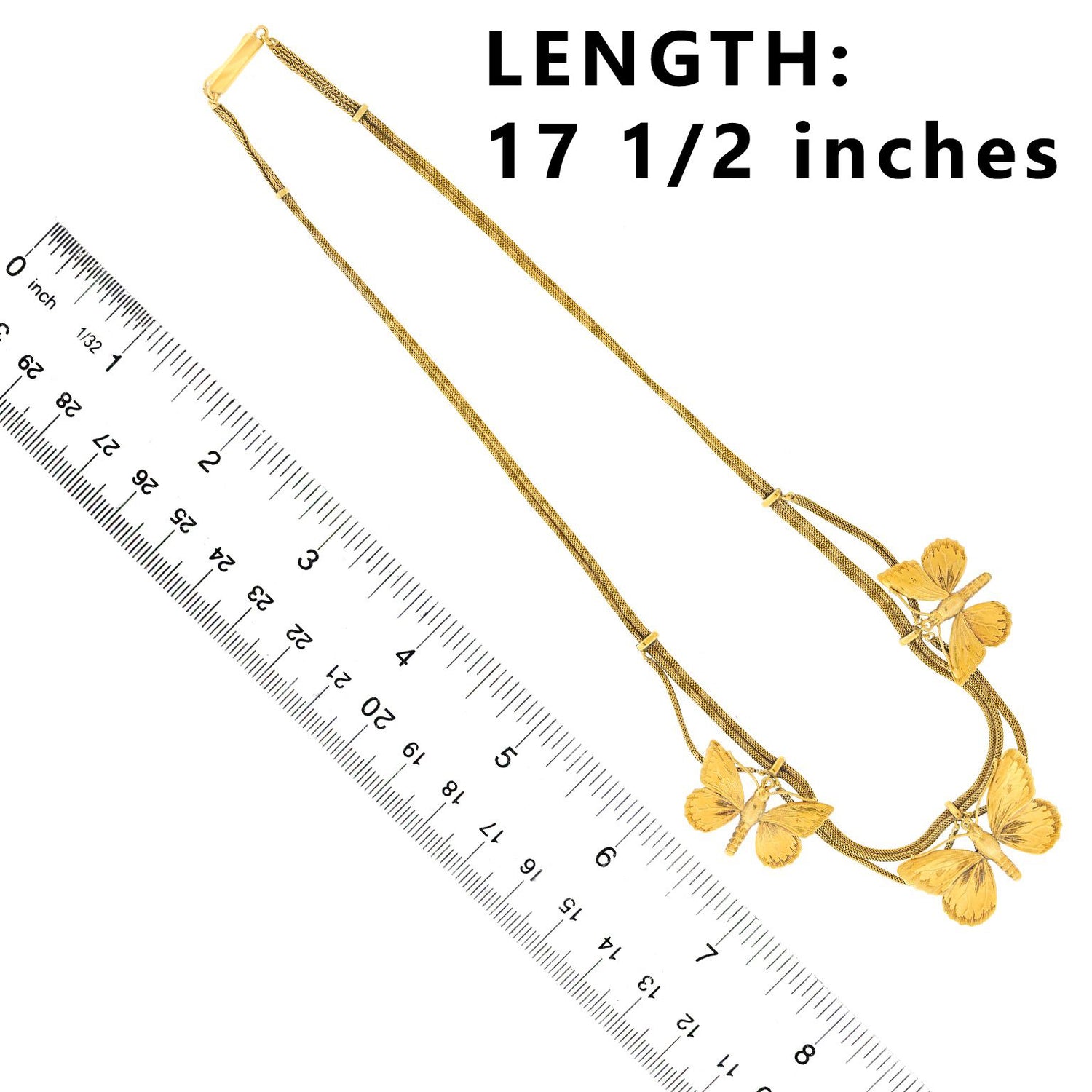 Circa 1880s, 18k, French Import hallmarks. This charming Victorian necklace features a delicate Japonaise aesthetic butterfly motif in 18k gold. Its antique chic look effortlessly dresses up or down. Delicately fabricated and brilliantly designed, it is in excellent condition.