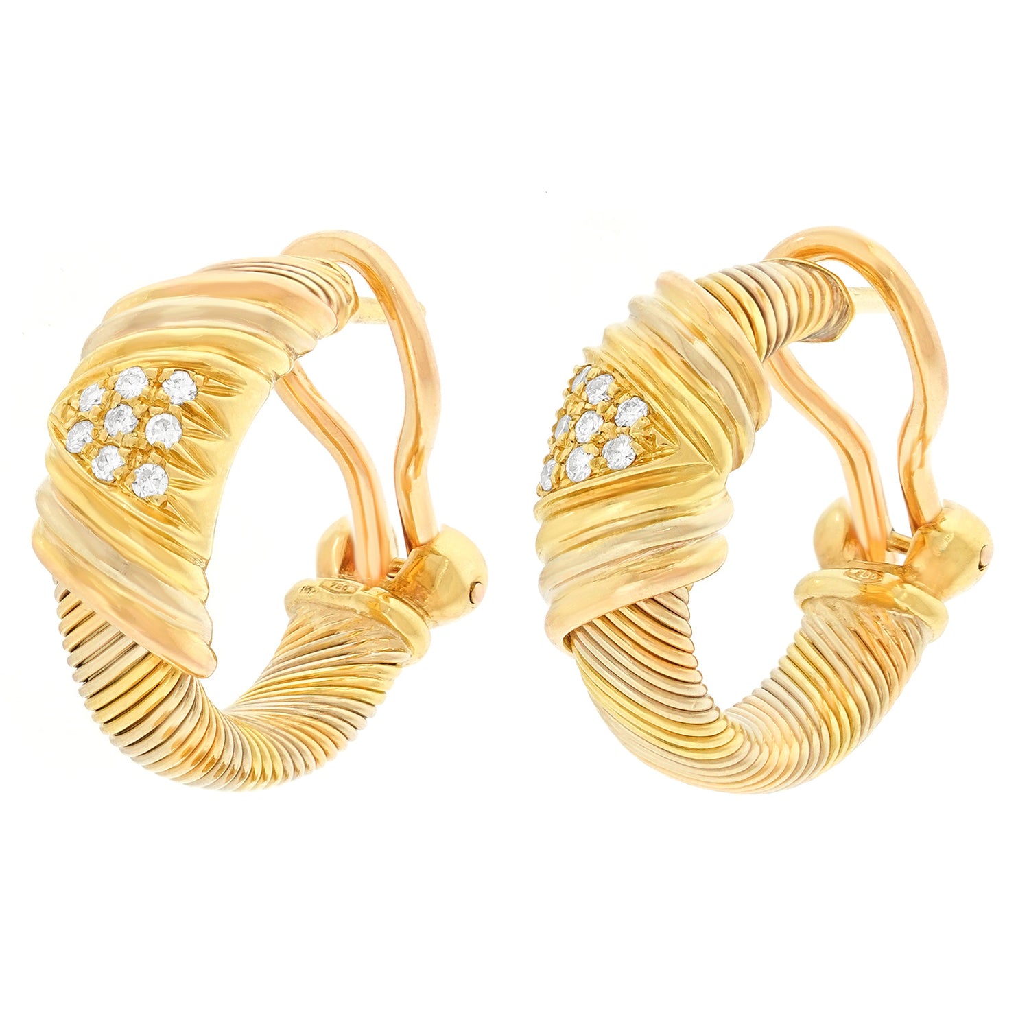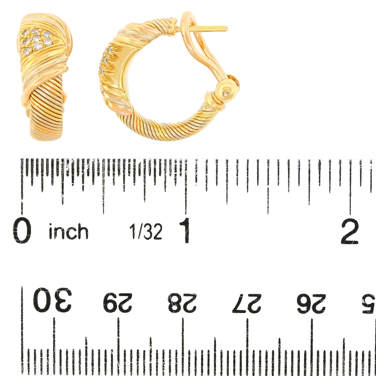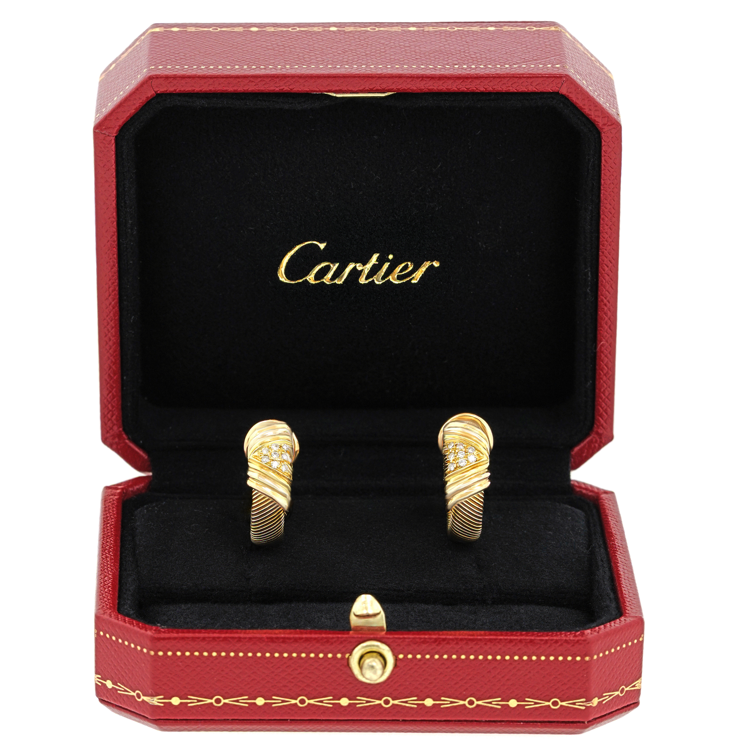 Circa 1980s, 18k, by Cartier. These diamond set Cartier hoop earrings with their iconic Trinity accents are impeccably chic. Redolent of everyday luxury, they transition flawlessly from day to evening. Set with .15 carats of superb diamonds and meticulously fabricated with the fine quality we expect from Cartier, these earrings come in an original Cartier box. Excellent condition.