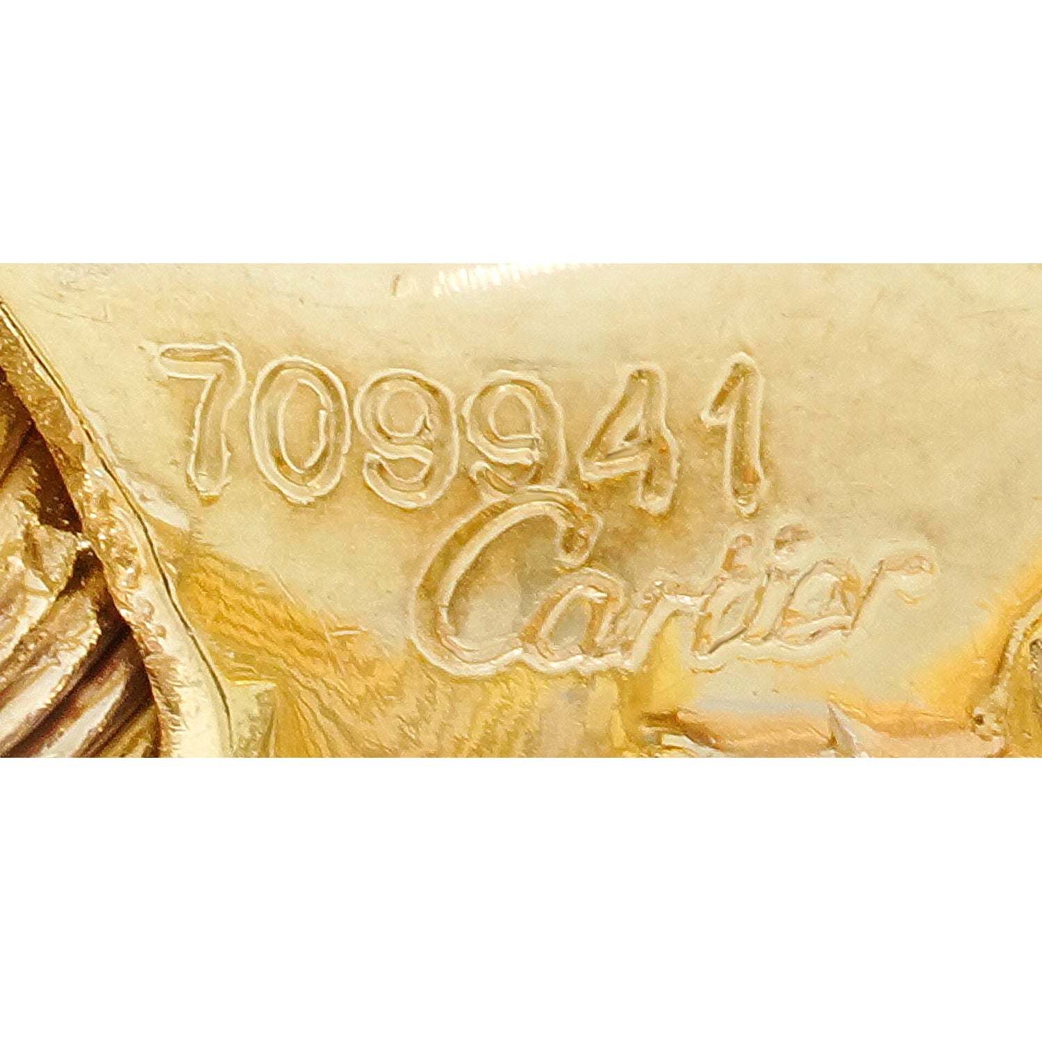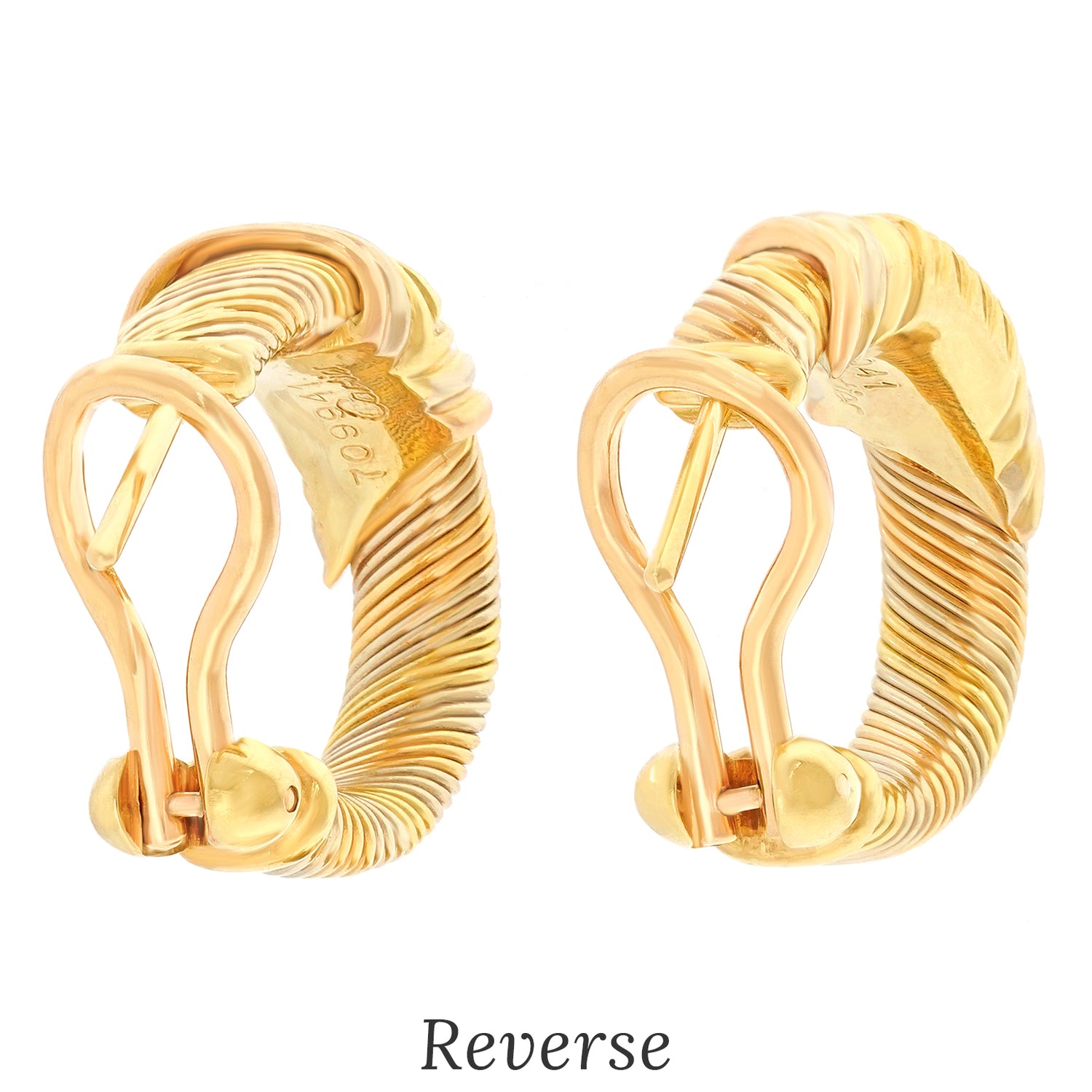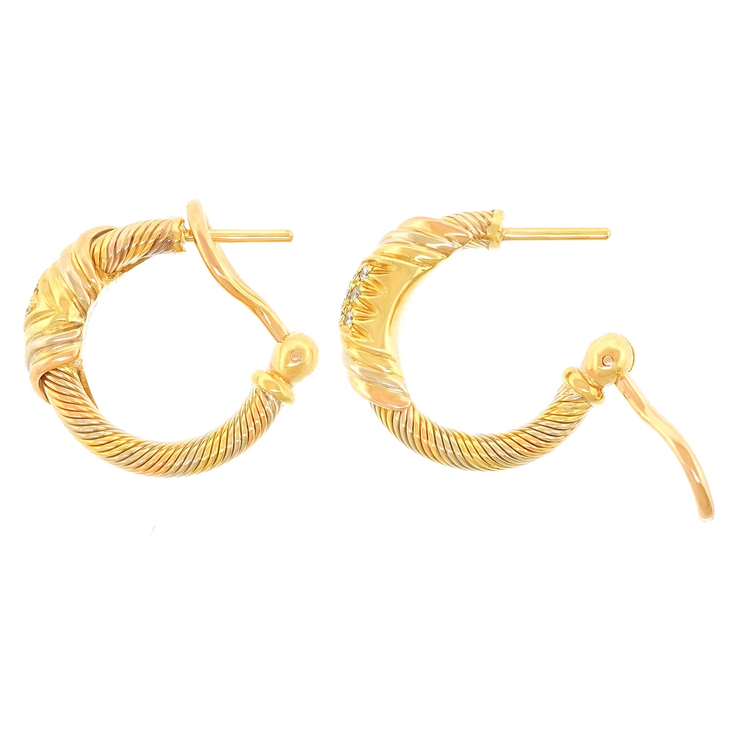 Circa 1980s, 18k, by Cartier. These diamond set Cartier hoop earrings with their iconic Trinity accents are impeccably chic. Redolent of everyday luxury, they transition flawlessly from day to evening. Set with .15 carats of superb diamonds and meticulously fabricated with the fine quality we expect from Cartier, these earrings come in an original Cartier box. Excellent condition.