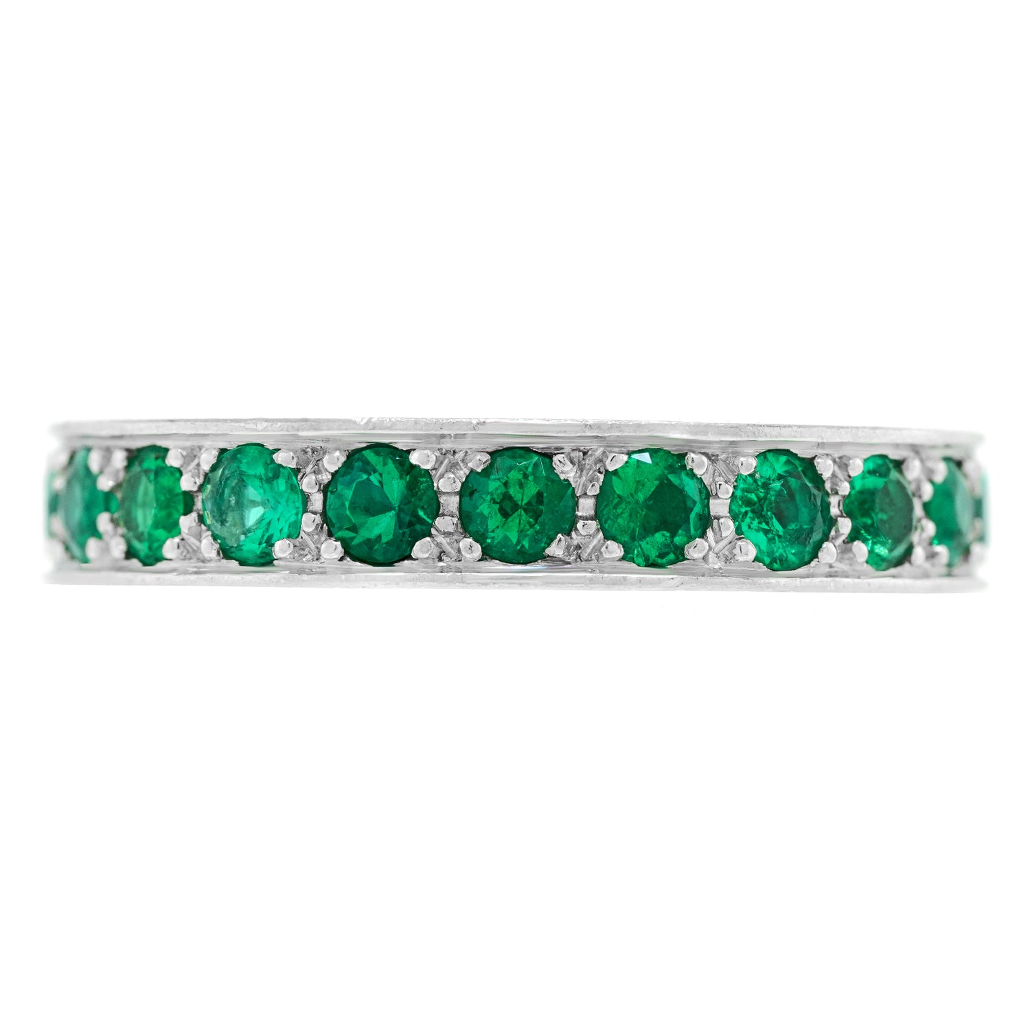 Circa 1980s, 18k, by Killer & Co., Solothurn Switzerland. This chic eternity band features 1.50 carats of lush green emeralds set in eighteen-karat white gold. The look is classic, vibrant, and playful. Today they can be stacking rings, back in the day these were called guard rings; Art Deco beauties would fan their fingers showing off their trophies. Elegantly designed and set with flawlessly matched stones, this ring is finely fabricated and in excellent condition.