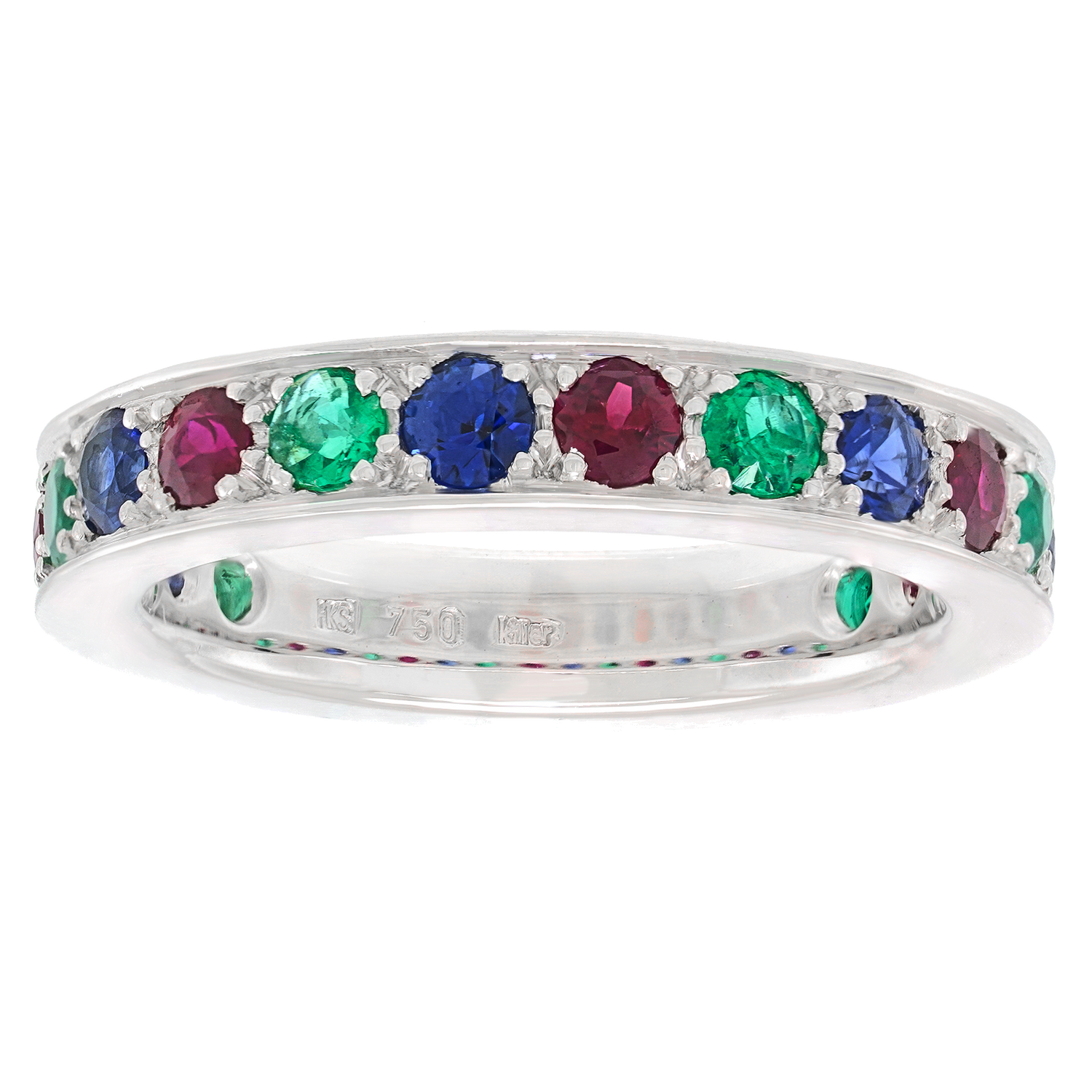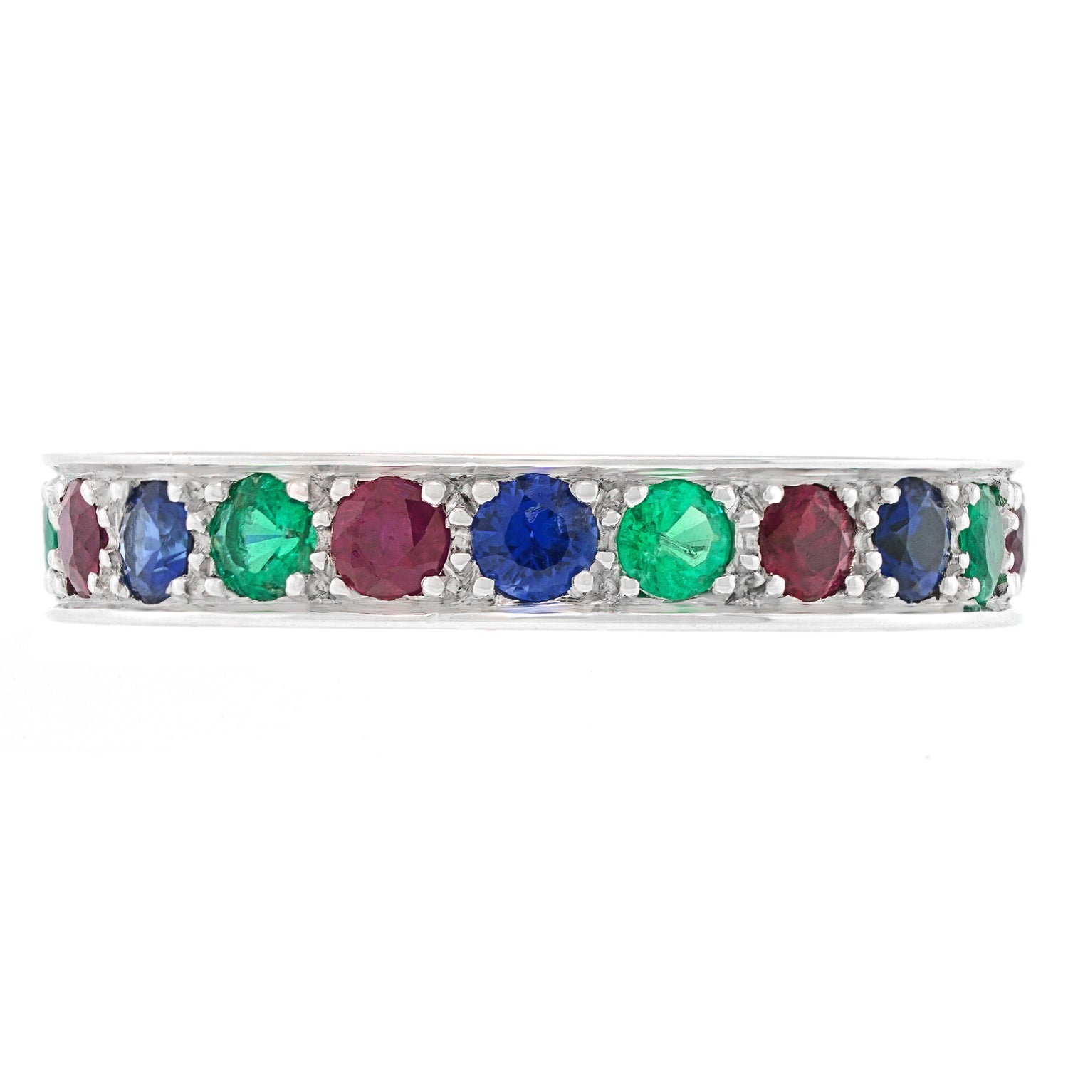 Circa 1980s, 18k, by Killer & Co., Solothurn, Switzerland. This chic stacking ring features .80 carats of rich blue sapphires, .80 carats of rubies, and .60 carats of lush green emeralds set in eighteen-karat white gold. The look is classic, vibrant, and playful. Back in the day, these were called guard rings; Art Deco beauties would fan their fingers showing off their trophies. Elegantly designed and set with flawlessly matched stones, this ring is finely fabricated and in excellent condition.