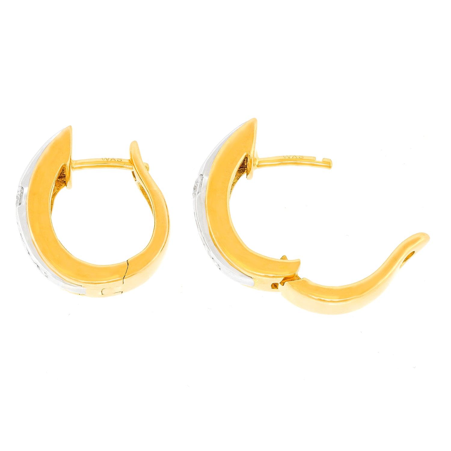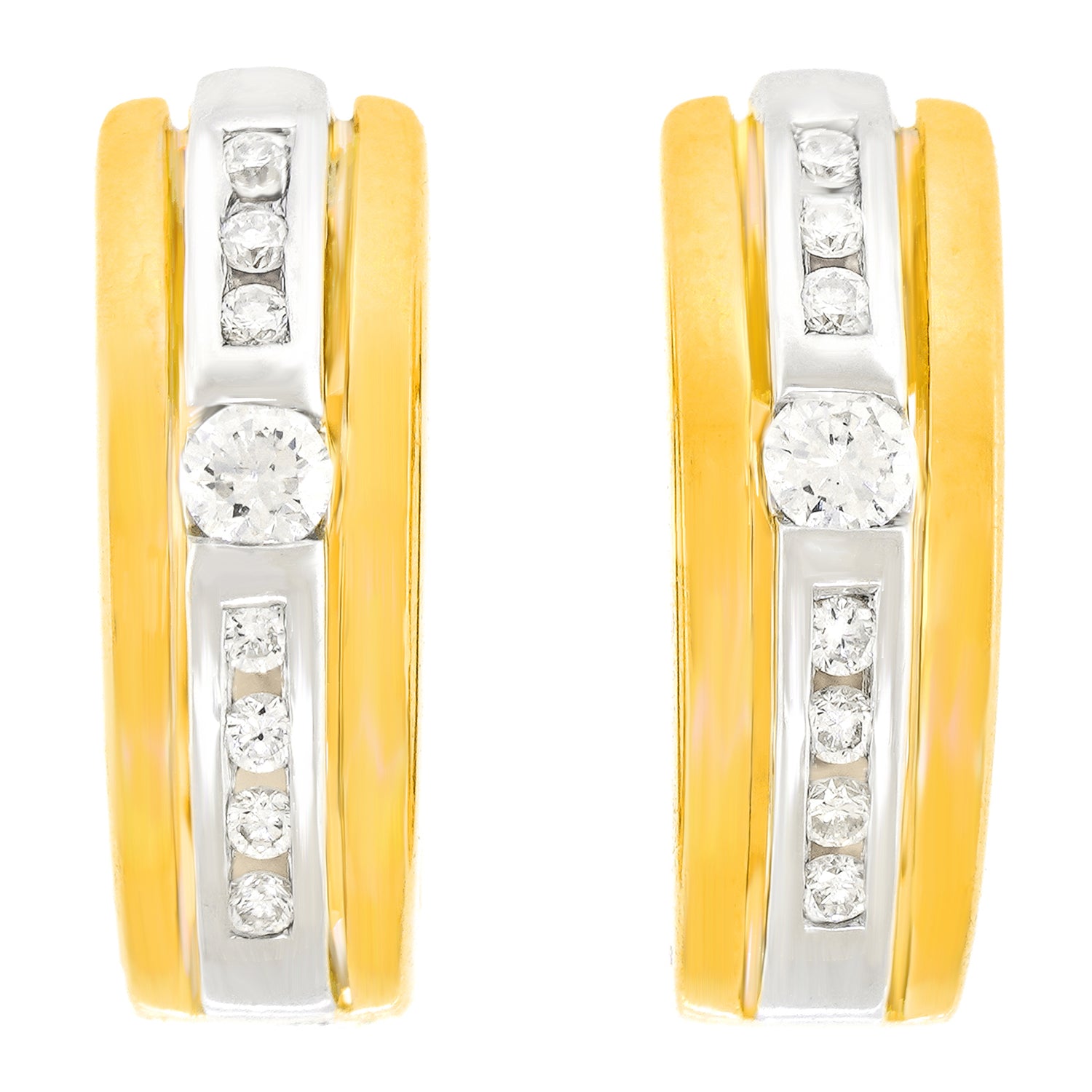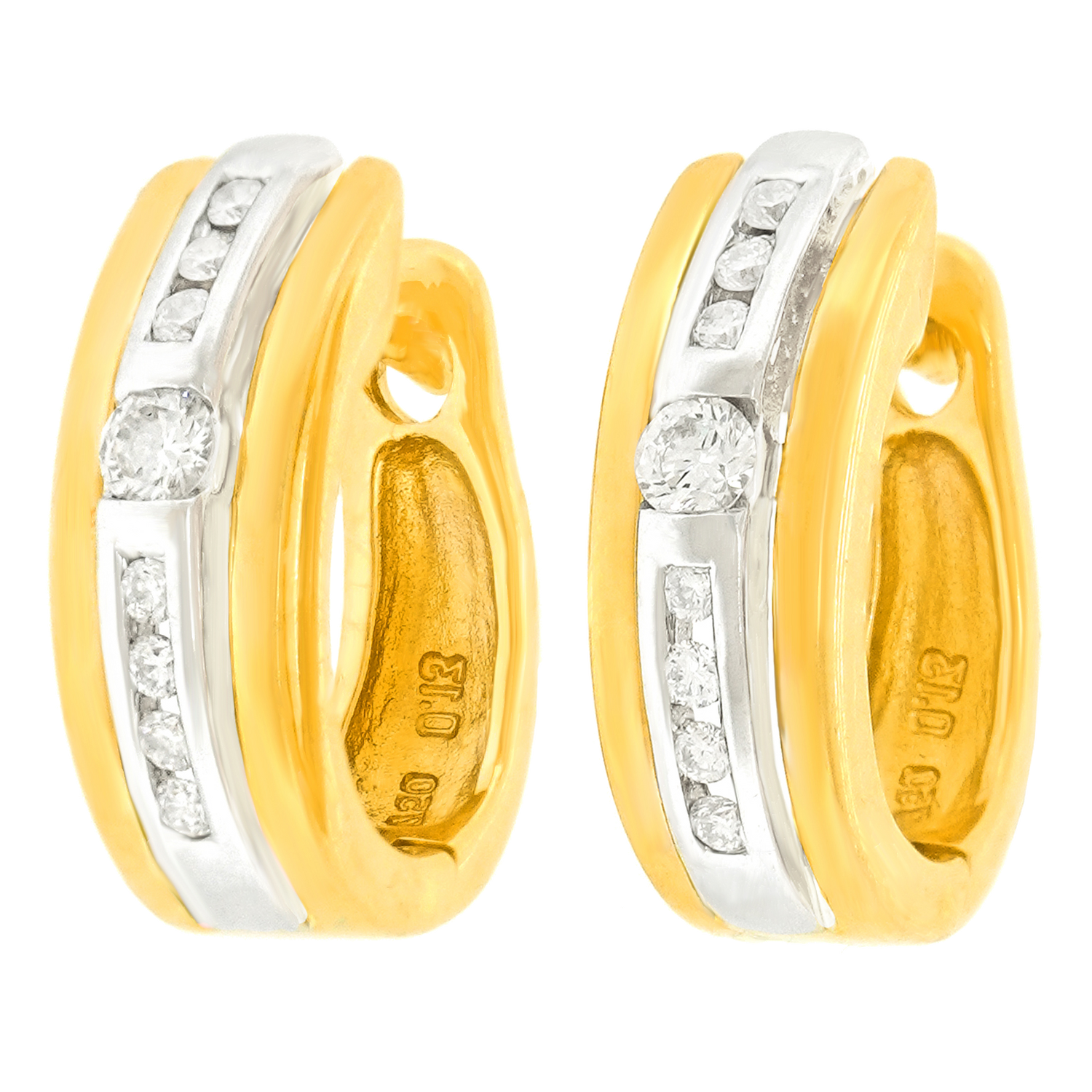 Circa 1980s, 18k, Swiss. These tailored, chic gold hoops are set with .35 carats of superb white diamonds (G color and VS clarity). Their look effortlessly dresses up or down, as perfect with heels and jeans as a cocktail dress. Huggie hoops are comfortable and fit the ear beautifully. Excellent condition.