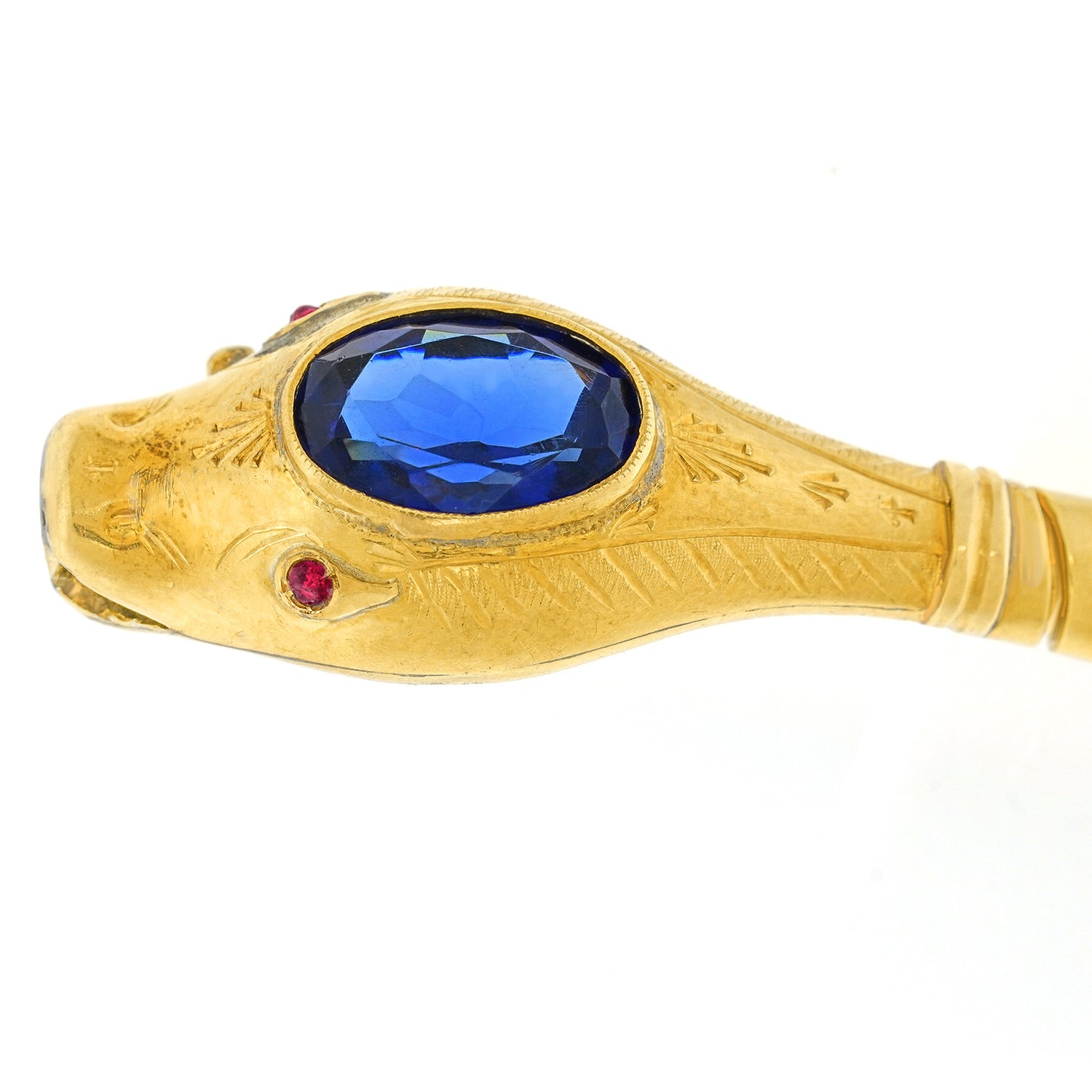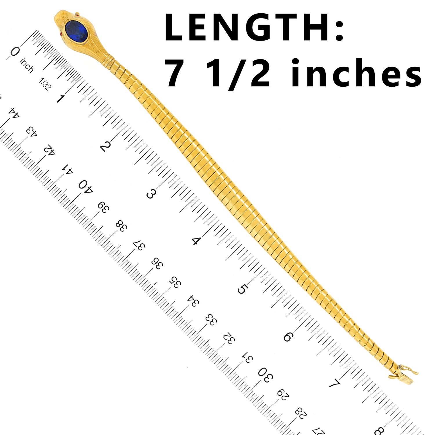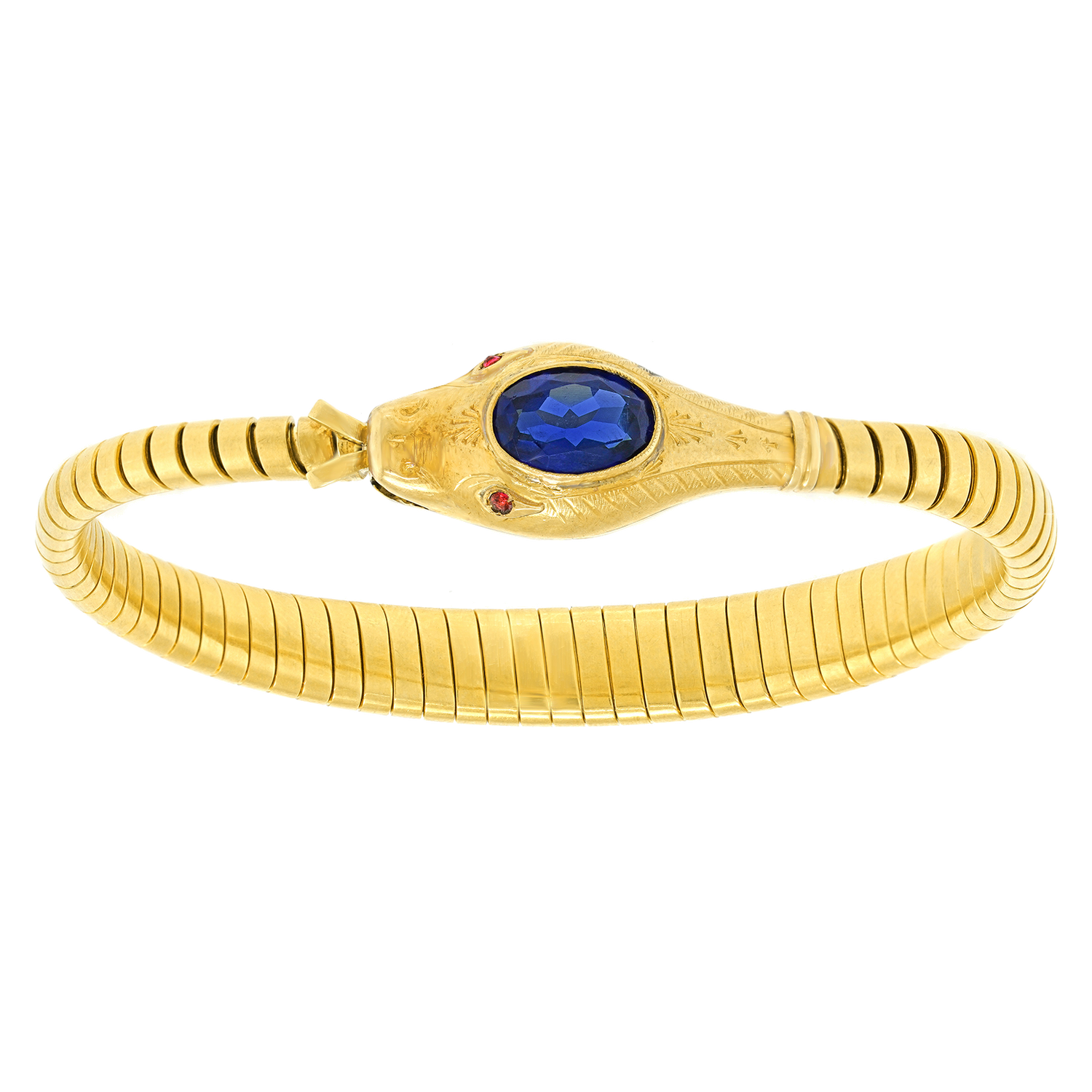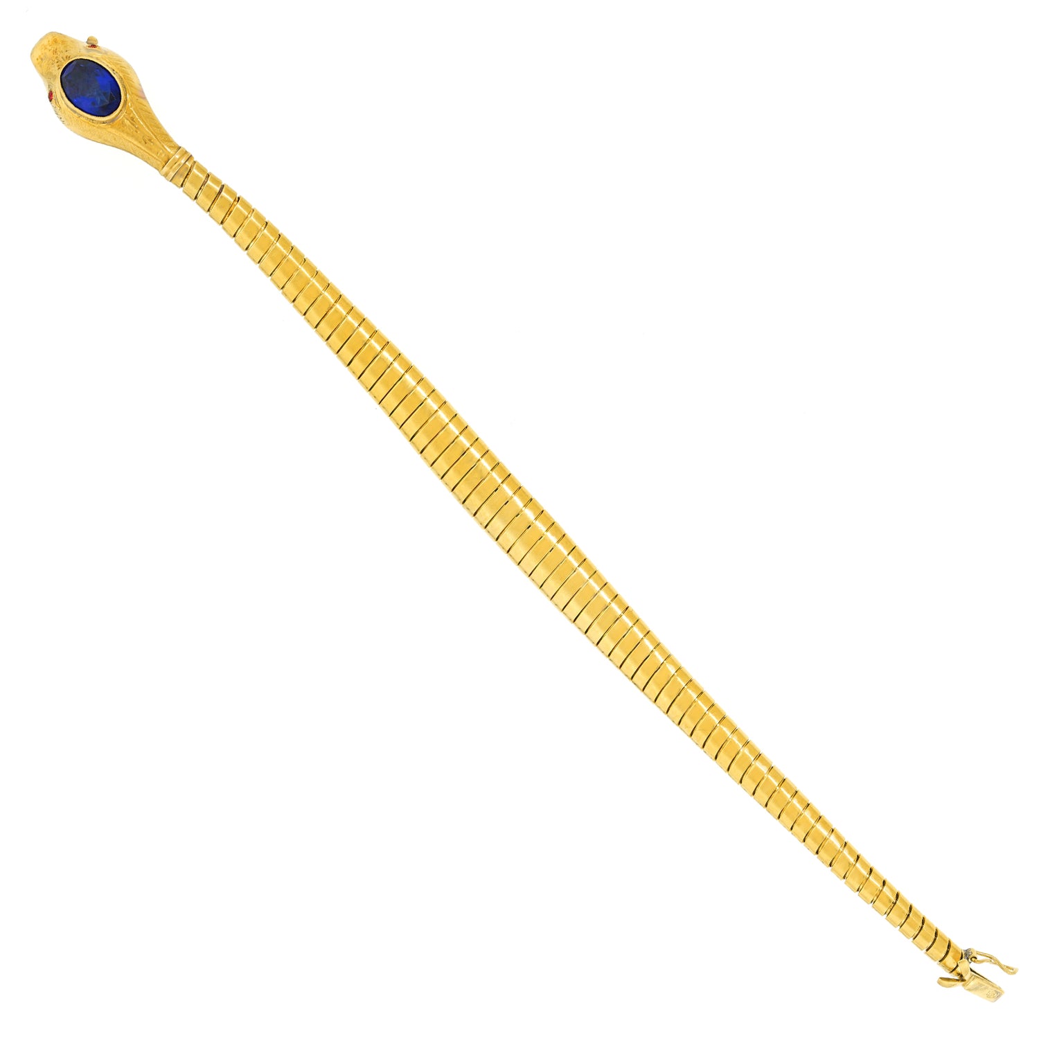 Circa 1920s, 18k. This marvelous Art Deco jewel pairs a sleek tubogas bracelet with a 2.0-carat sapphire-set catch. The charming snake motif draws on ancient art and symbolism for a look that speaks tongues to ancient mysticism and hair flips to pop fashion. Finely hand-made and delightfully wearable, this bracelet is in very good condition.
