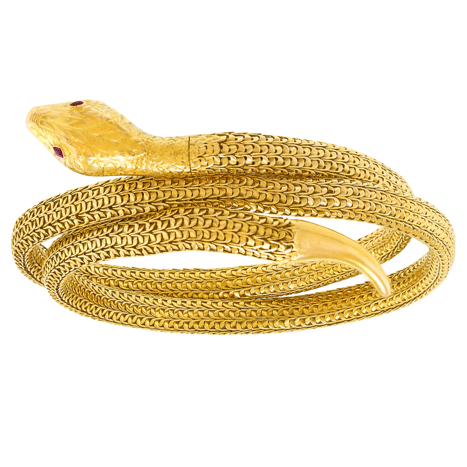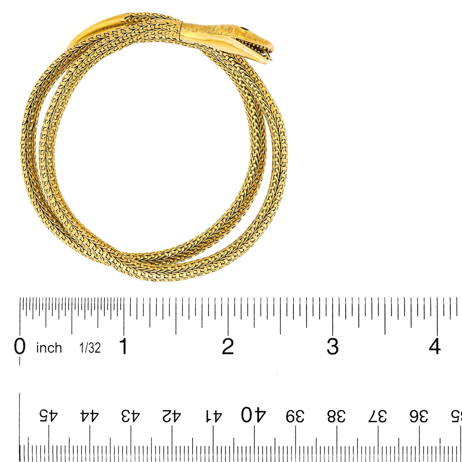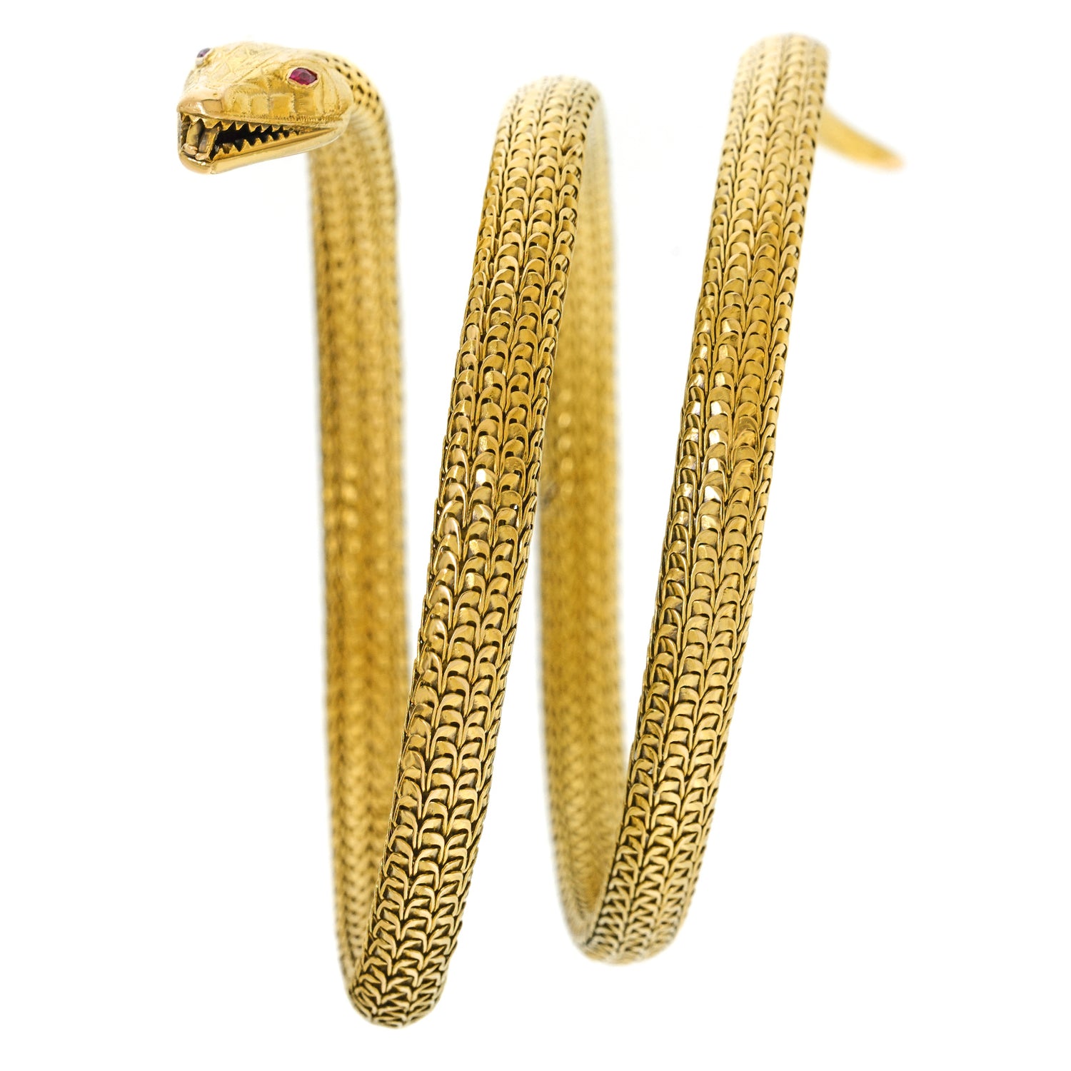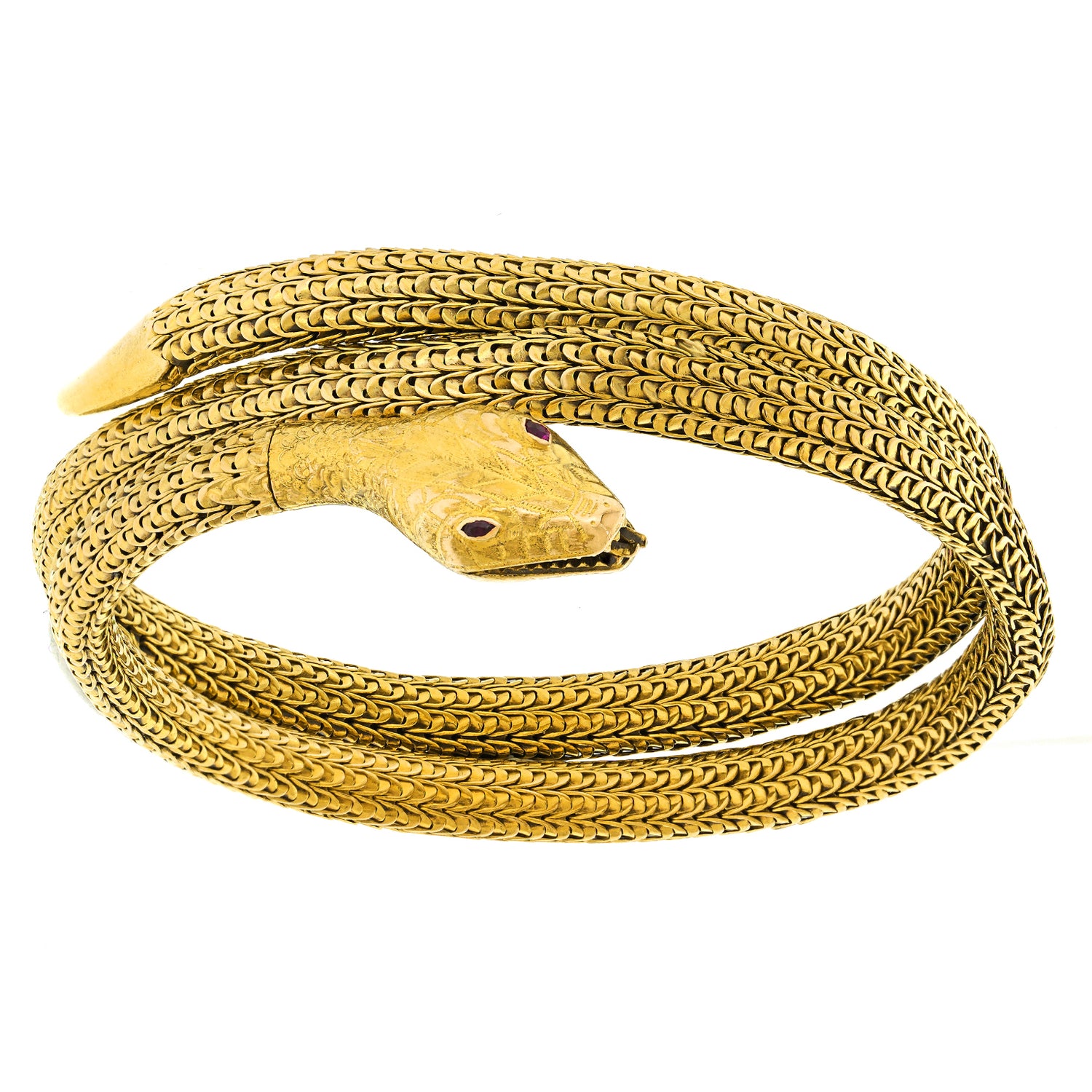 Circa 1880s, 14k. This delightful Victorian snake bracelet features a handmade flexible body and a head set with ruby eyes. Snake bracelets were the height of fashion in the ancient world and have persistently rocked the fashion world for over four thousand years. Finely made, this wonderfully detailed bracelet is in good condition.
