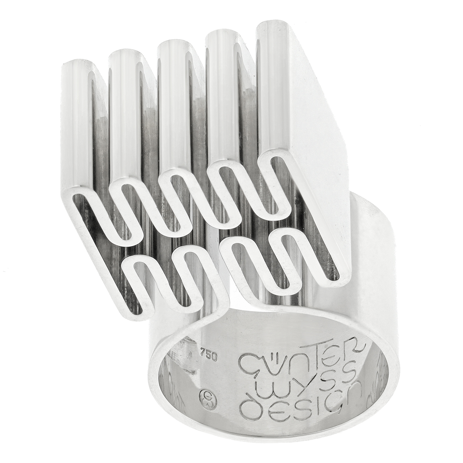 Circa 1960s, 18k, by Gunter Wyss, Switzerland. This one-of-a-kind ring by the revolutionary goldsmith, Günter Wyss, is a visual and technical marvel. It is made from one continuous piece of 18k white gold. His designs and techniques were groundbreaking, but alas, his body of work is limited as he passed away at age 37. Highly sought after by museums and collectors alike, this piece is in excellent condition.