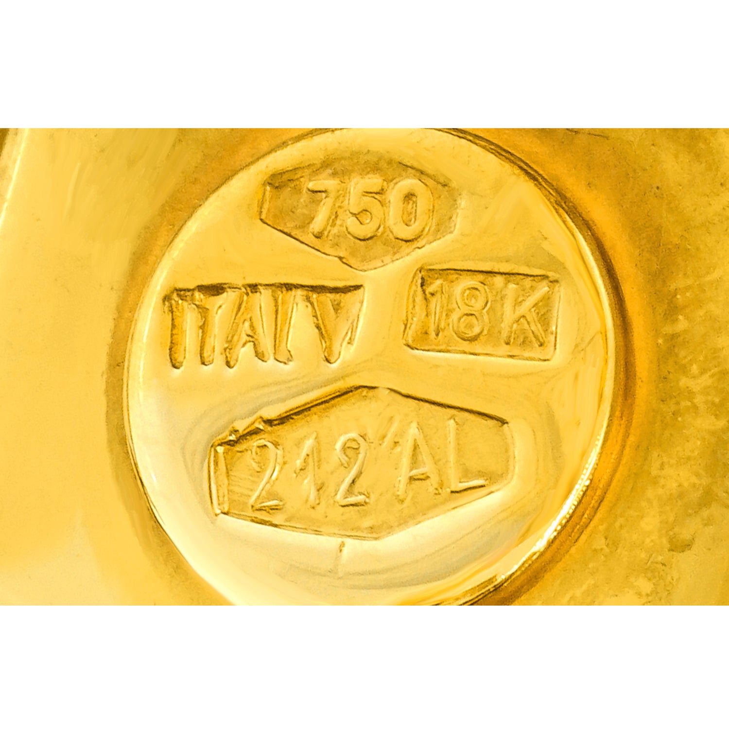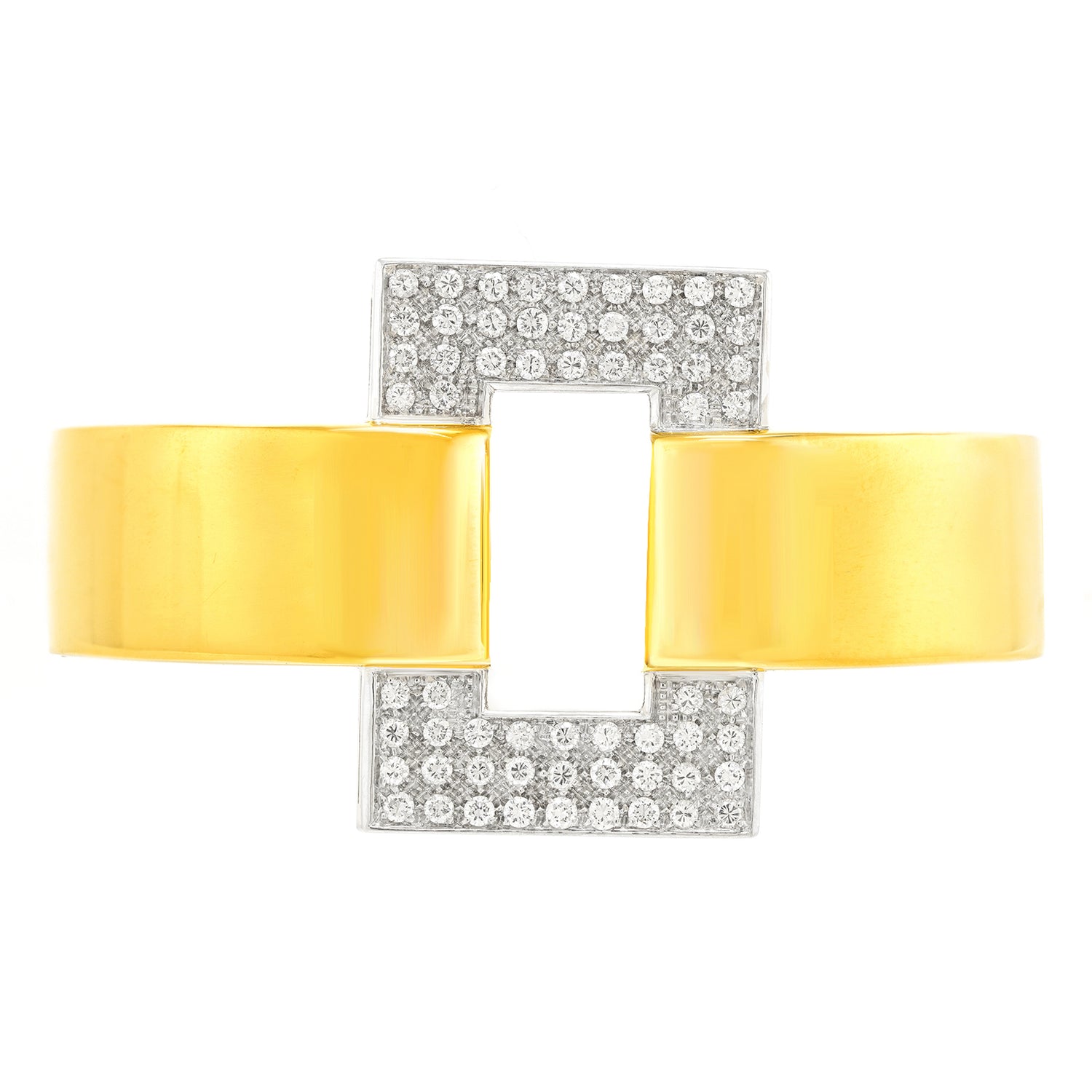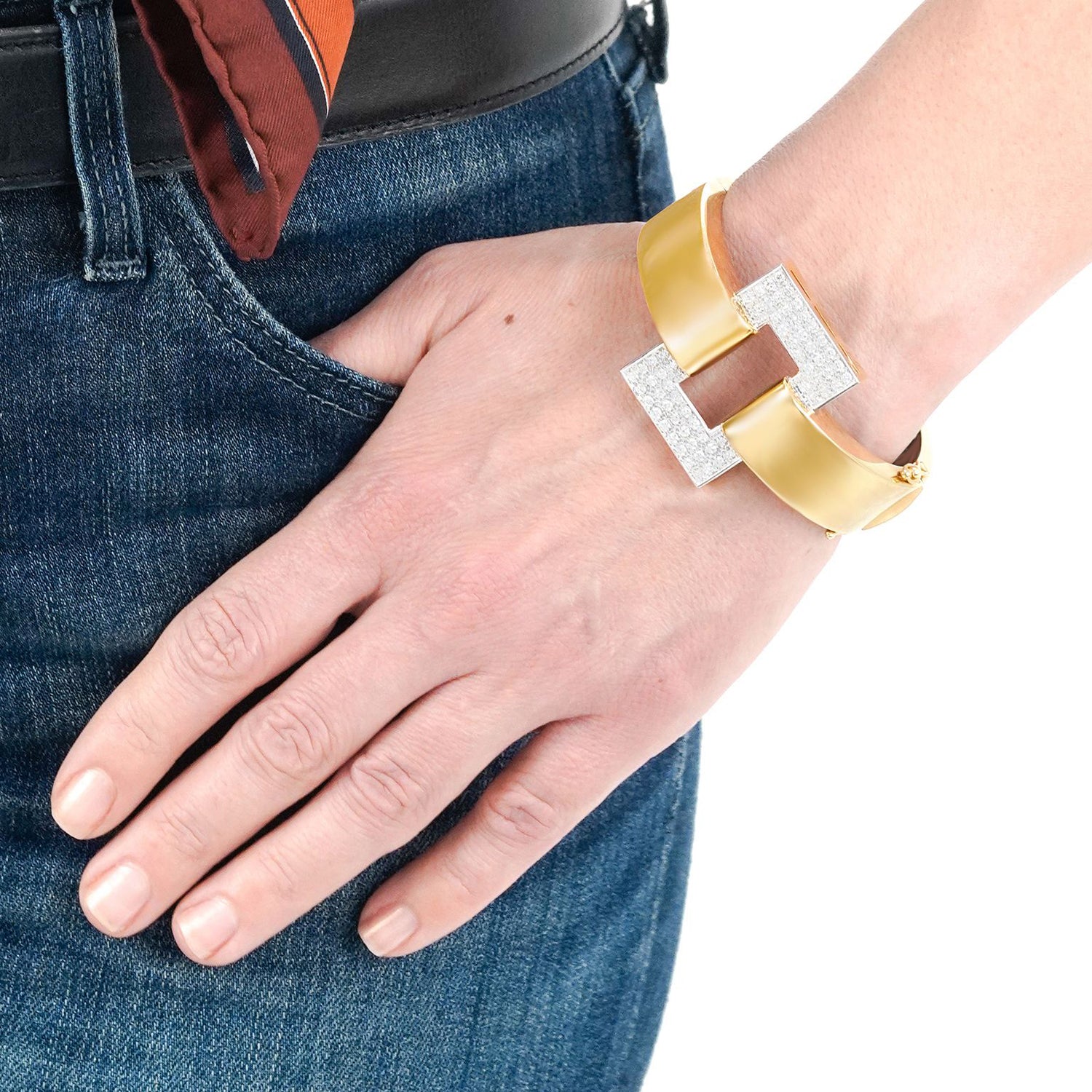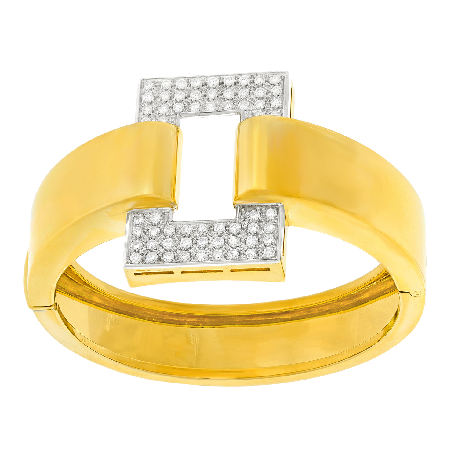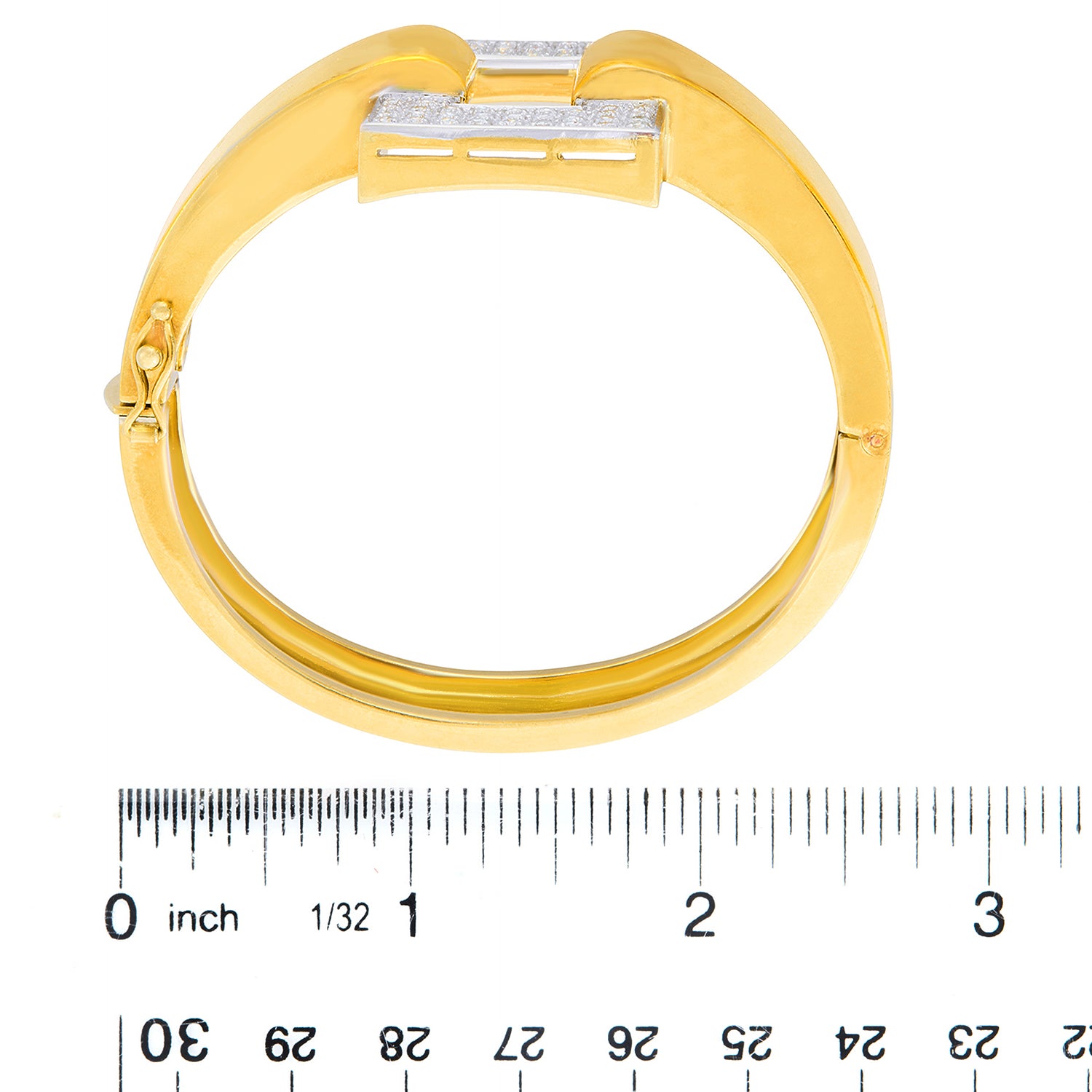 Circa 1980s, 18k, Italy. Big and bold, style for days, this Italian bracelet is eighties fashion perfection. Set with three carats of fine white diamonds (G color, VS clarity), this bangle is unapologetically fabulous! Make this bracelet part of your signature style. Finely fabricated, it is comfortable and balanced to wear. Excellent condition.