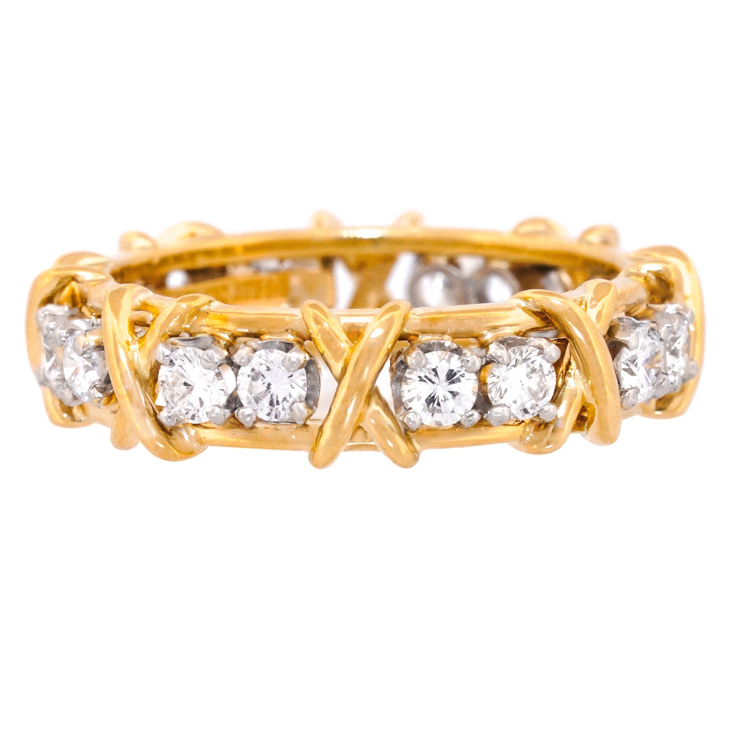 Circa 1980s, 18k, by Jean Schlumberger for Tiffany & Co. Iconic Tiffany style at its Schlumberger best! This 16-stone ring features a traditional ribbon of X's and diamond O's. A rather rare, all yellow gold version, this one is a size 6. Schlumberger's visionary designs honored the Tiffany tradition while creating a dazzling new body of work. This ring is an older version, with a bit more diamond weight (1.50 carats of F color and VS clarity) than the new ones. Beautifully made, it is in excellent condition.