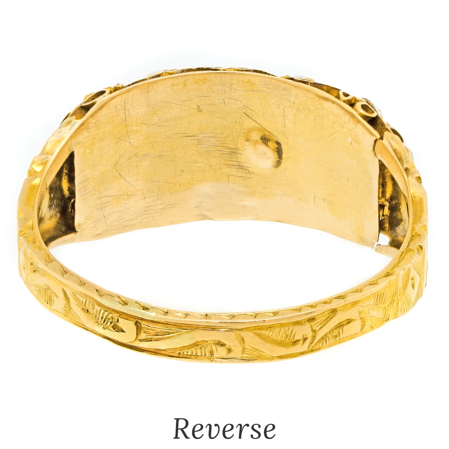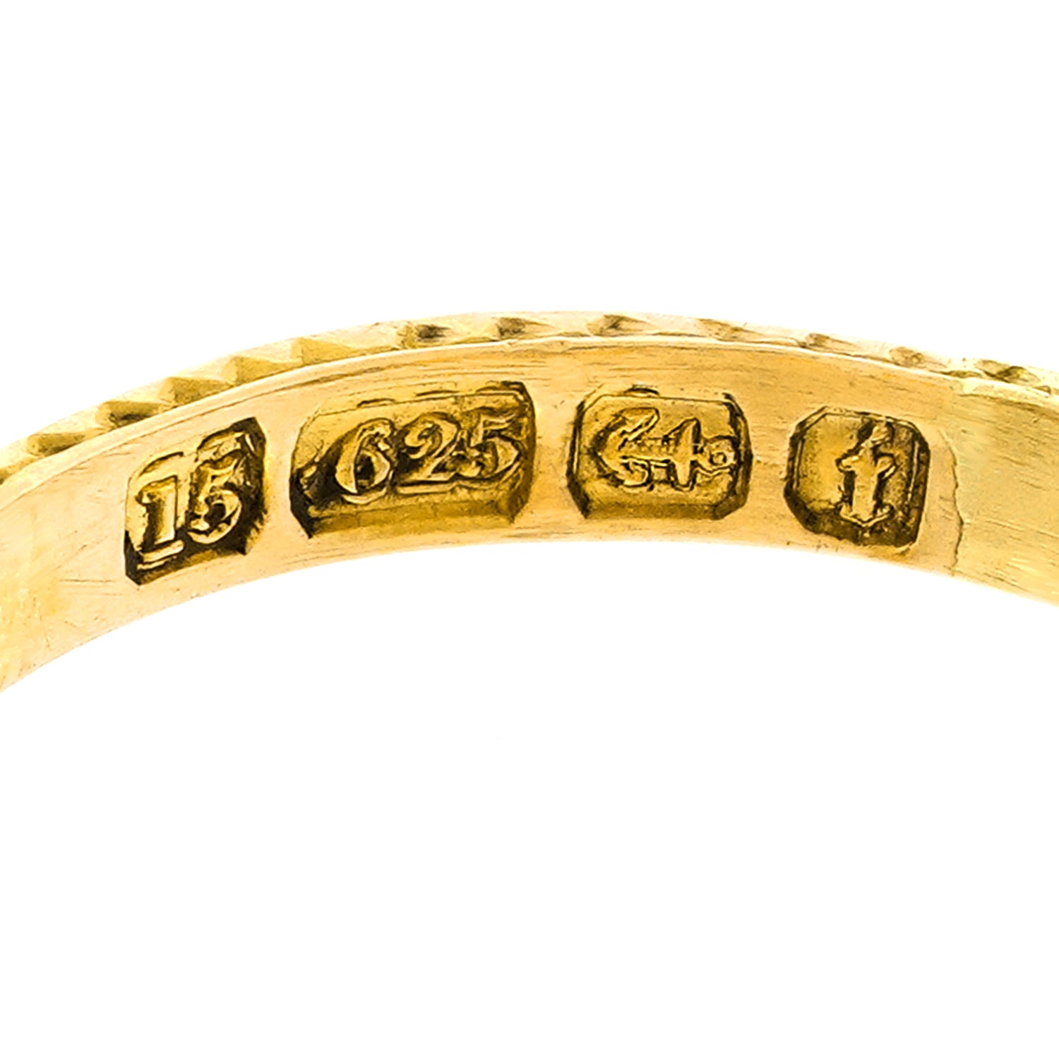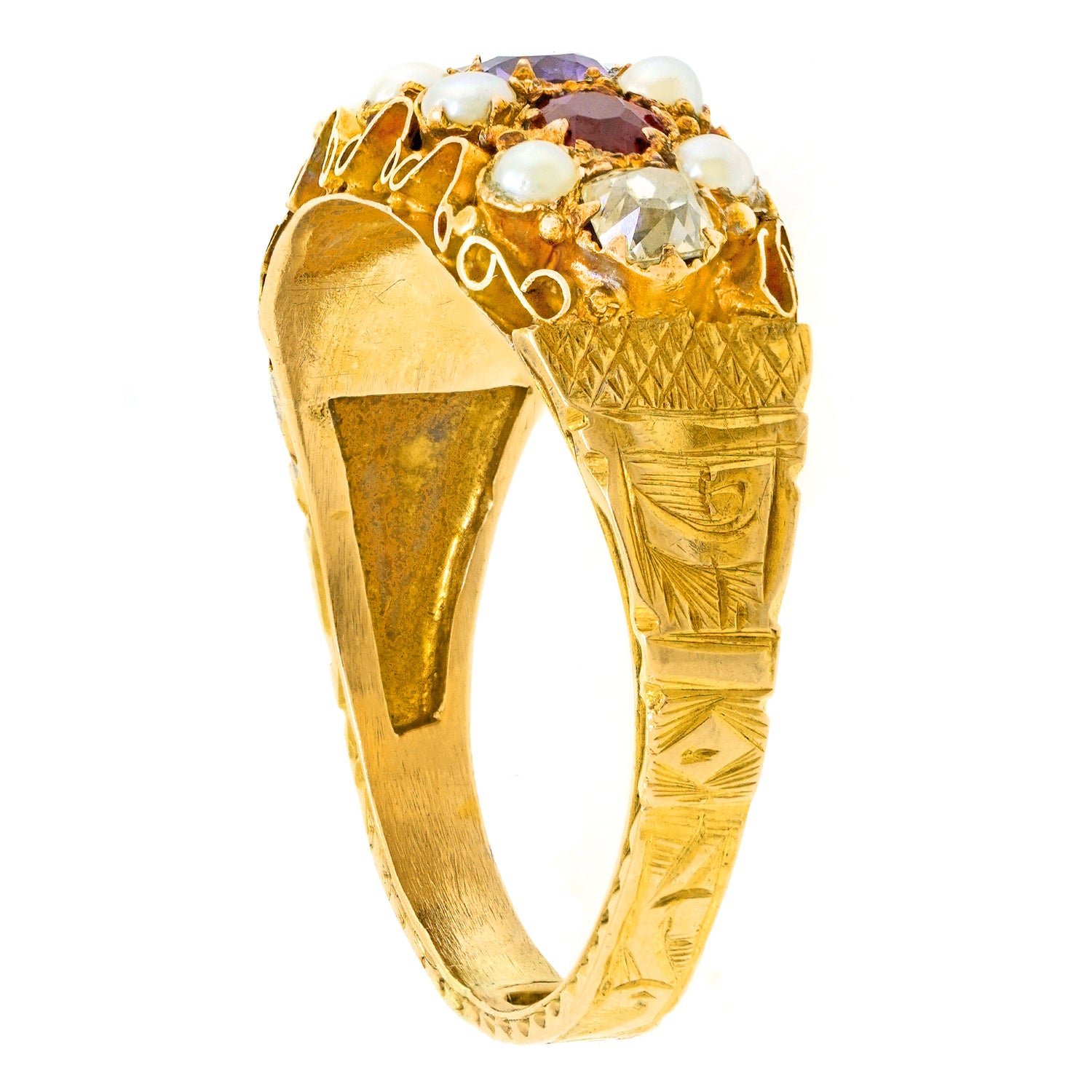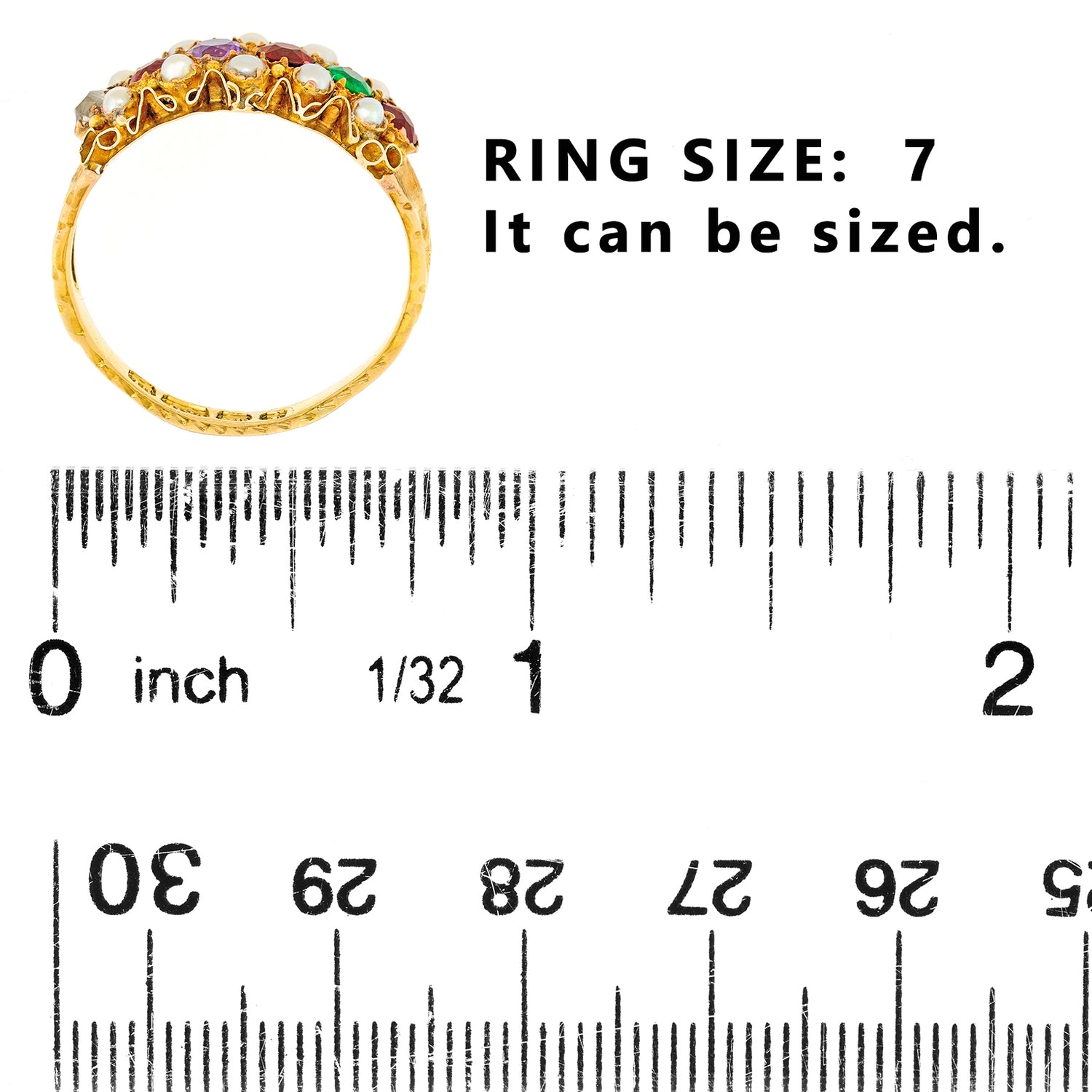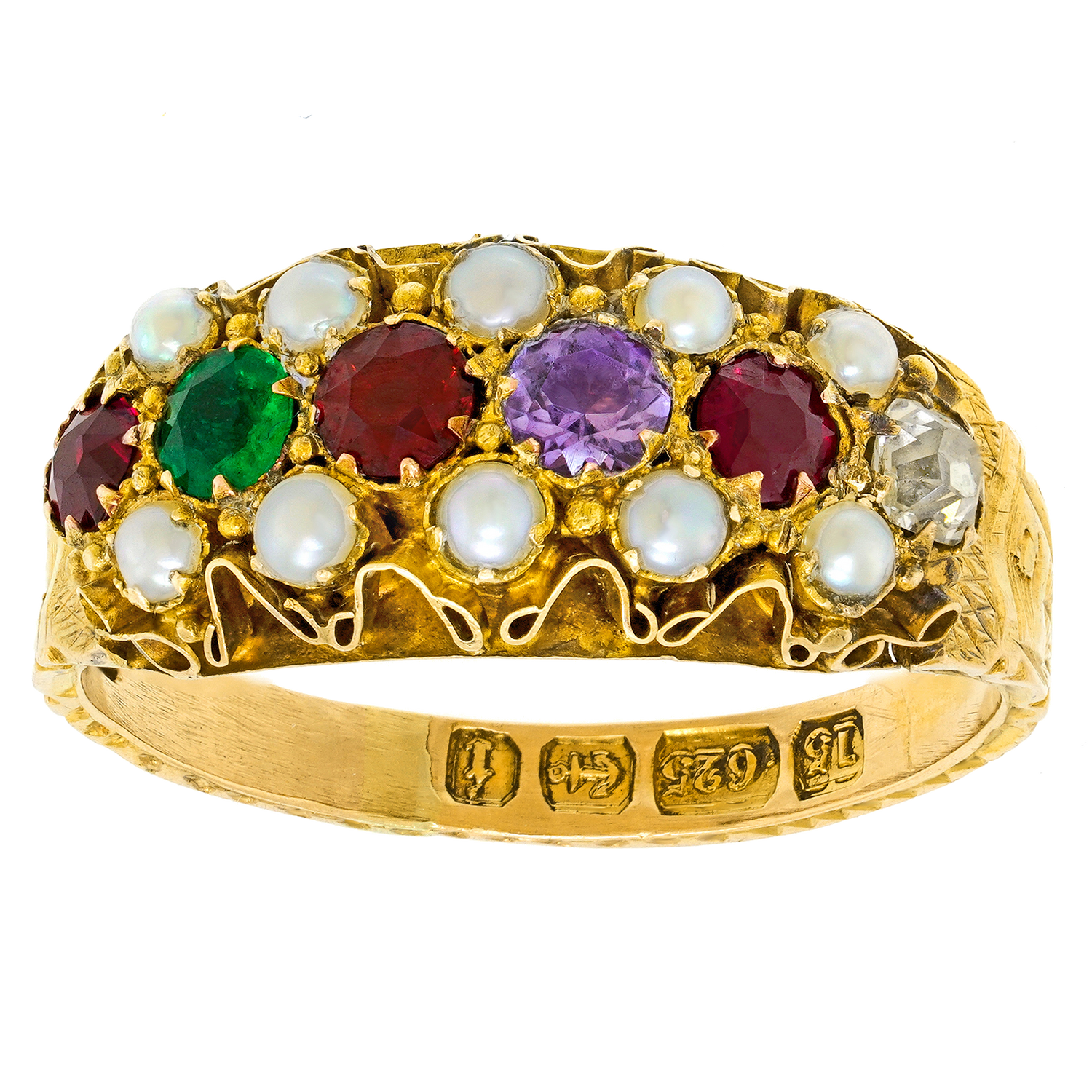 Circa 1883, 15k, Birmingham, England. I cannot think of a more charming or romantic sentiment than the one behind this acrostic antique jewel. The first letter of the names of the gemstones in the ring spell out "regard" ( Ruby, Emerald, Garnet, Amethyst, Ruby, and Diamond). Delightfully Victorian, the look is bright and cheerful. Excellent condition.