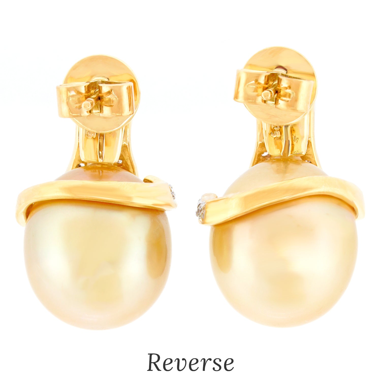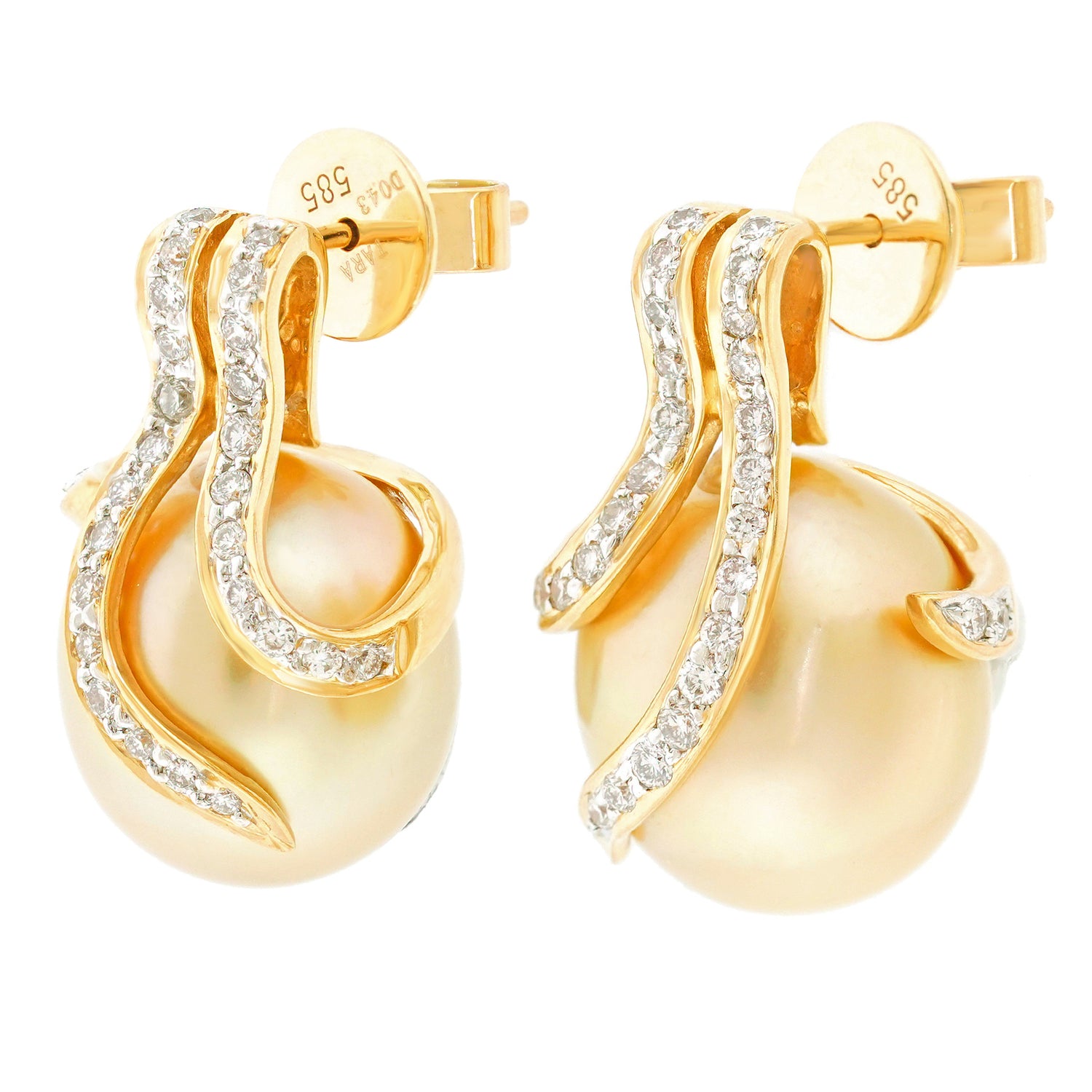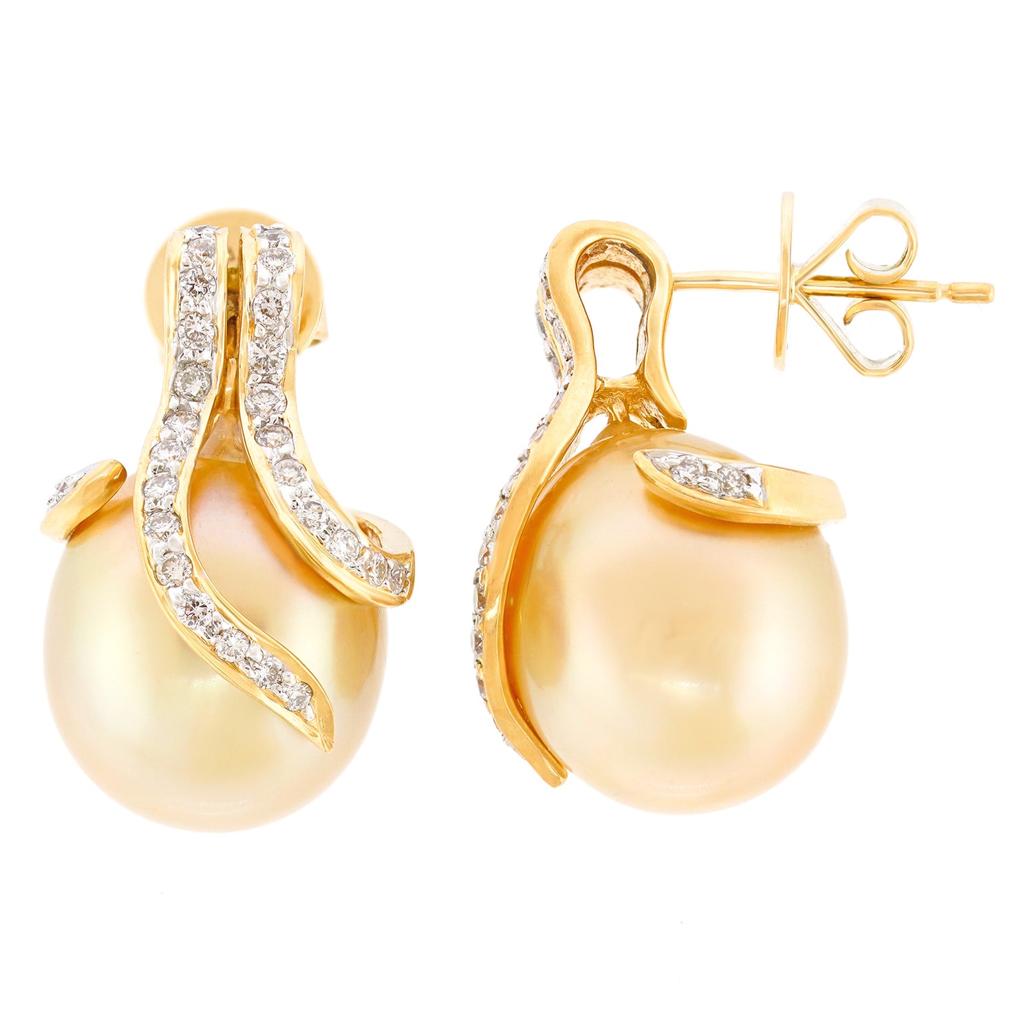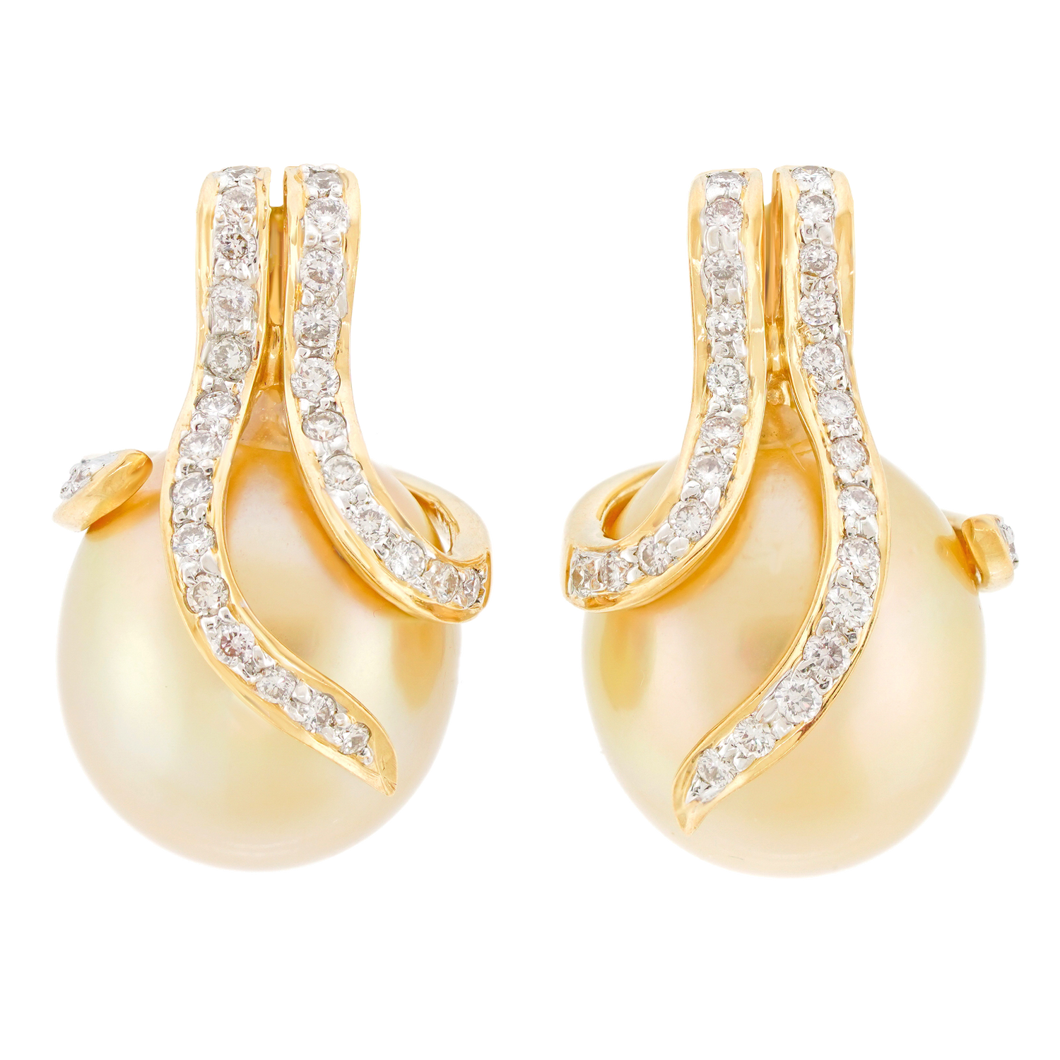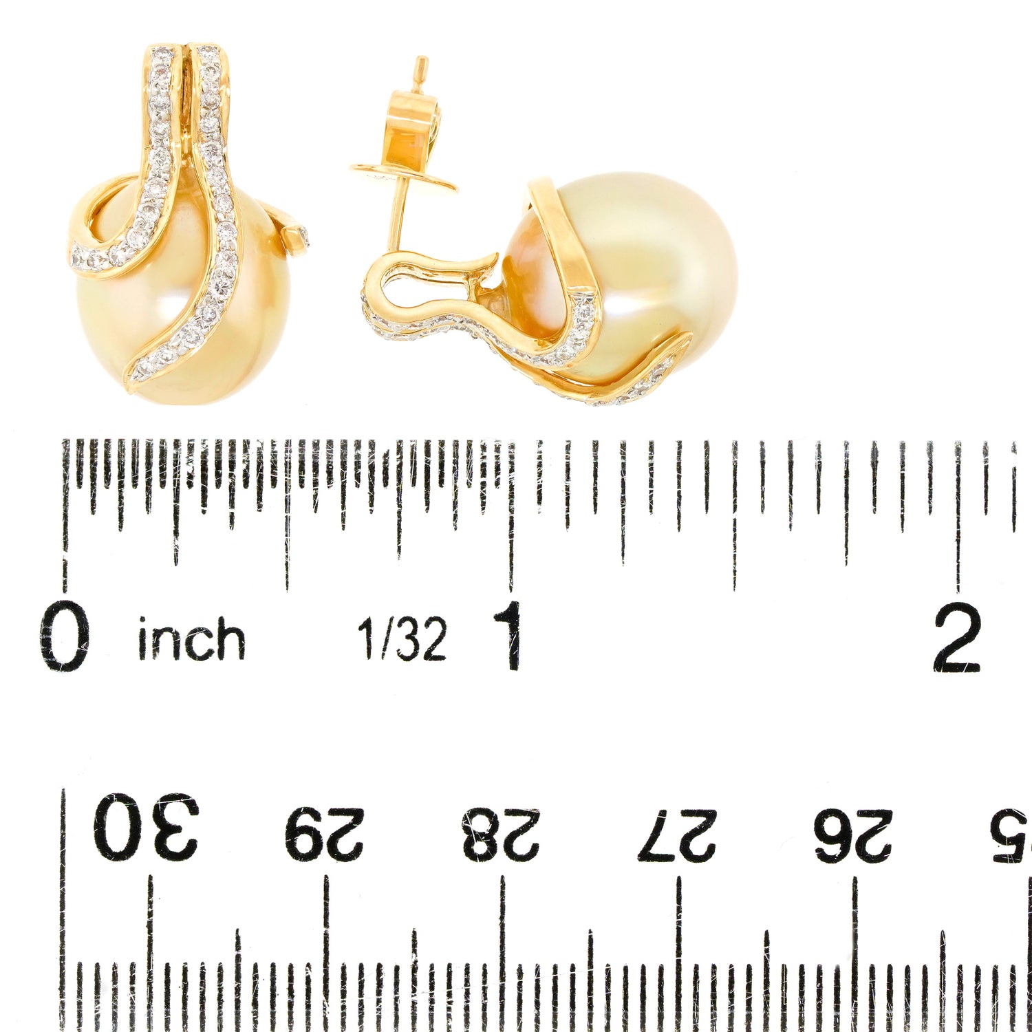 Circa 1990s, 14k. Sleek and chic, these earrings feature 12mm Golden South Sea pearls and .50 carats of brilliant white diamonds (G color, VS clarity). The look is elegantly heels and jeans to little black dresses. Finely fabricated, they are in excellent condition.