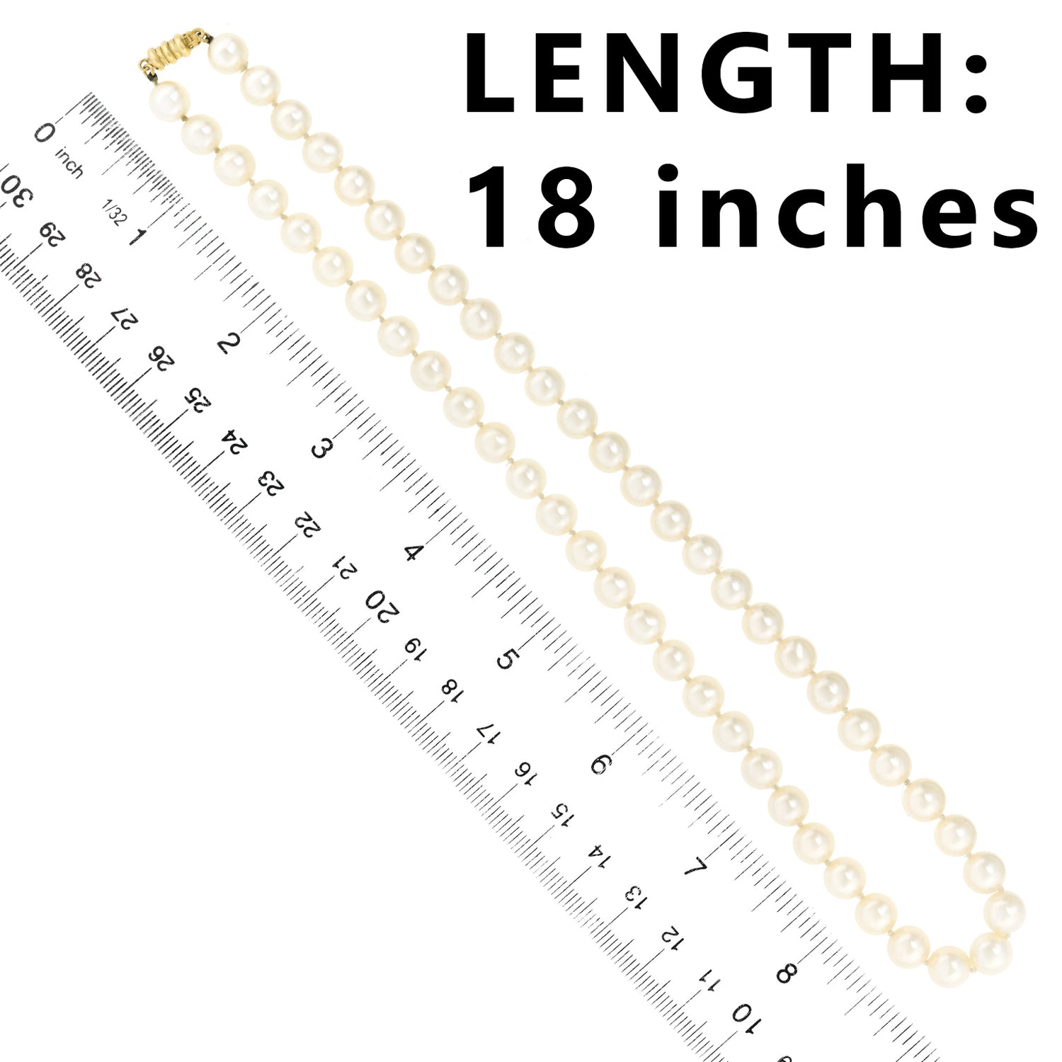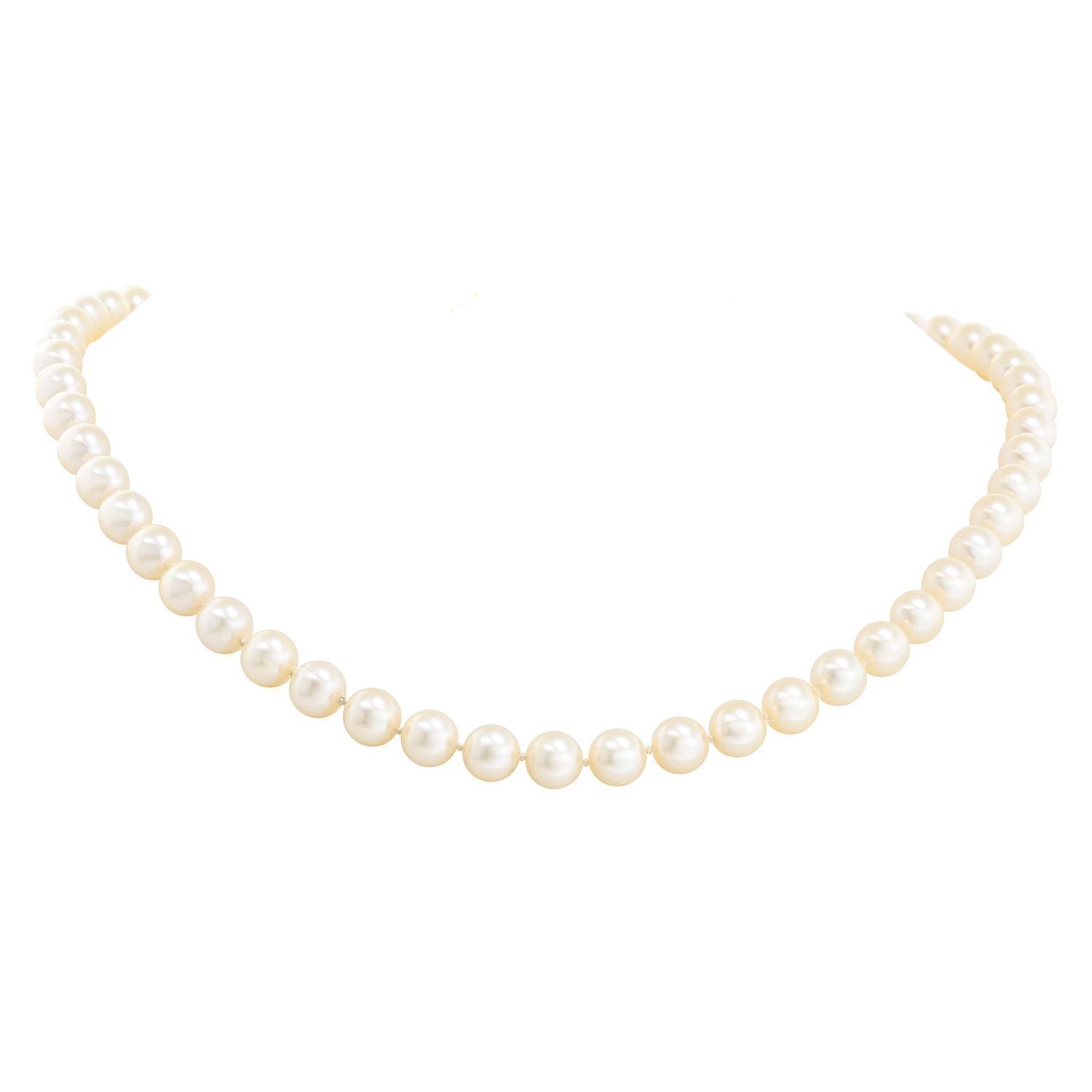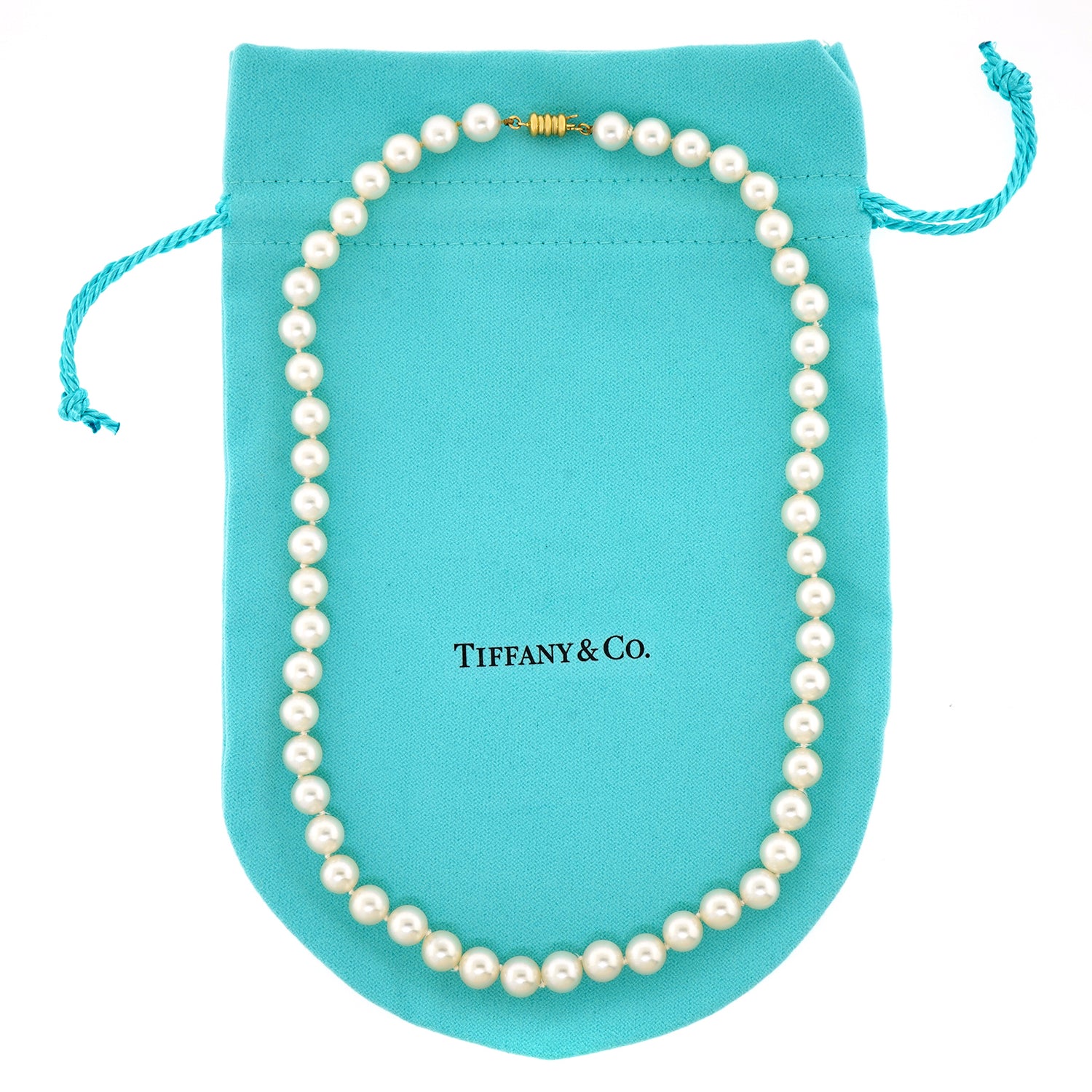 Circa 1988, 18k, by Tiffany & Co. This 18-inch-long strand of pearls from the esteemed house of Tiffany & Co. is gorgeous. The strand consists of 53 lovely 7.8mm - 8.0mm pearls of good surface, color, and luster. Finely made, the stylish gold catch completes the visual narrative. Excellent condition.
