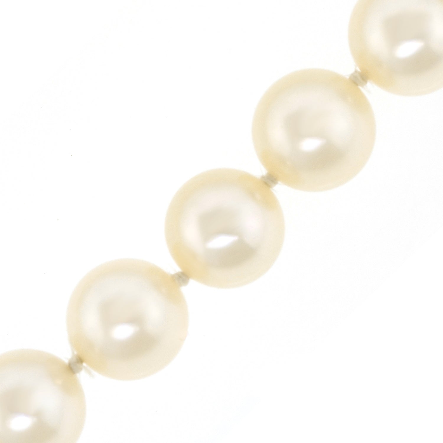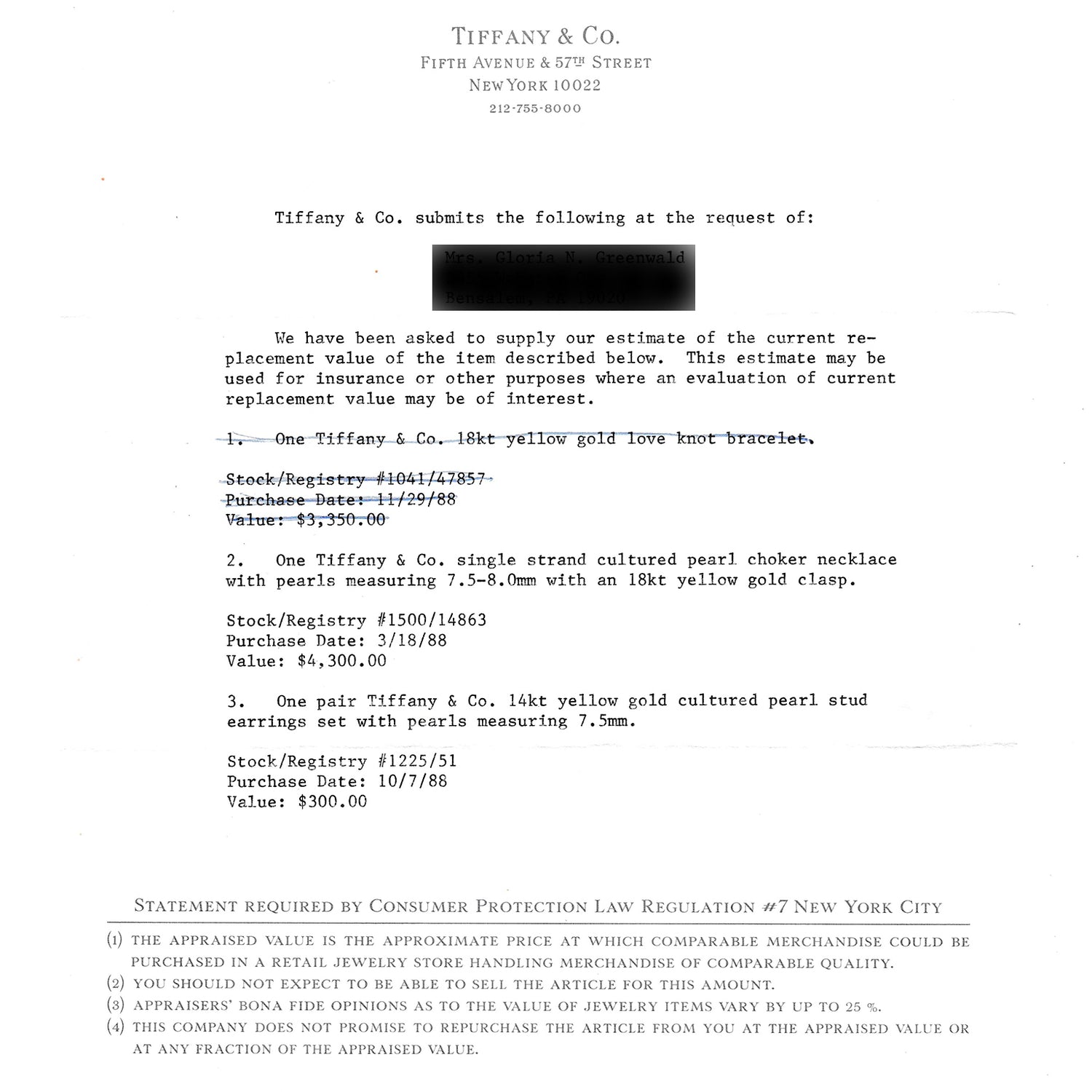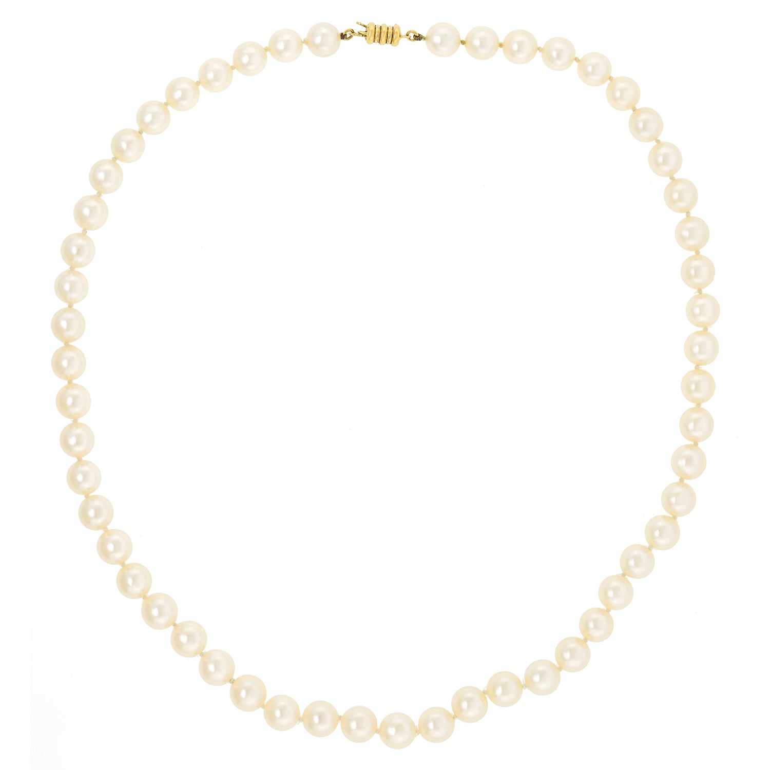 Circa 1988, 18k, by Tiffany & Co. This 18-inch-long strand of pearls from the esteemed house of Tiffany & Co. is gorgeous. The strand consists of 53 lovely 7.8mm - 8.0mm pearls of good surface, color, and luster. Finely made, the stylish gold catch completes the visual narrative. Excellent condition.