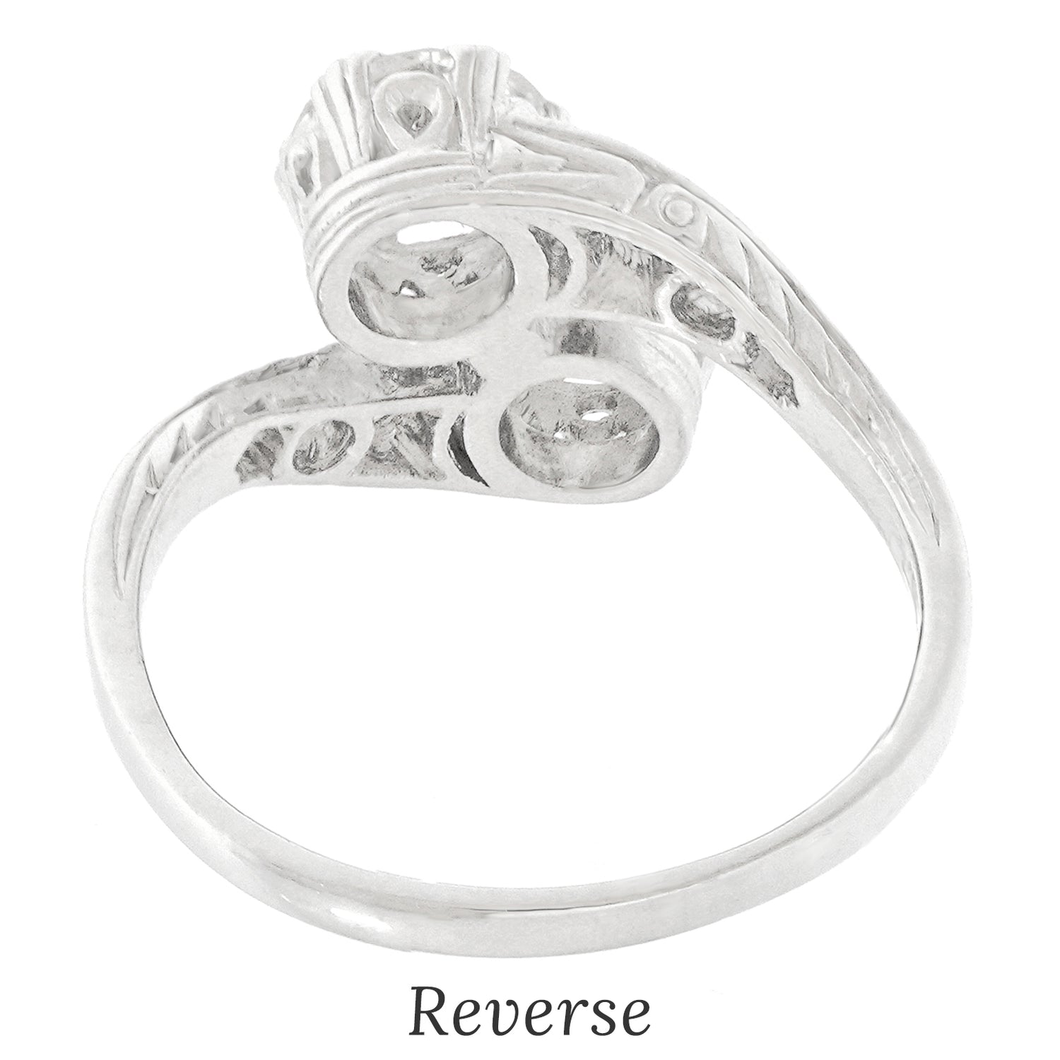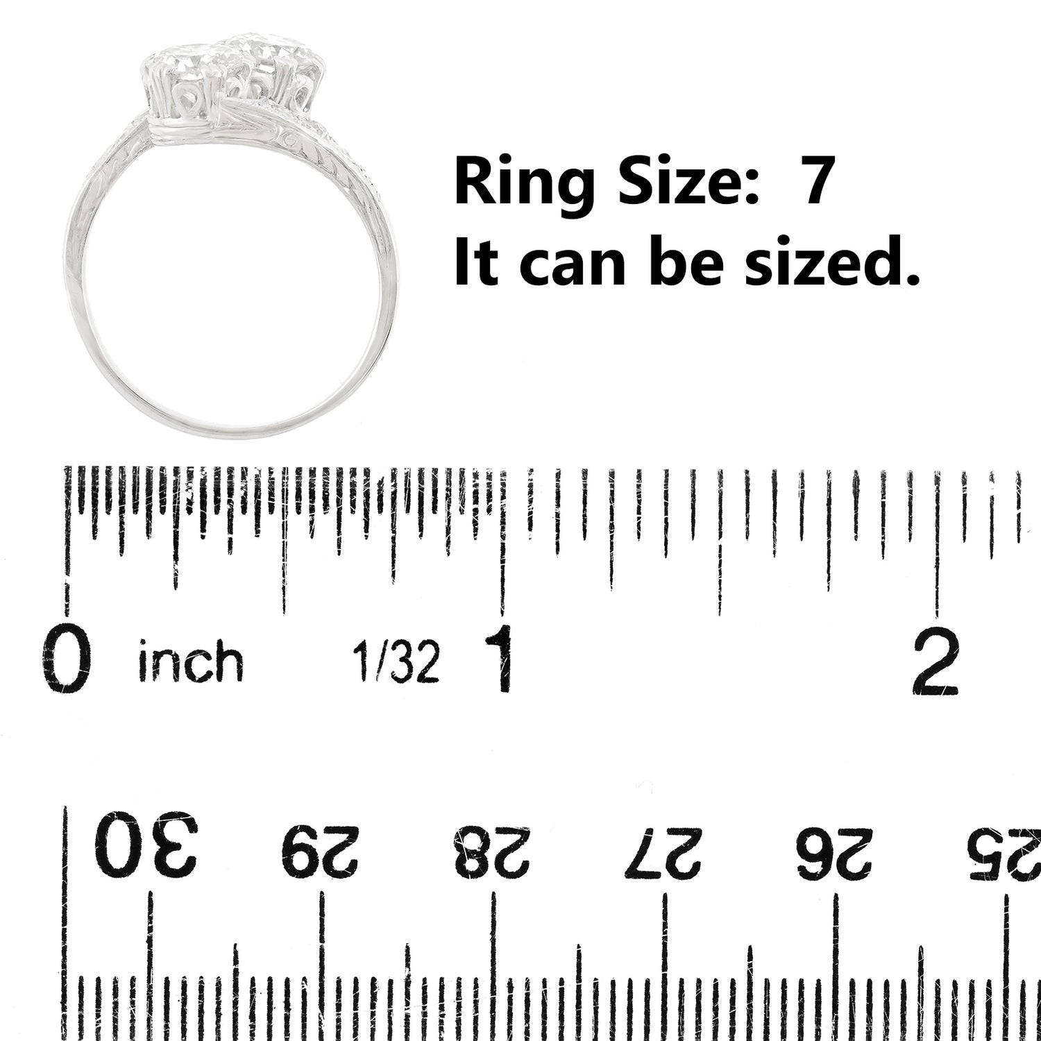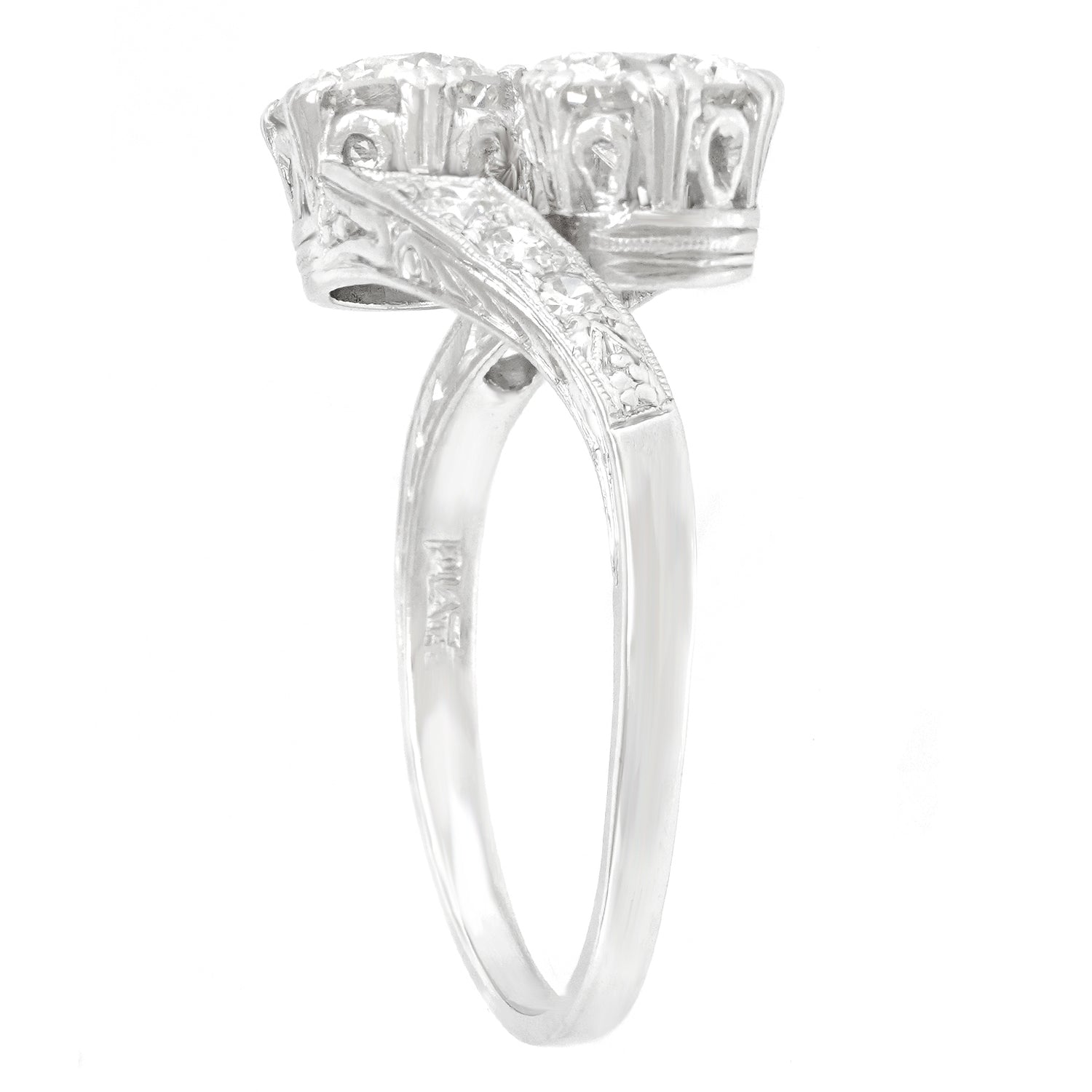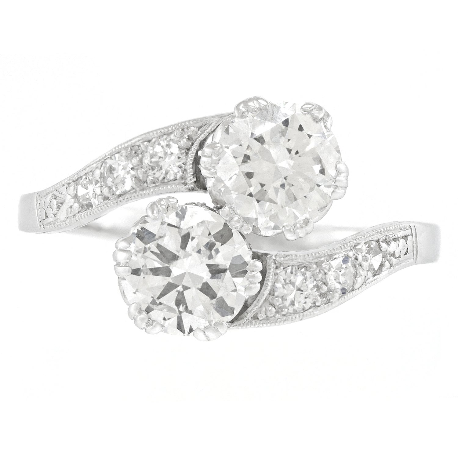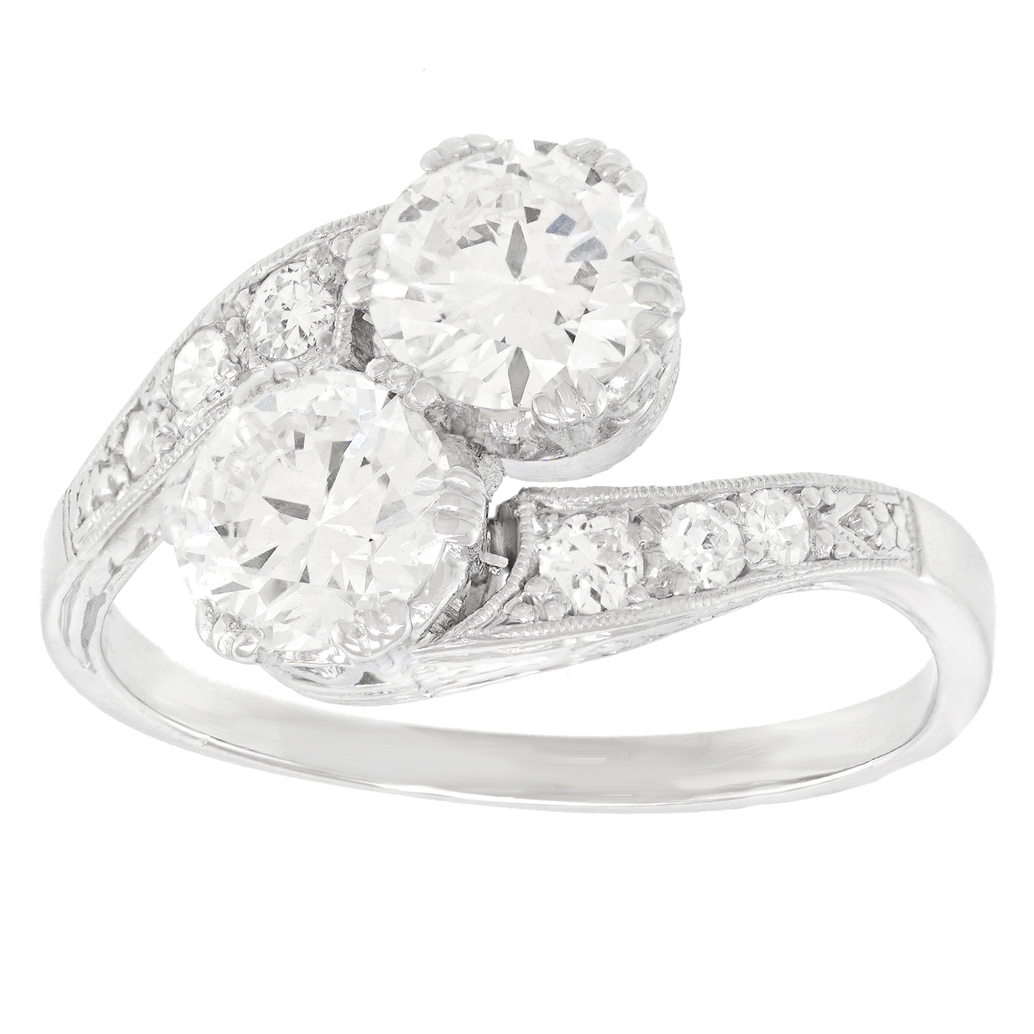 Circa 1920s, Platinum, American. Set with 1.85 carats of brillliant white European-cut diamonds (G color and VS clarity), this twenties tete-a-tete ring is vintage chic at its antique Art Deco best. Meticulously fabricated in platinum, this period ring is in excellent condition.