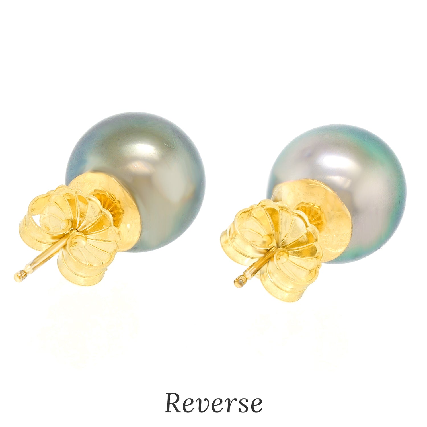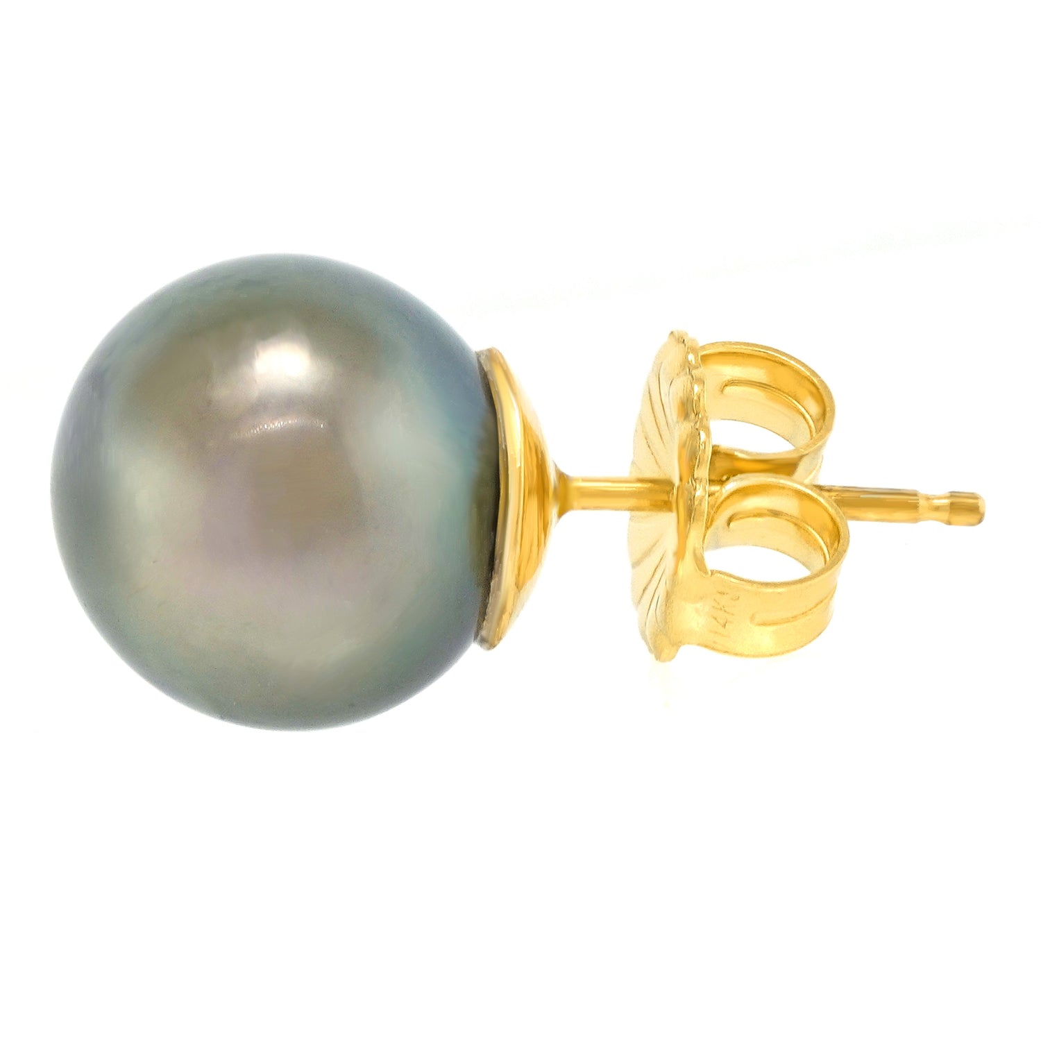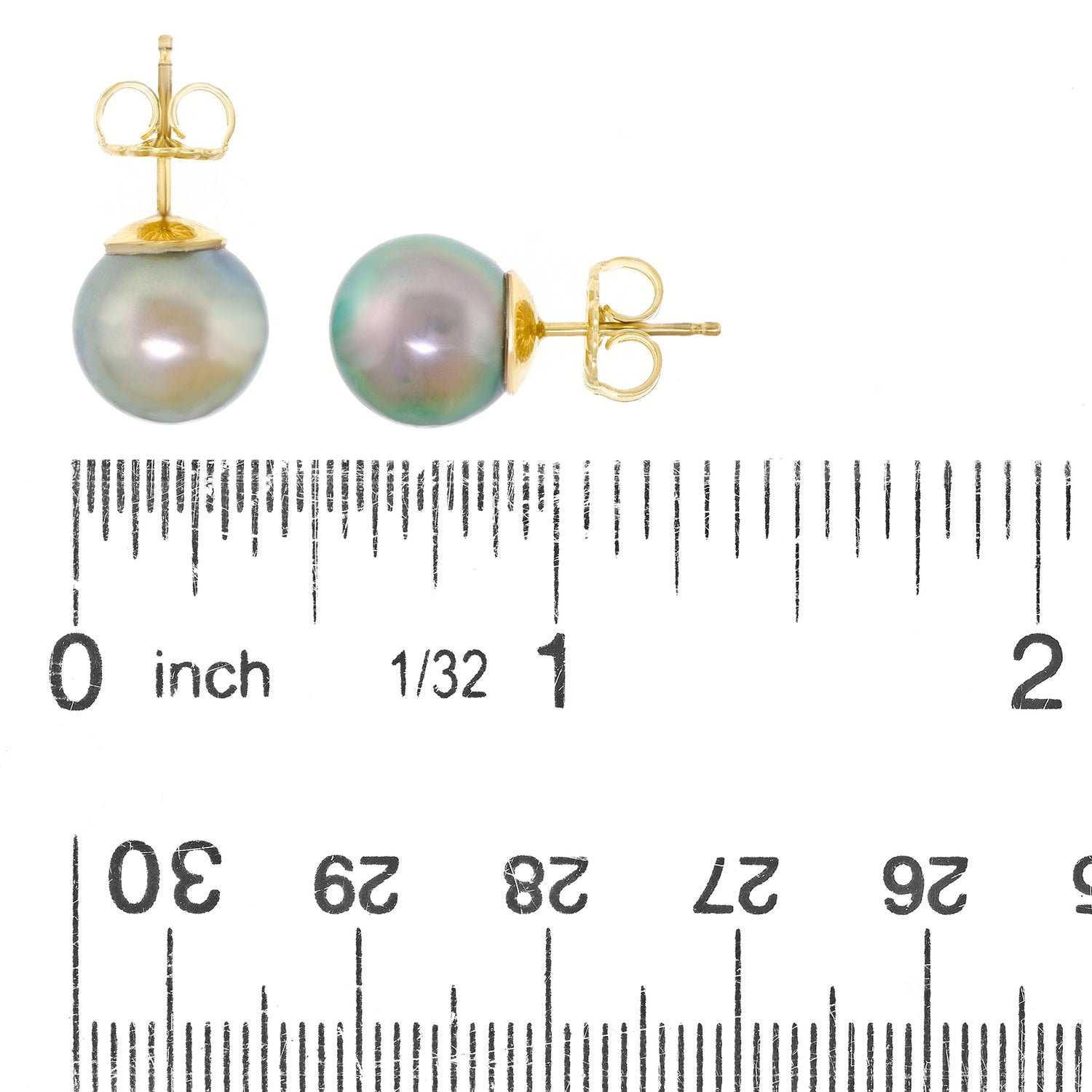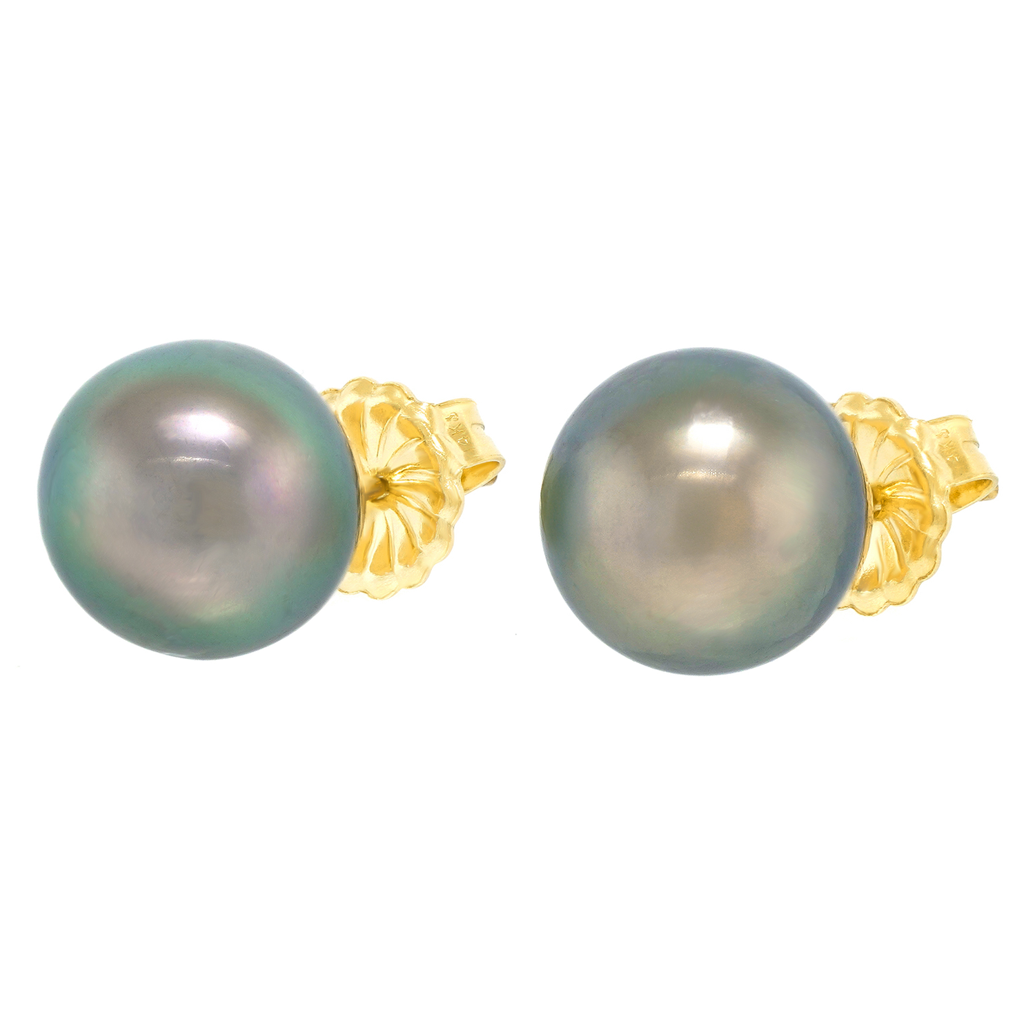 Circa 1980s, 14k, American. These visually fresh pearl studs feature 10.0mm Tahitian black pearls. The look is elegantly chic, perfect for day or evening. These pearls have outstanding color, surface, and luster. Excellent condition.