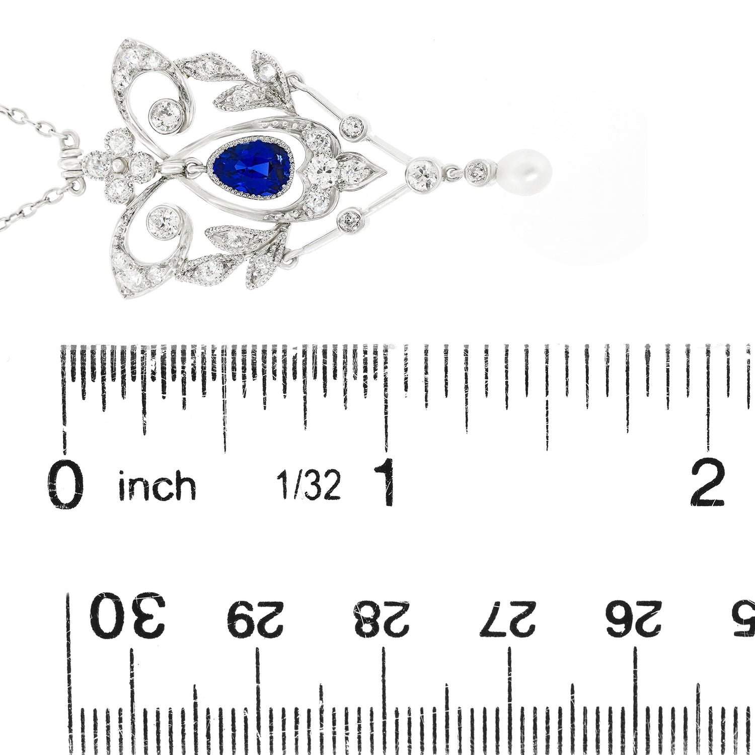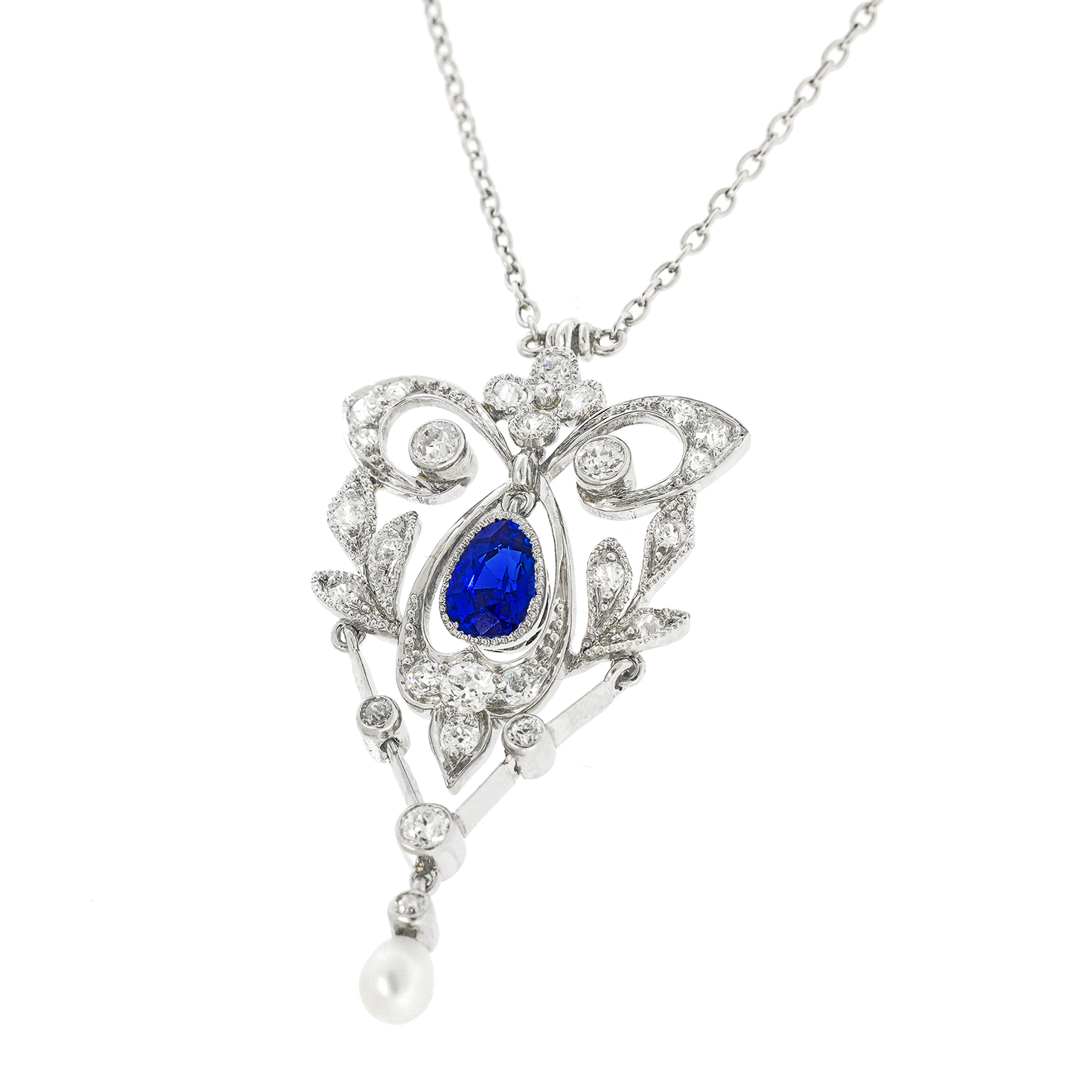 Circa 1910, Platinum, American. This gorgeous Edwardian lavaliere features a lively .50 carat cornflower blue sapphire and glittering white diamonds set in a delicately graceful shape. The look is romantically stylish. Meticulously handmade, this jewel stands the style test of time. Excellent condition.