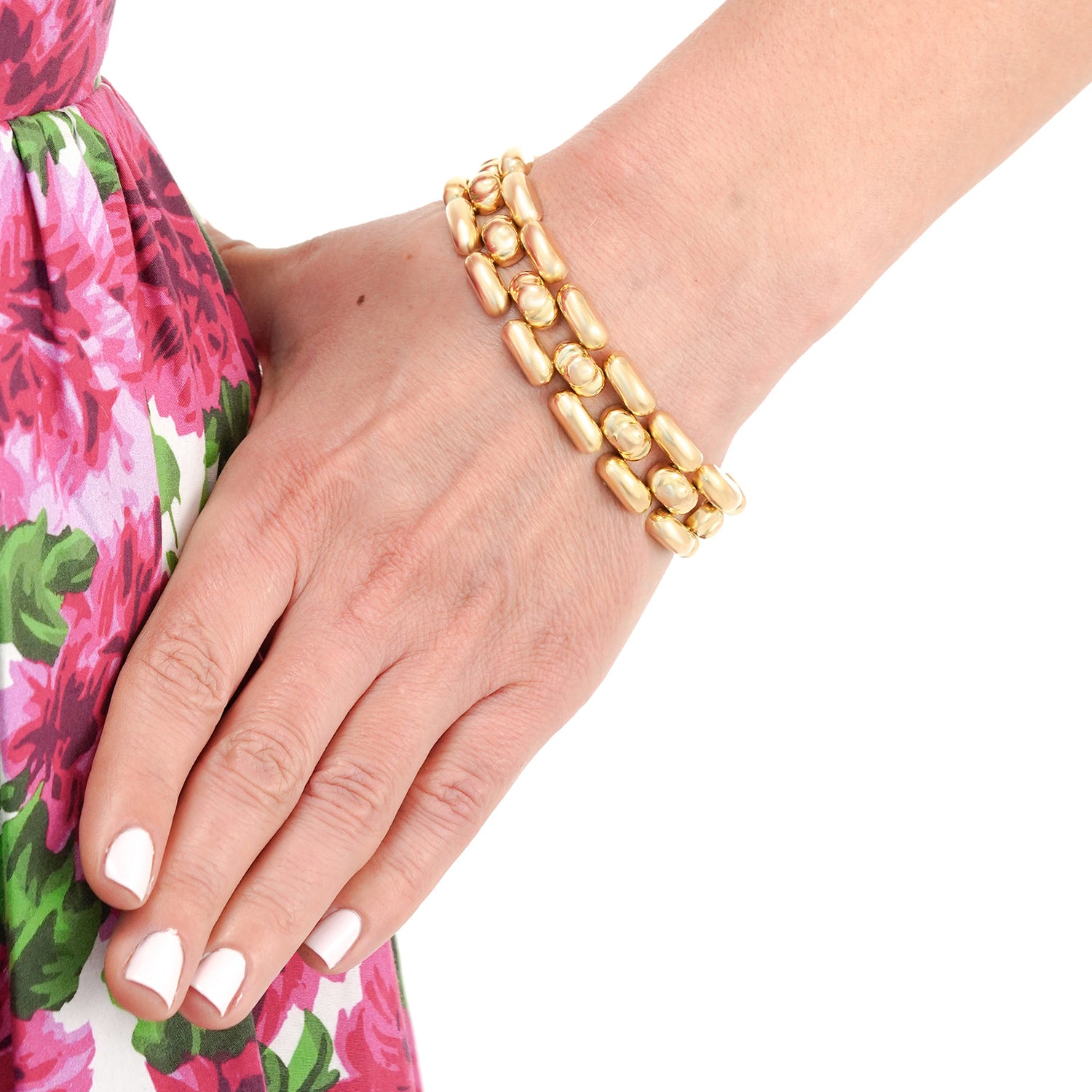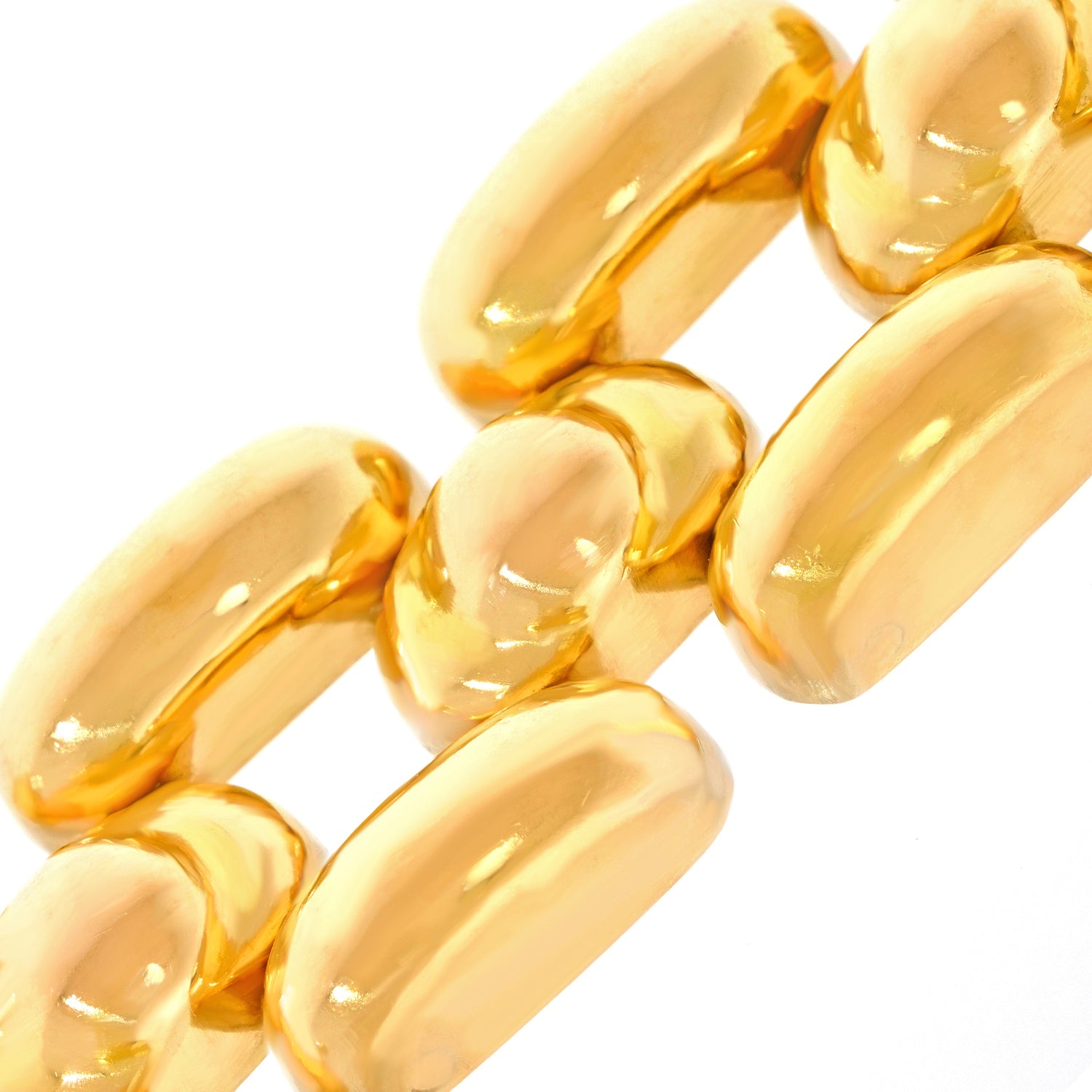Circa 1920s, 18k. Art Deco design and chunky dimensionality come together in this stylish 1920s bracelet. Beautiful and well-made in 18k yellow gold, the look is fearlessly fresh. This brilliant example of early twentieth-century American jewelry is in excellent condition.
