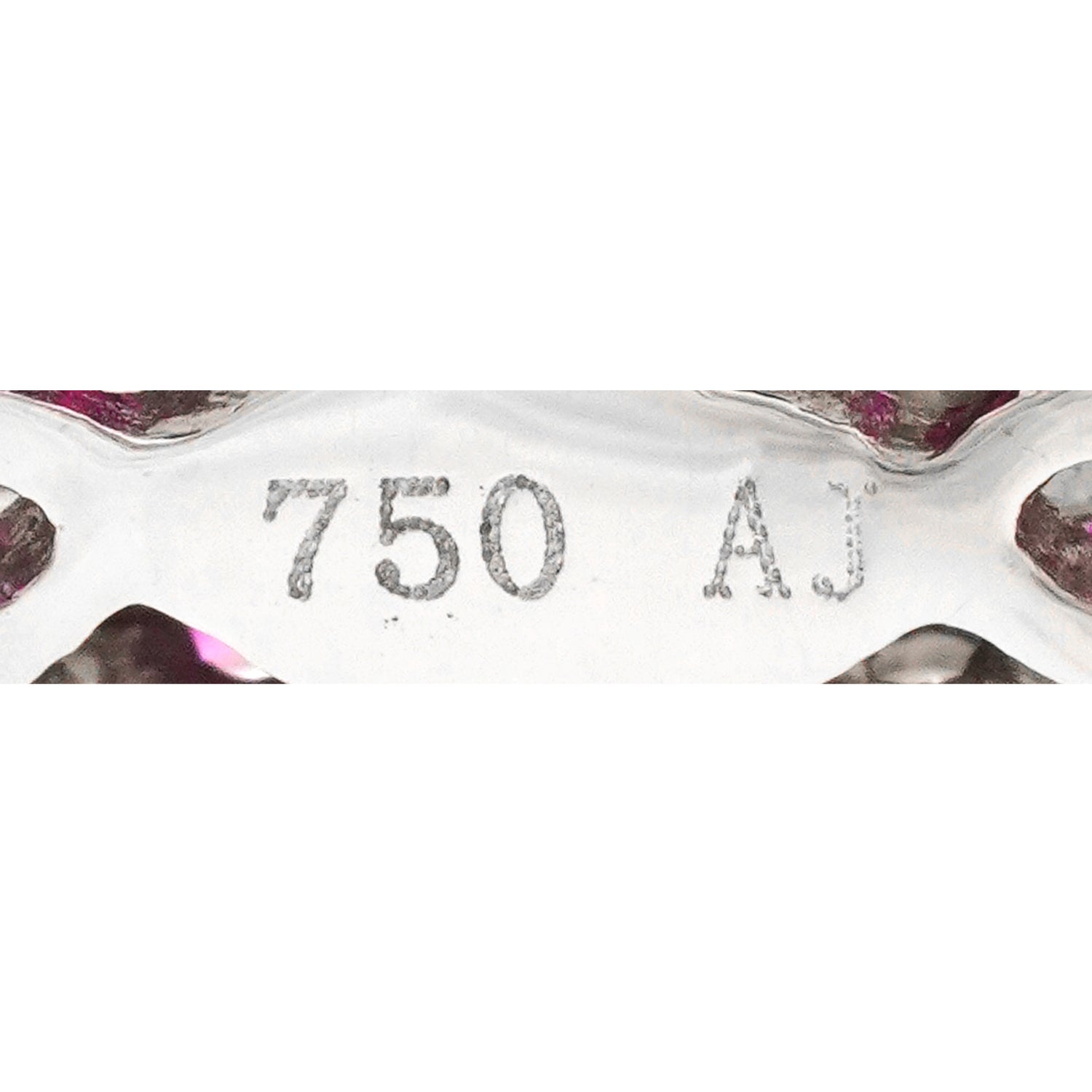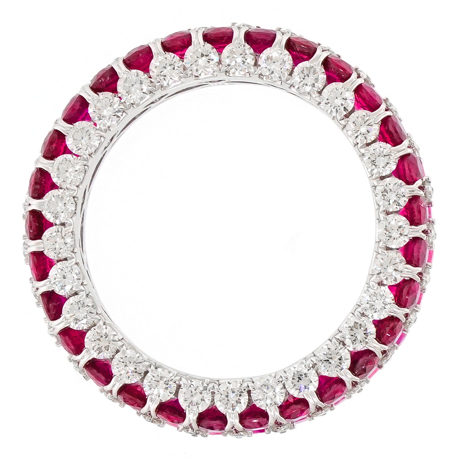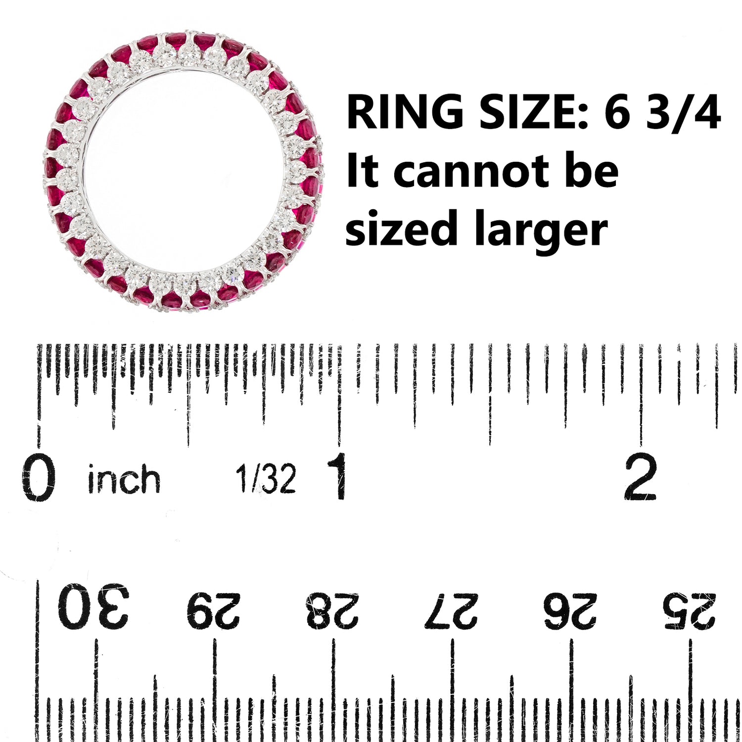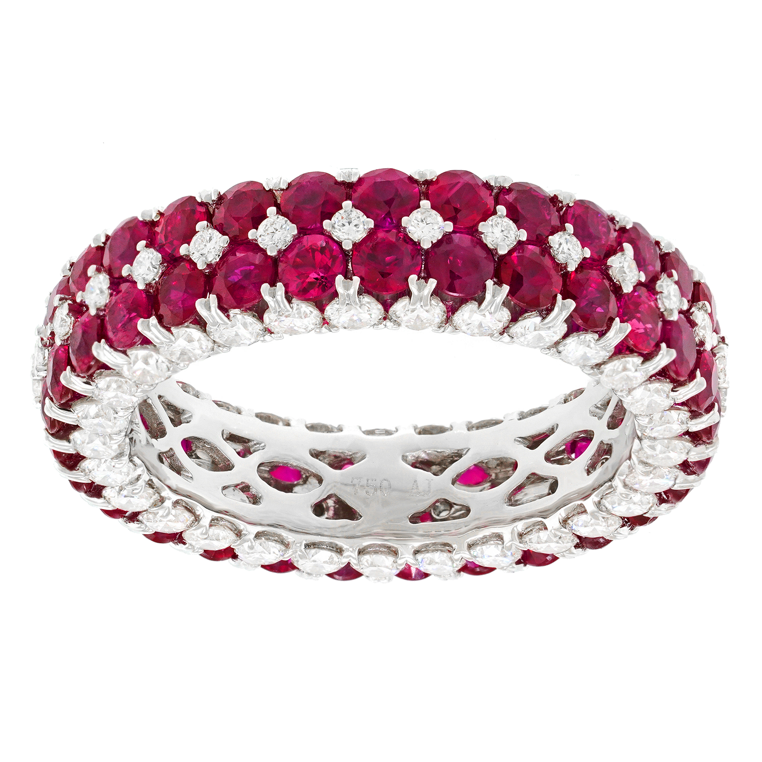 Circa 2000s, 18k, American. Set with 4.0 carats of superb rubies and 2.0 carats of fine white diamonds (F color and VS clarity), this spectacular ring is all about amazing color and playfully unique visual dimension. Every surface of this eternity band is set with striking sparkly stones. The design is fabulous, the construction is superb, and the condition excellent.