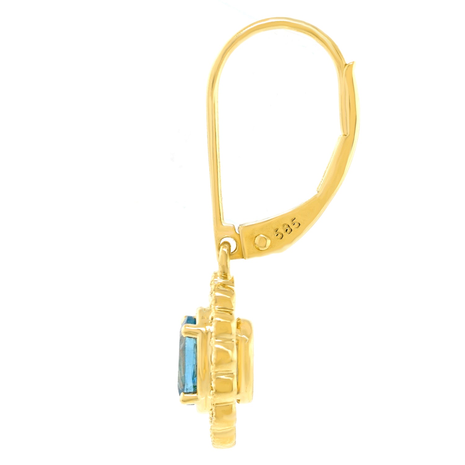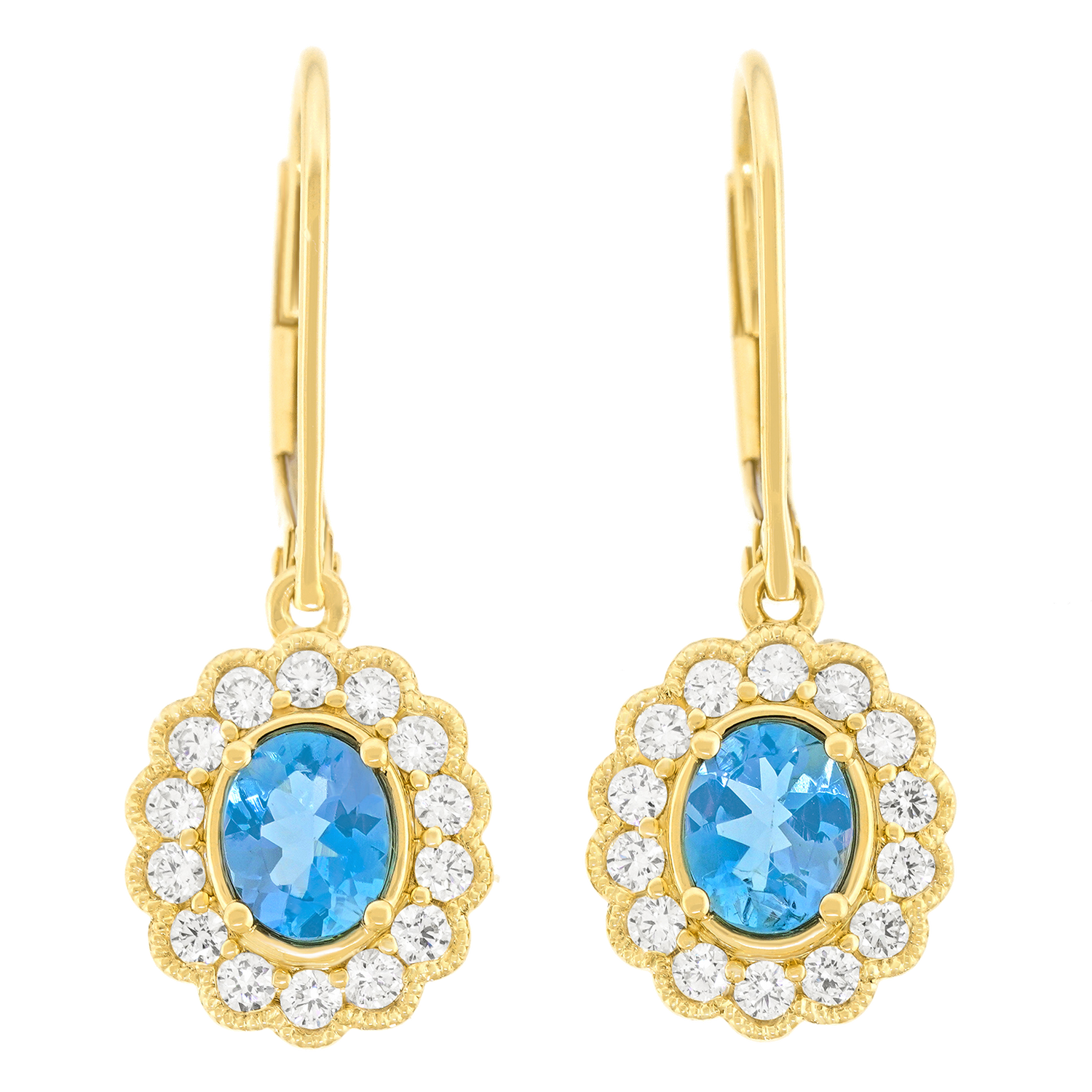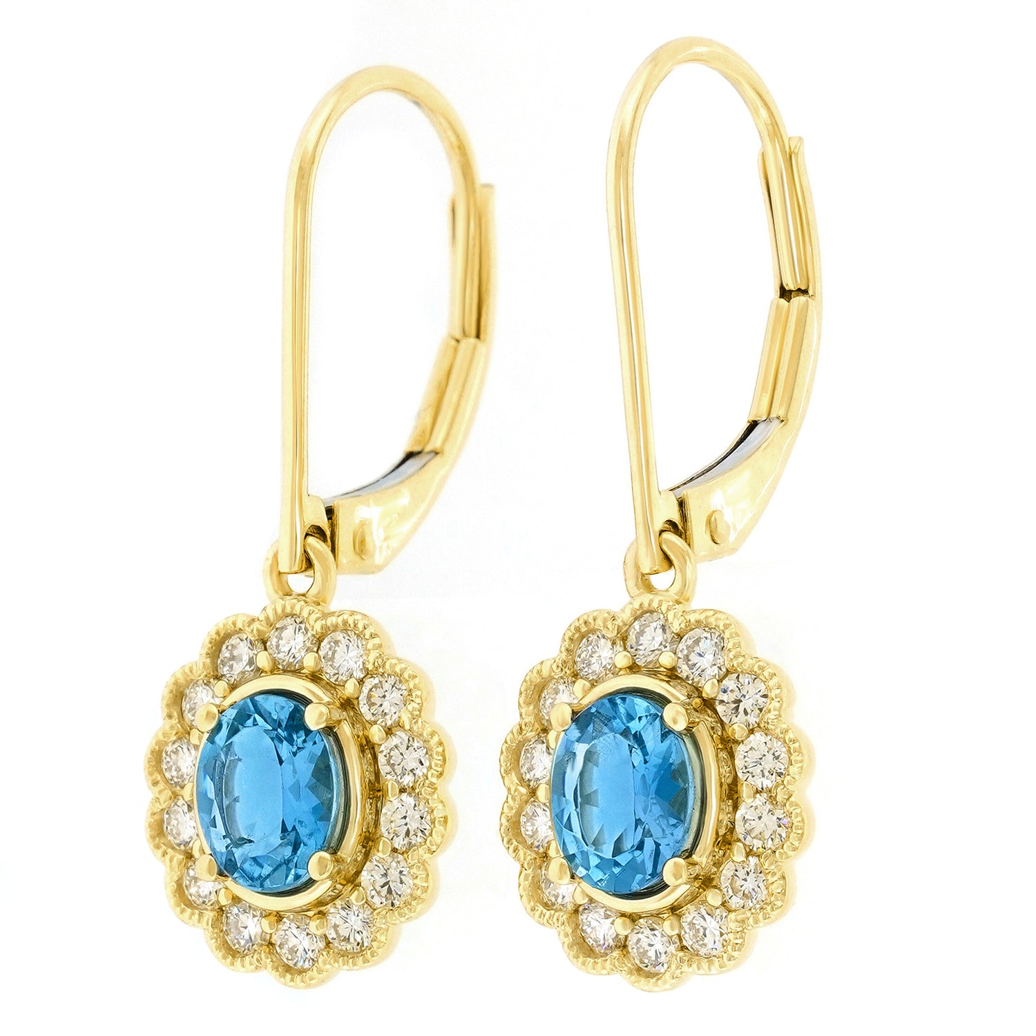 Circa 2000s, 14k, American. These elegant drop earrings are set with .90 carats of deep blue aquamarines surrounded by brilliant white diamonds (.40 carats of G color, SI1 clarity). Finely fabricated and well designed in 14k yellow gold, I especially love their eye-catching movement. Excellent condition.