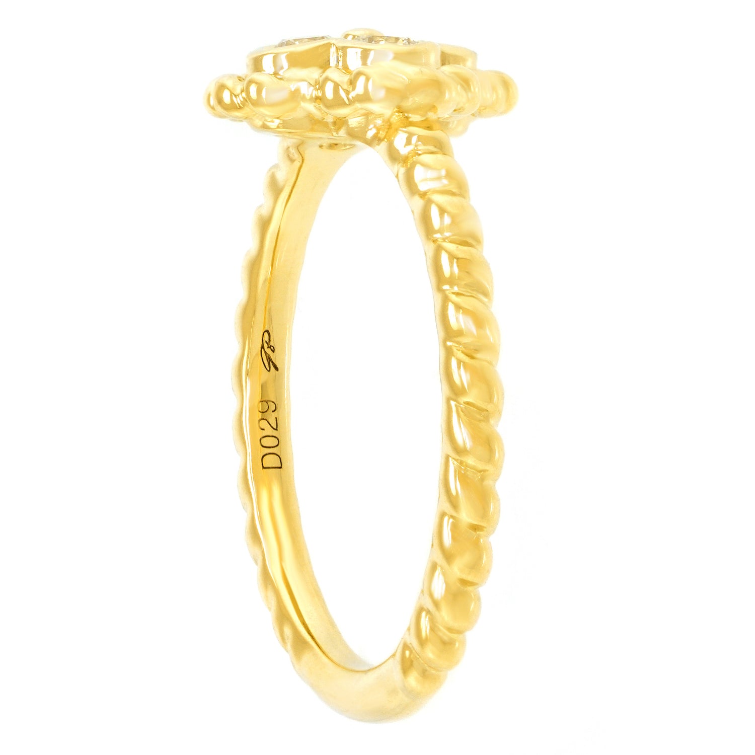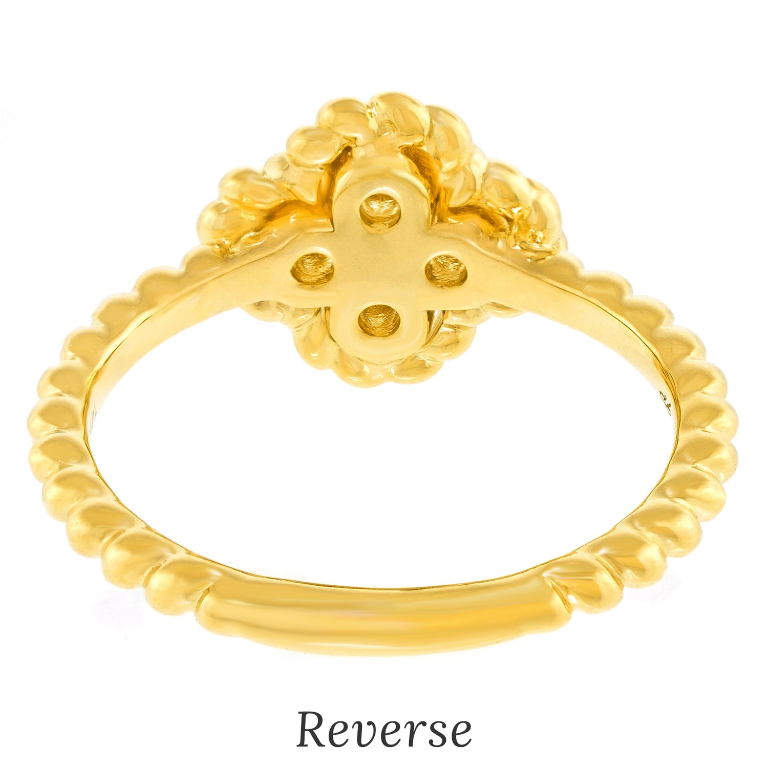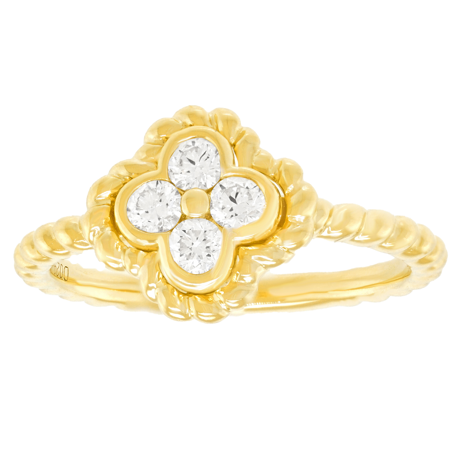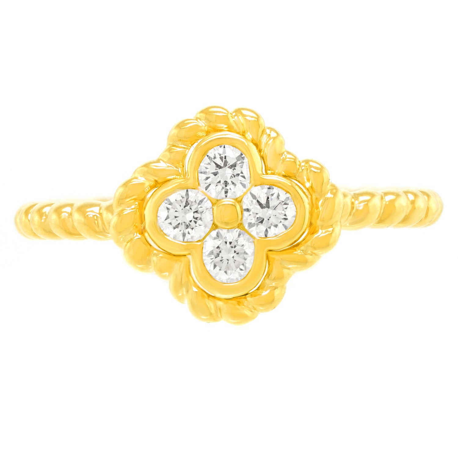Circa 2000s, 14k, American. This diamond-set clover motif ring is fabulous. With.35 carats total weight of dazzling color and clarity diamonds (G color VS clarity), it catches the light from every direction. Heels and jeans or your favorite cocktail dress, it is perfect for every moment of fashion. Beautifully made in yellow gold, this ring in excellent condition.