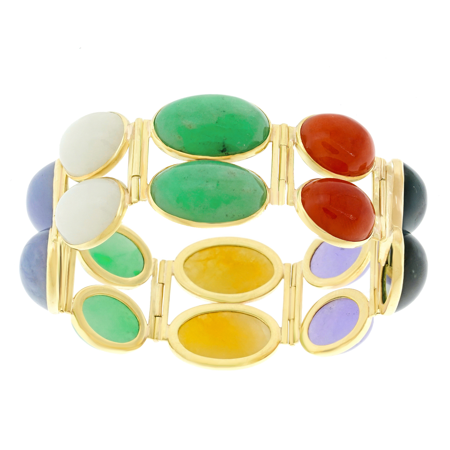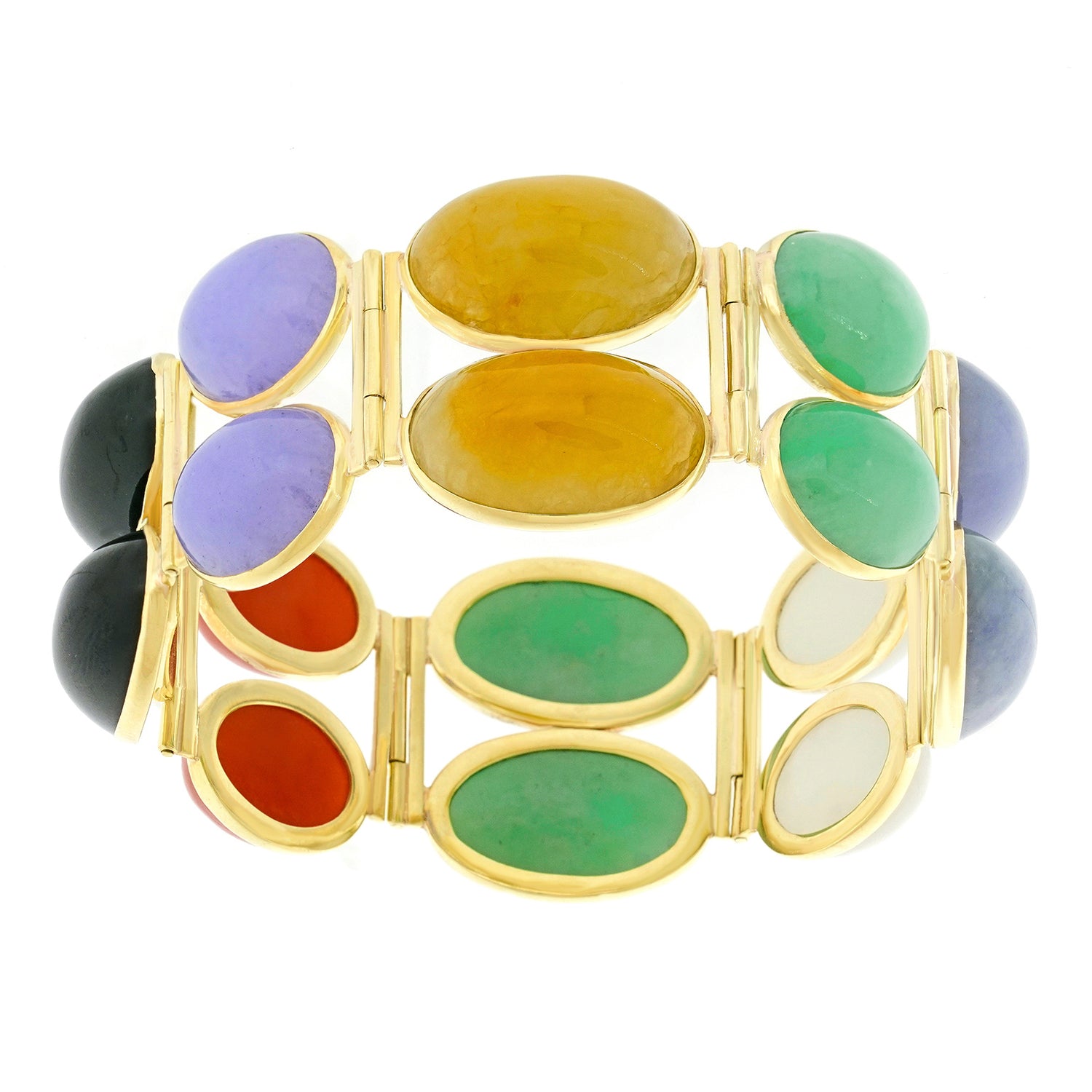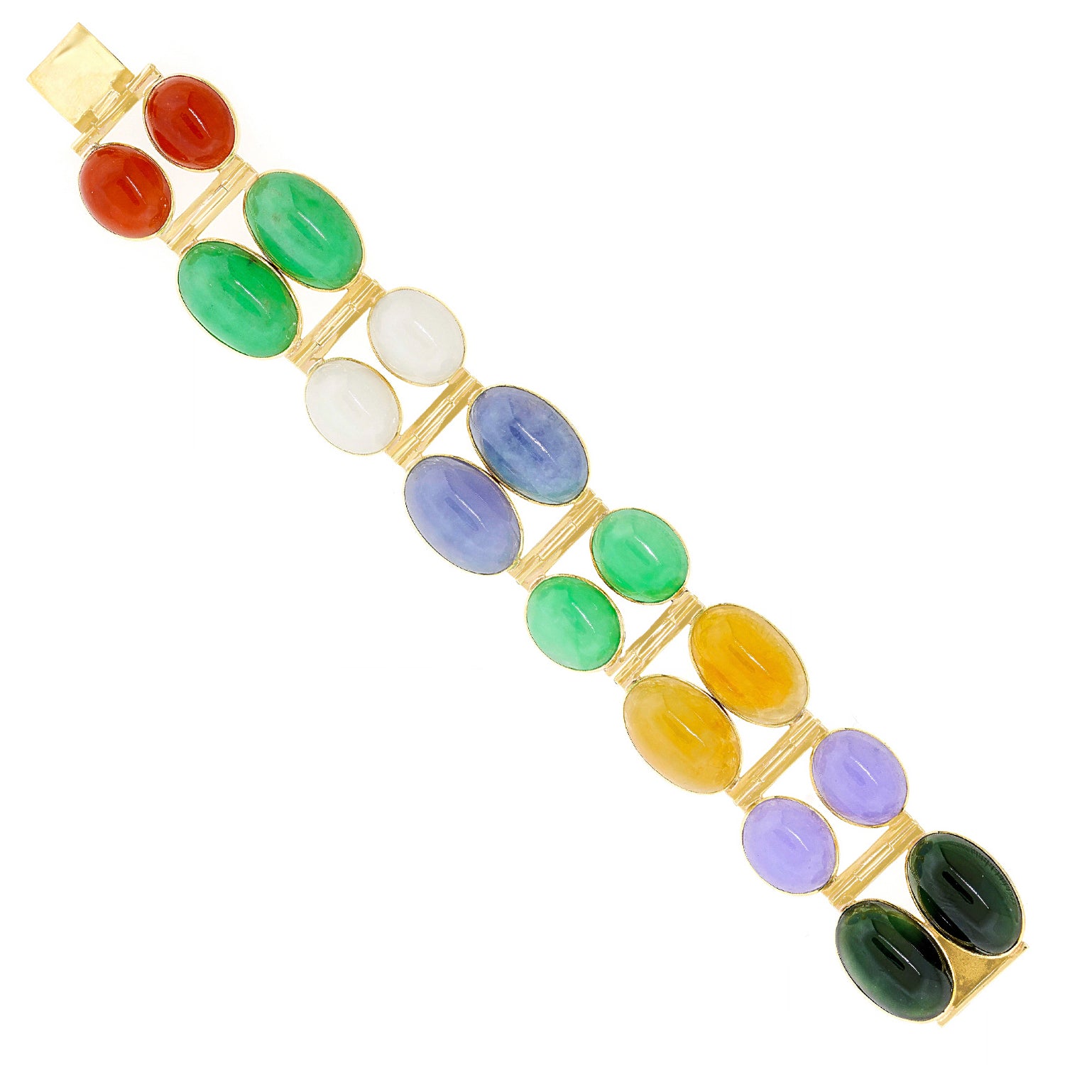 Circa 1920s, 14k, American. This brilliantly colorful American Art Deco bracelet is decorated with vibrant cabochon hardstones. The look has a visual primacy, playing with color and shape to a very, very, very stylish tune. Finely fashioned, it is in excellent condition.