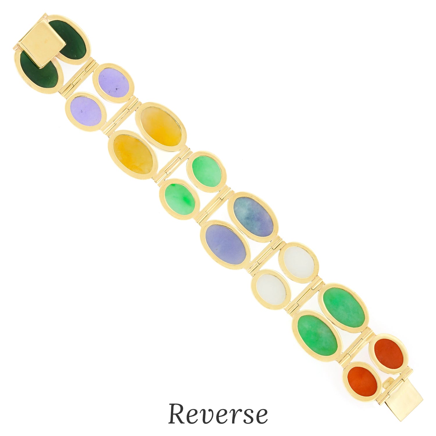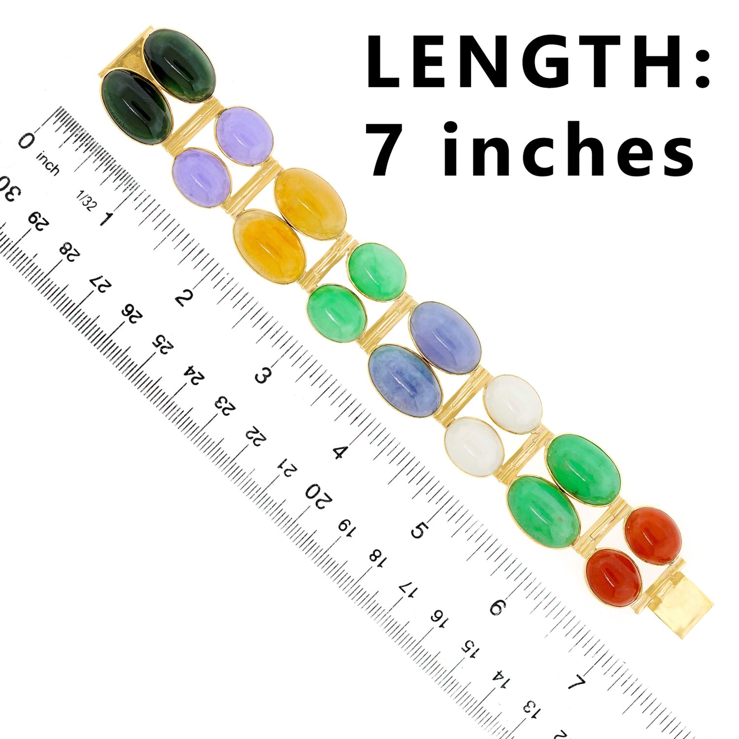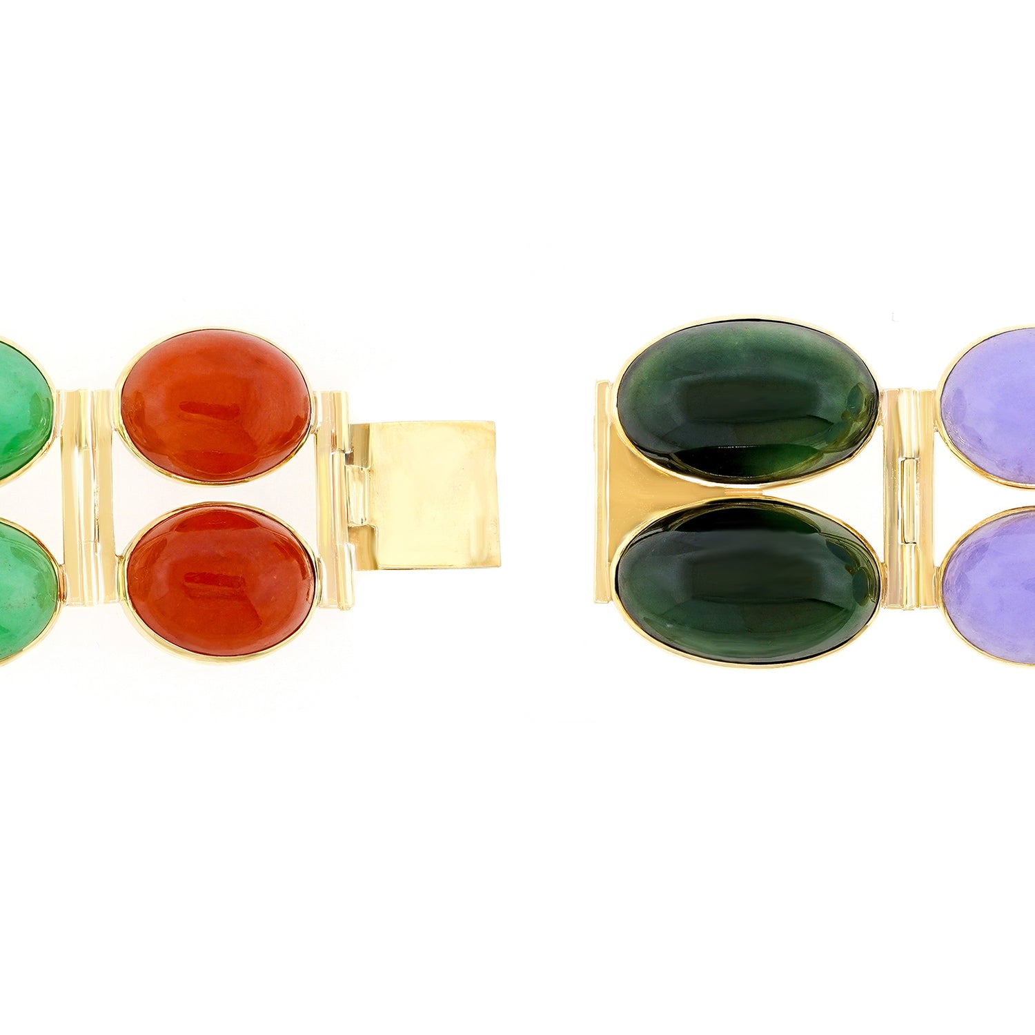 Circa 1920s, 14k, American. This brilliantly colorful American Art Deco bracelet is decorated with vibrant cabochon hardstones. The look has a visual primacy, playing with color and shape to a very, very, very stylish tune. Finely fashioned, it is in excellent condition.