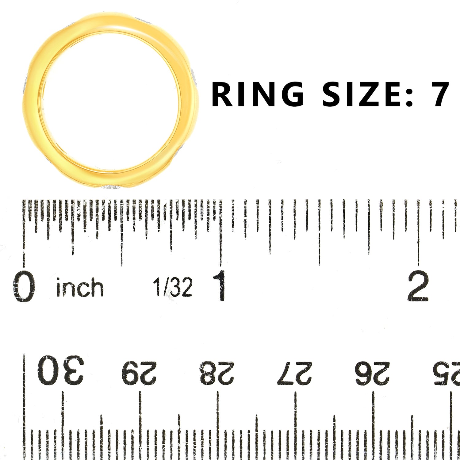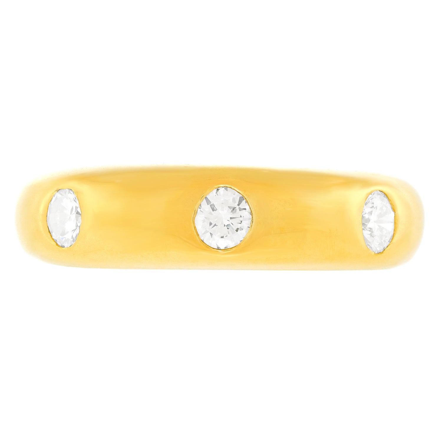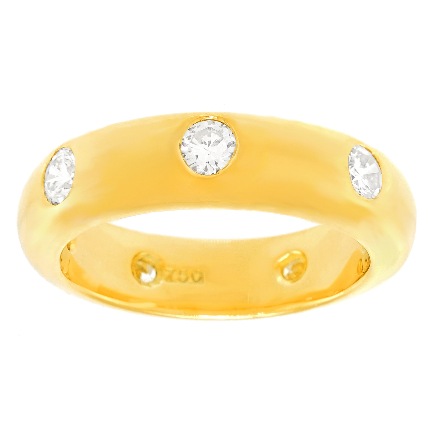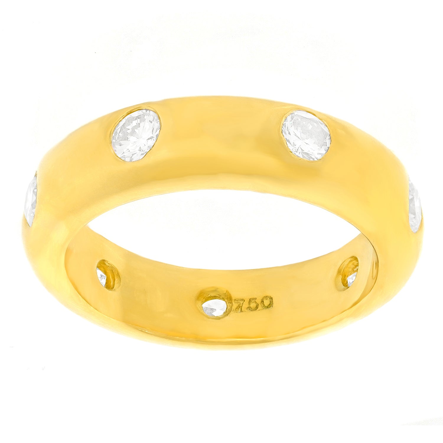 Circa 1990s, 18k, American. This bold ring features 1.0 carats of fine white diamonds (G-H color, VS clarity) evenly set around the band. The look is timeless, casual gold with a shimmer of diamonds. The feel of this ring on the hand is heavy yet comfortable. Made to last a lifetime, this jewel is in excellent condition.