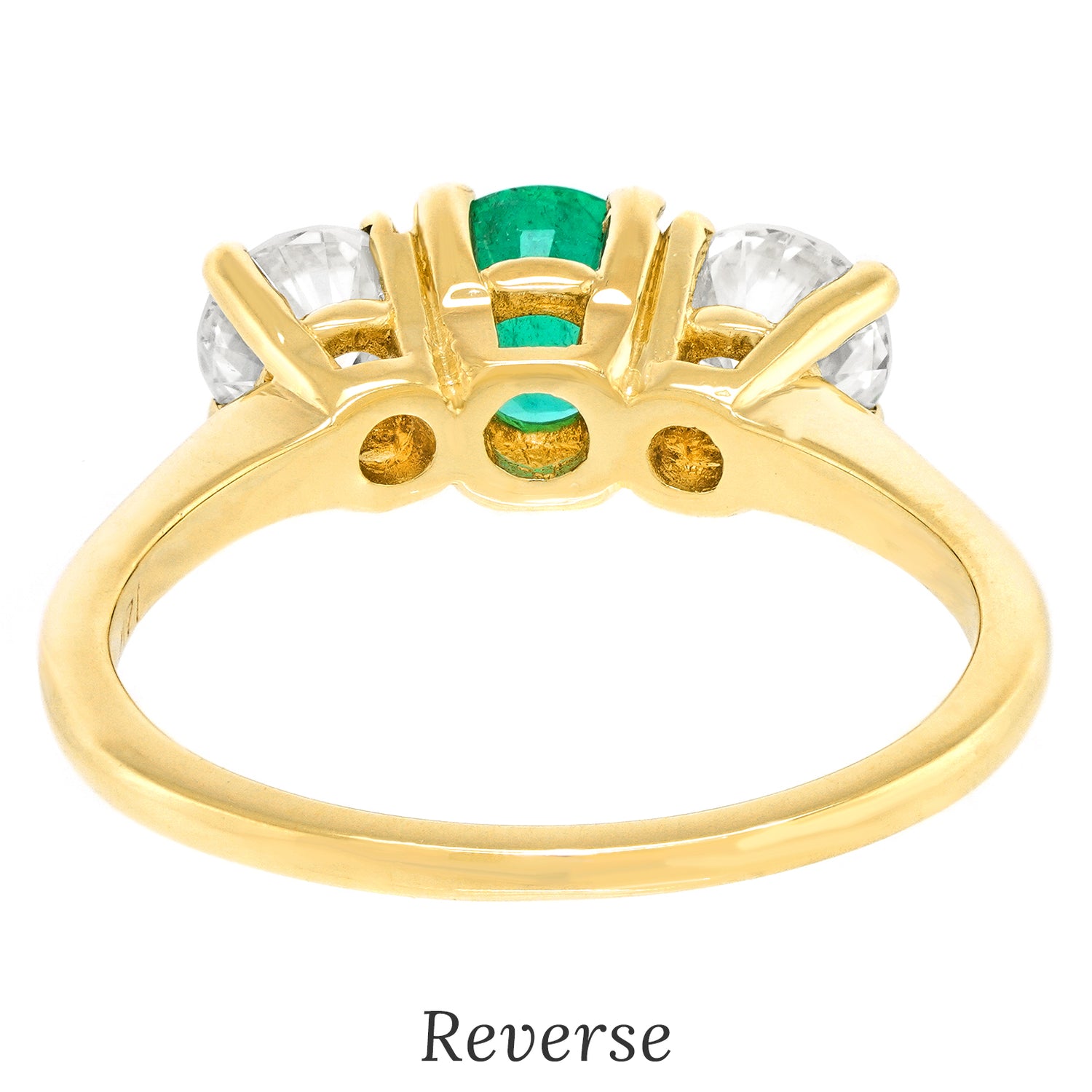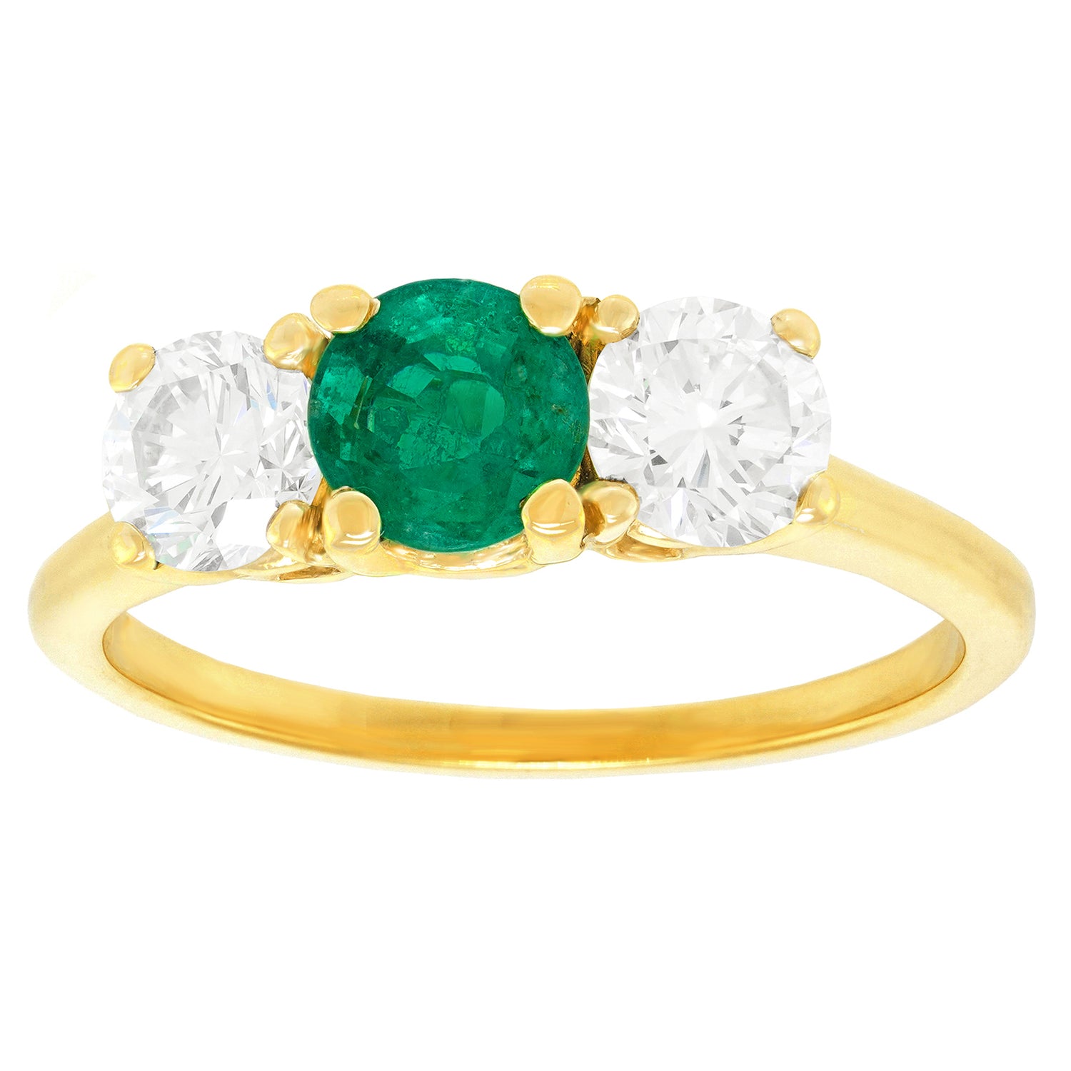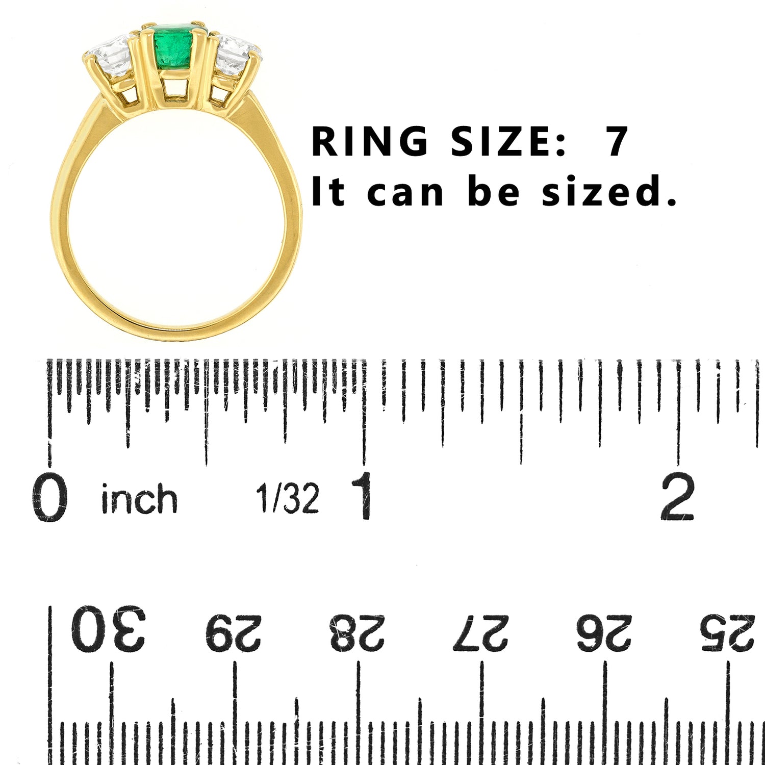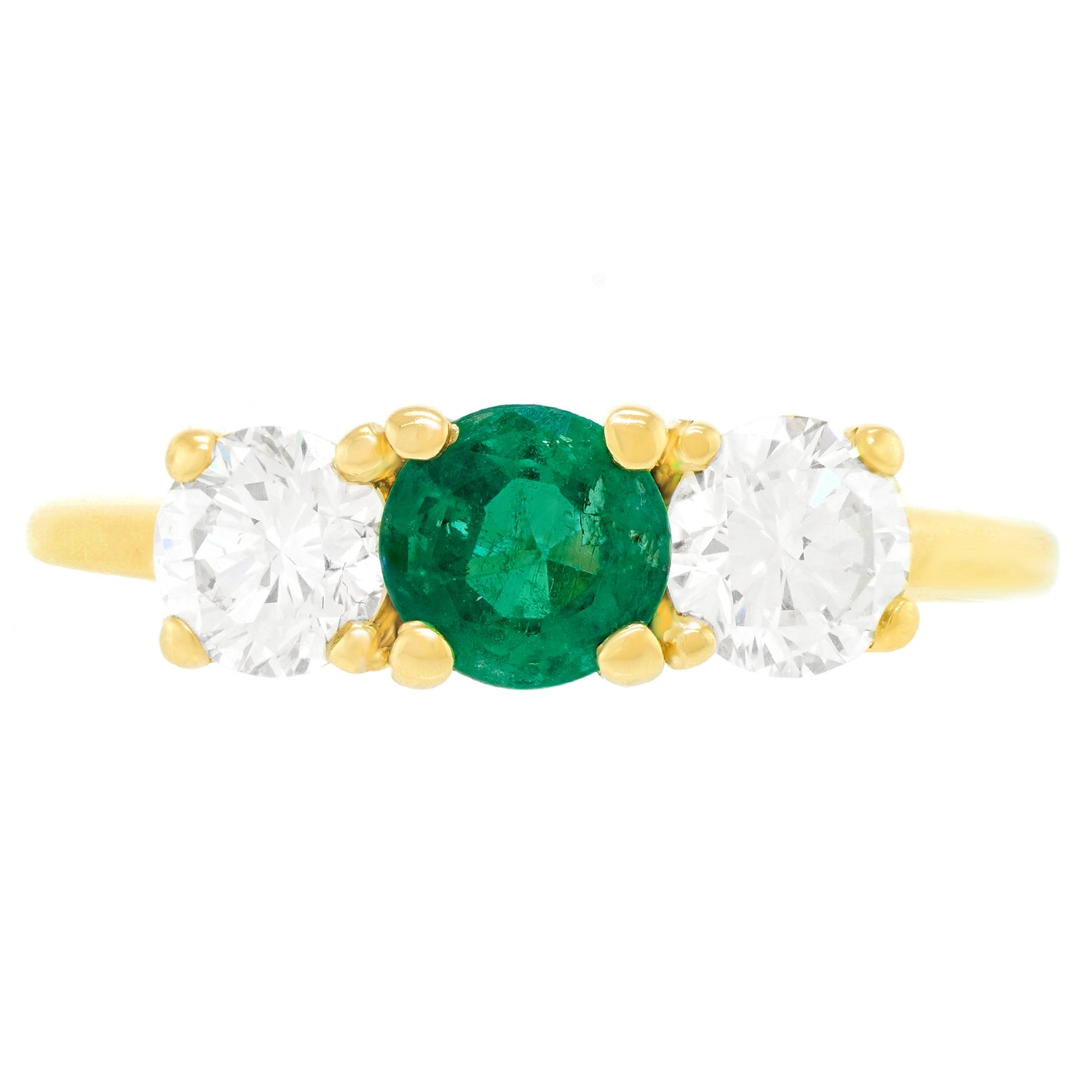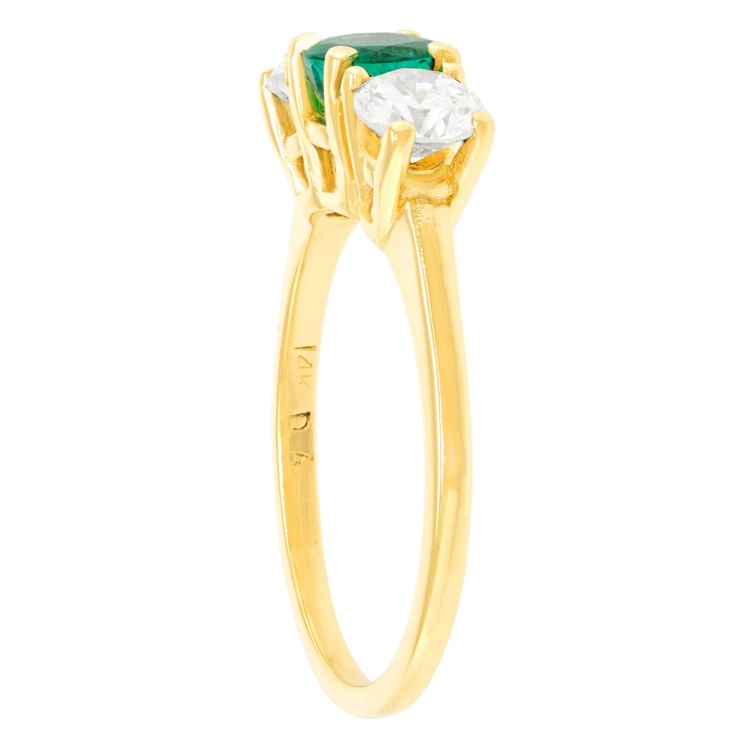 Circa 1960s, 14k, American. This classic three stone ring is set with a stunning .40 carat emerald and two brilliant white diamonds (.46ct and .42ct, I color, SI1 clarity) . Classic good looks underscored by fine quality make this ring a standout. Excellent condition.