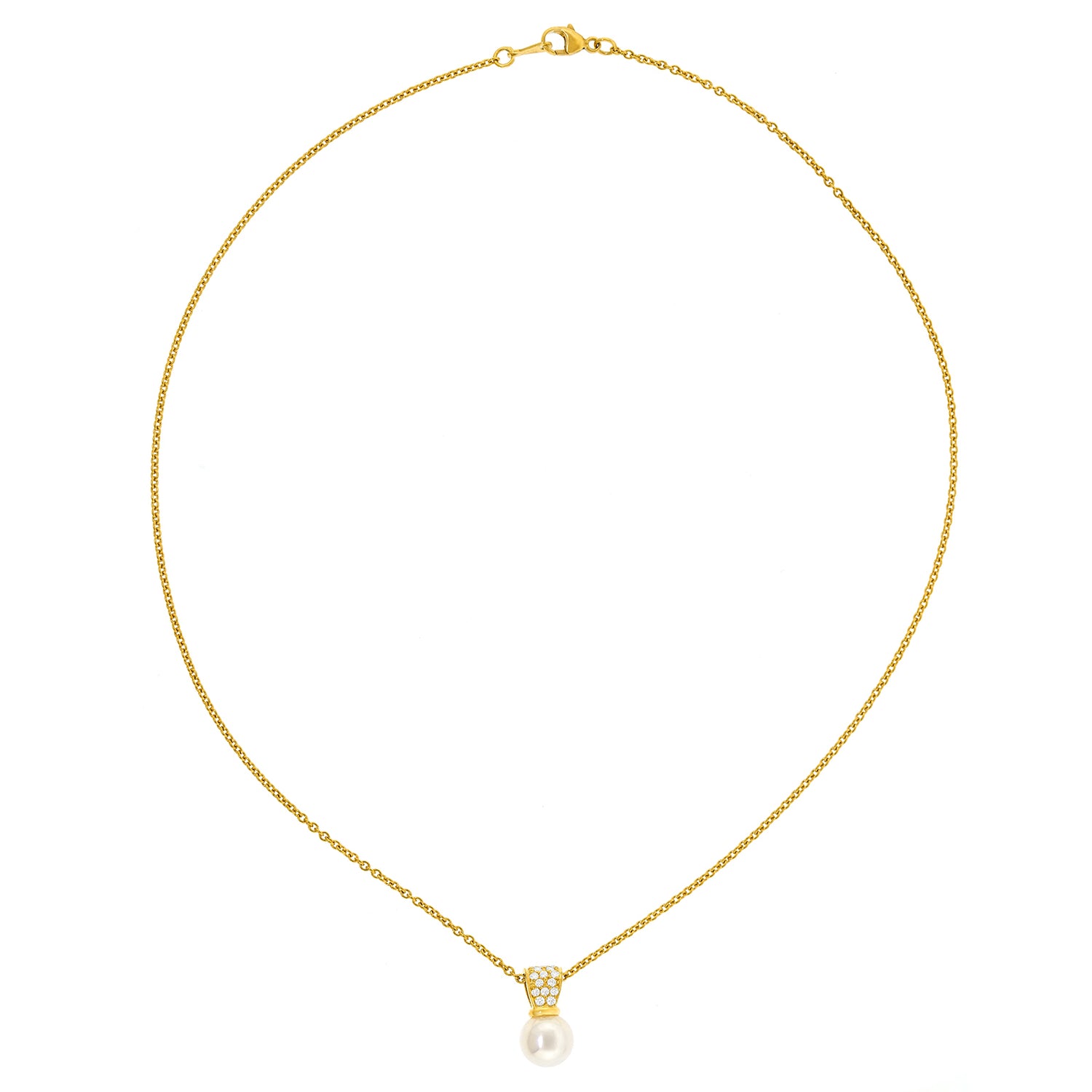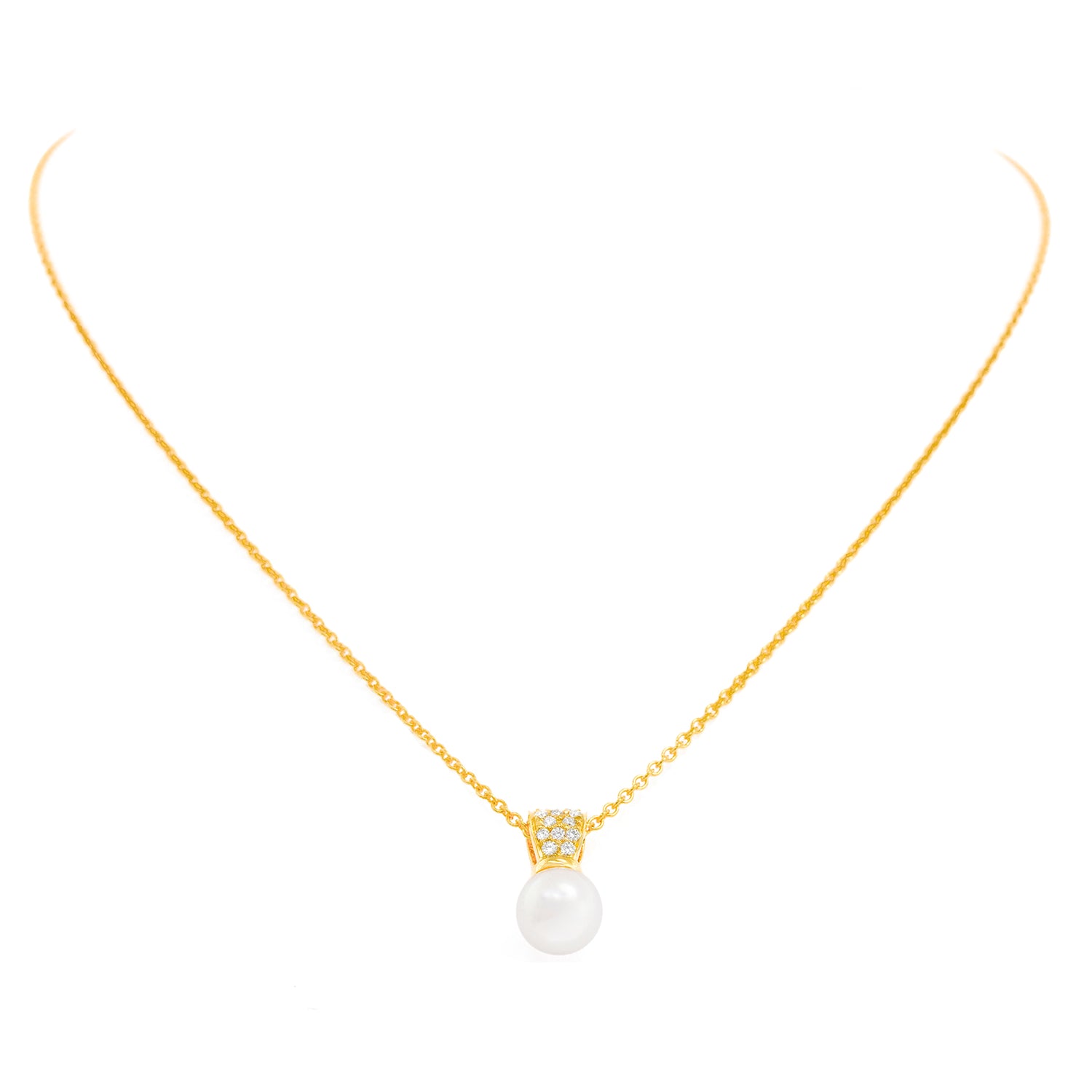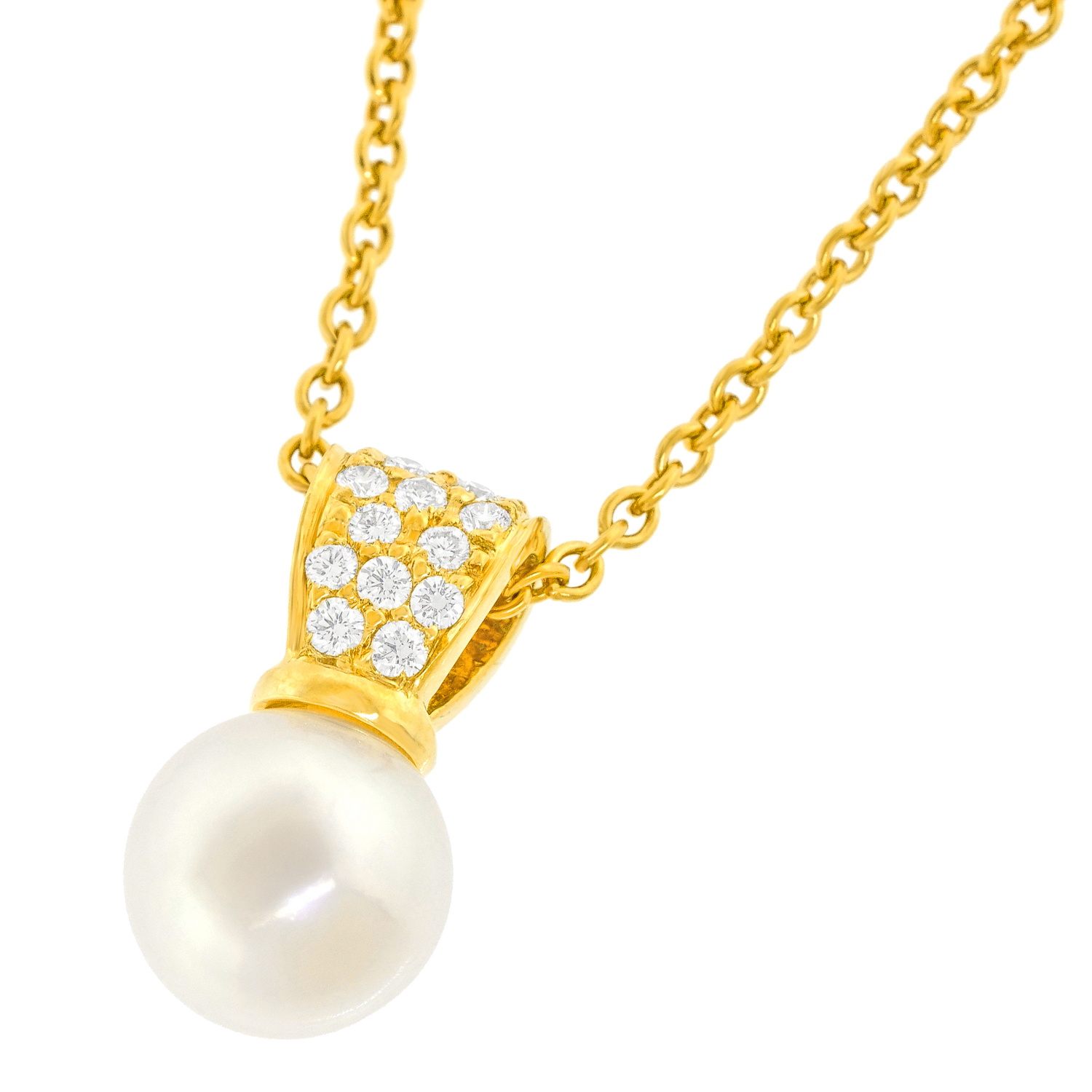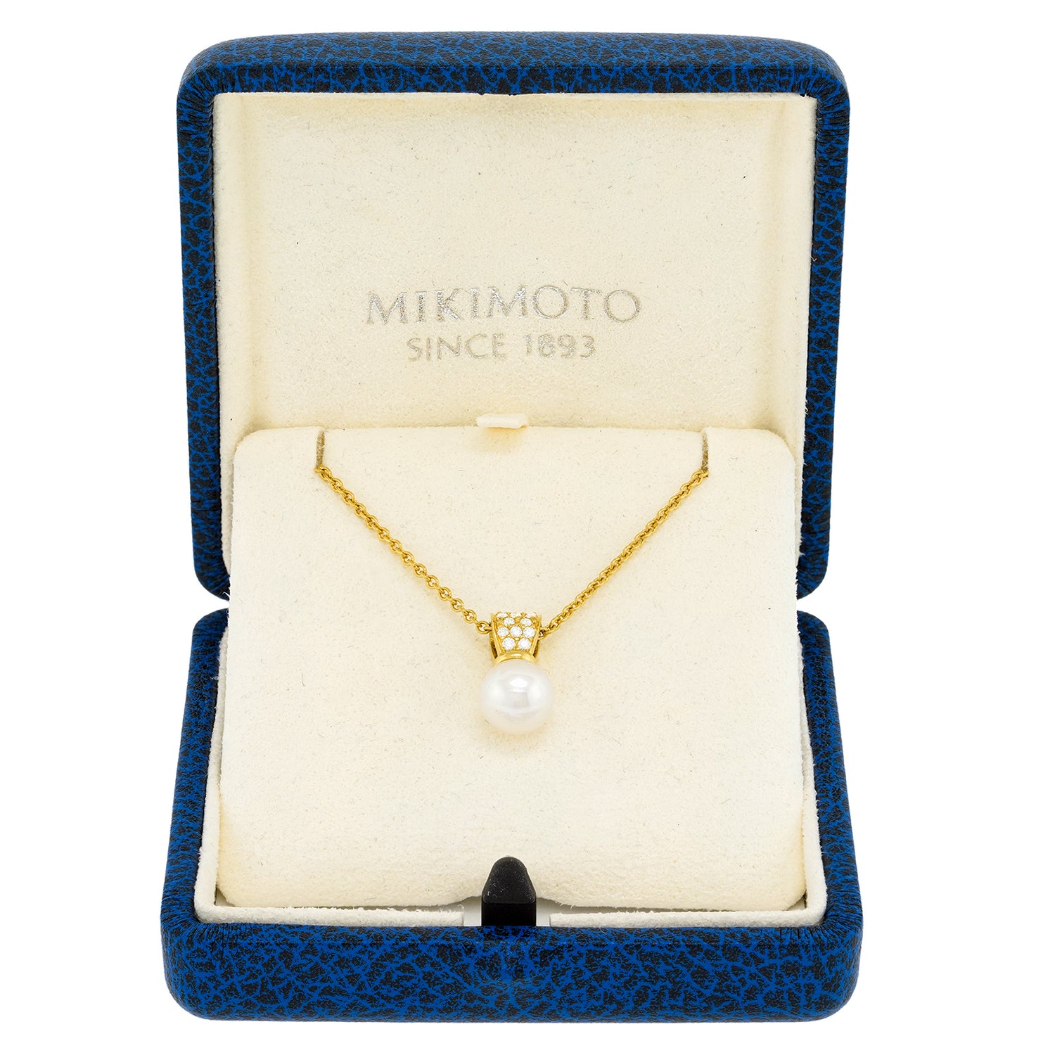 Circa 1990s, 18k, by Mikimoto, Japan. A fine example of Mikimoto' s diamond and pearl jewelry, this pendant features a gorgeous akoya pearl and .25 carats of superb white diamonds (G color, VS clarity). Excellent condition. The chain is included and original. Noted, comes in original box.