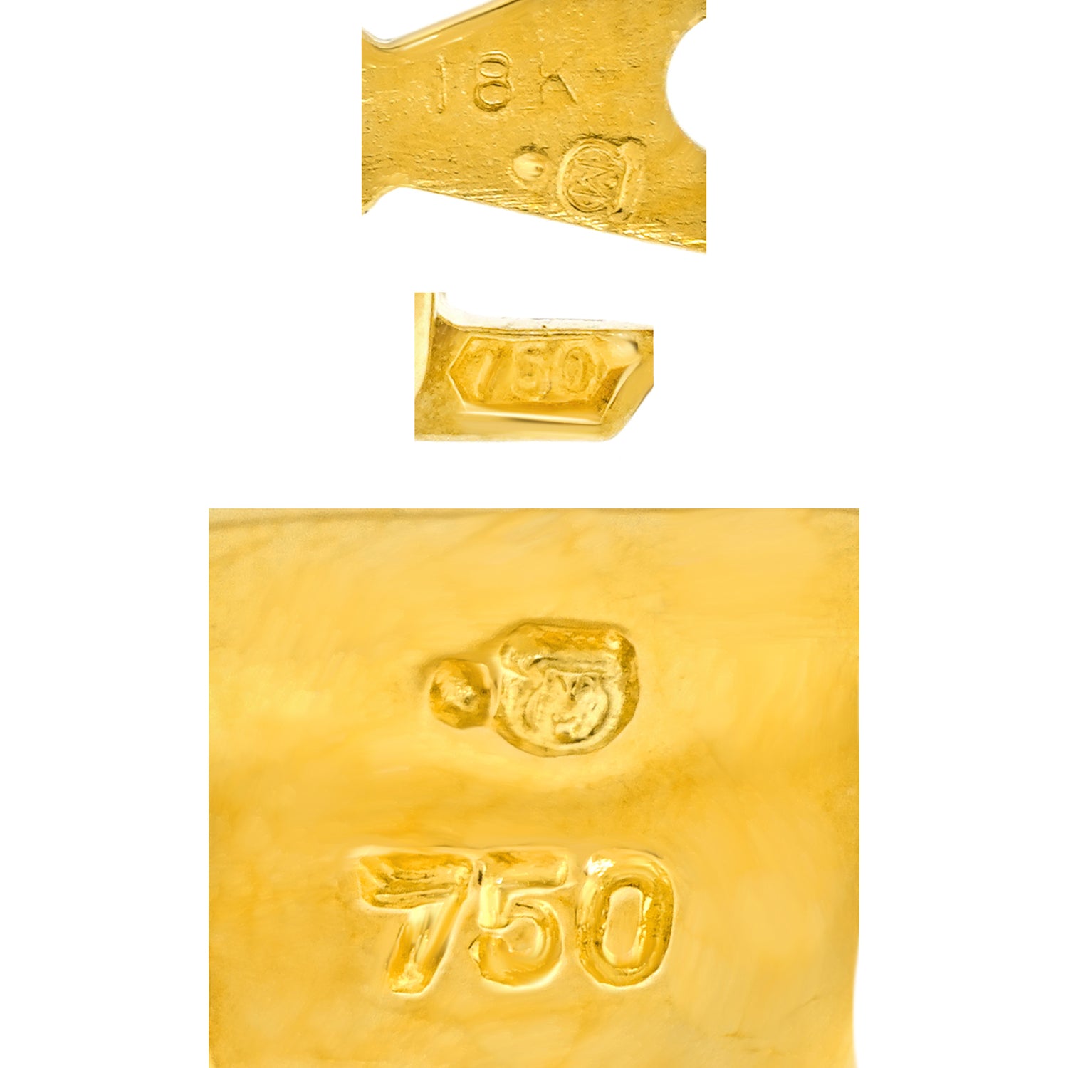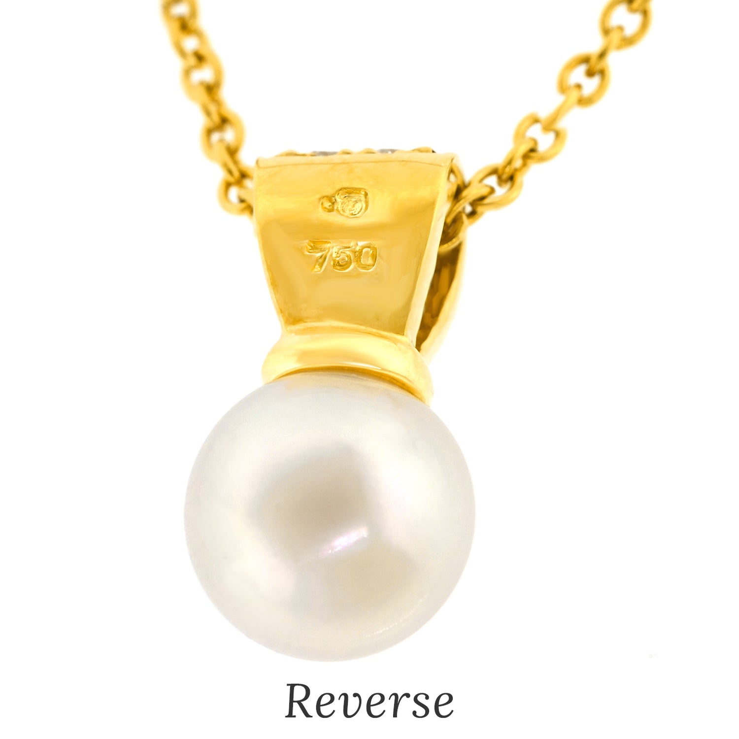 M in a clamshell maker's mark for Mikimoto and 750 for 18k on pendant and maker's mark for Mikimoto and 18k on chain.