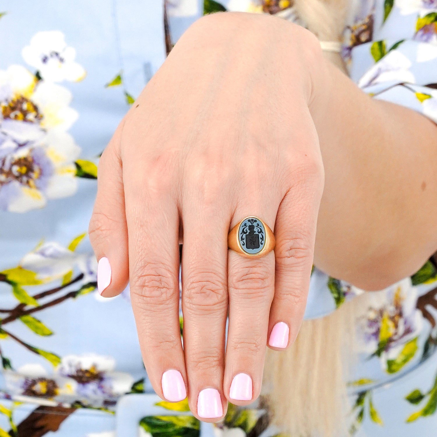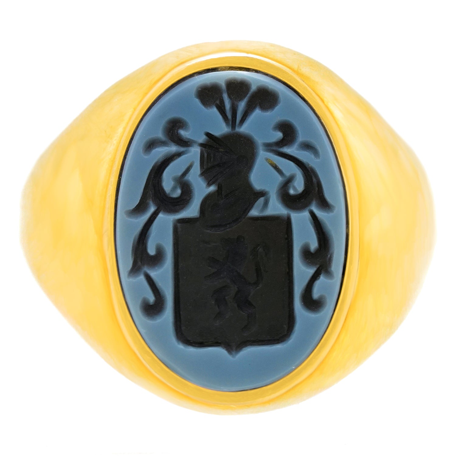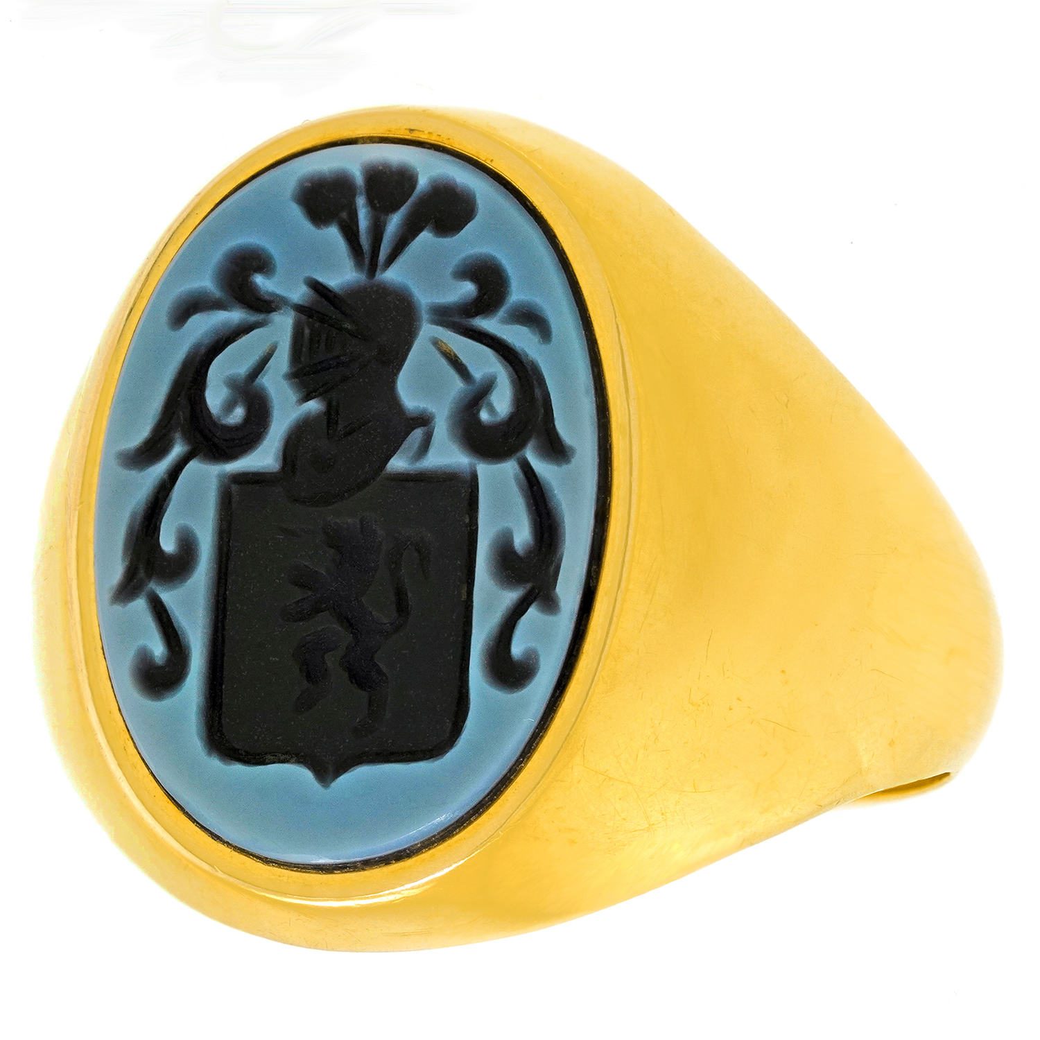 Circa 1960s, 18k, possibly Swiss. This classic signet ring is set with an intaglio-cut blue agate. Effortlessly everyday, the look is town and country chic. It is decorated with a crisp coat of arms, well made, and in excellent condition.