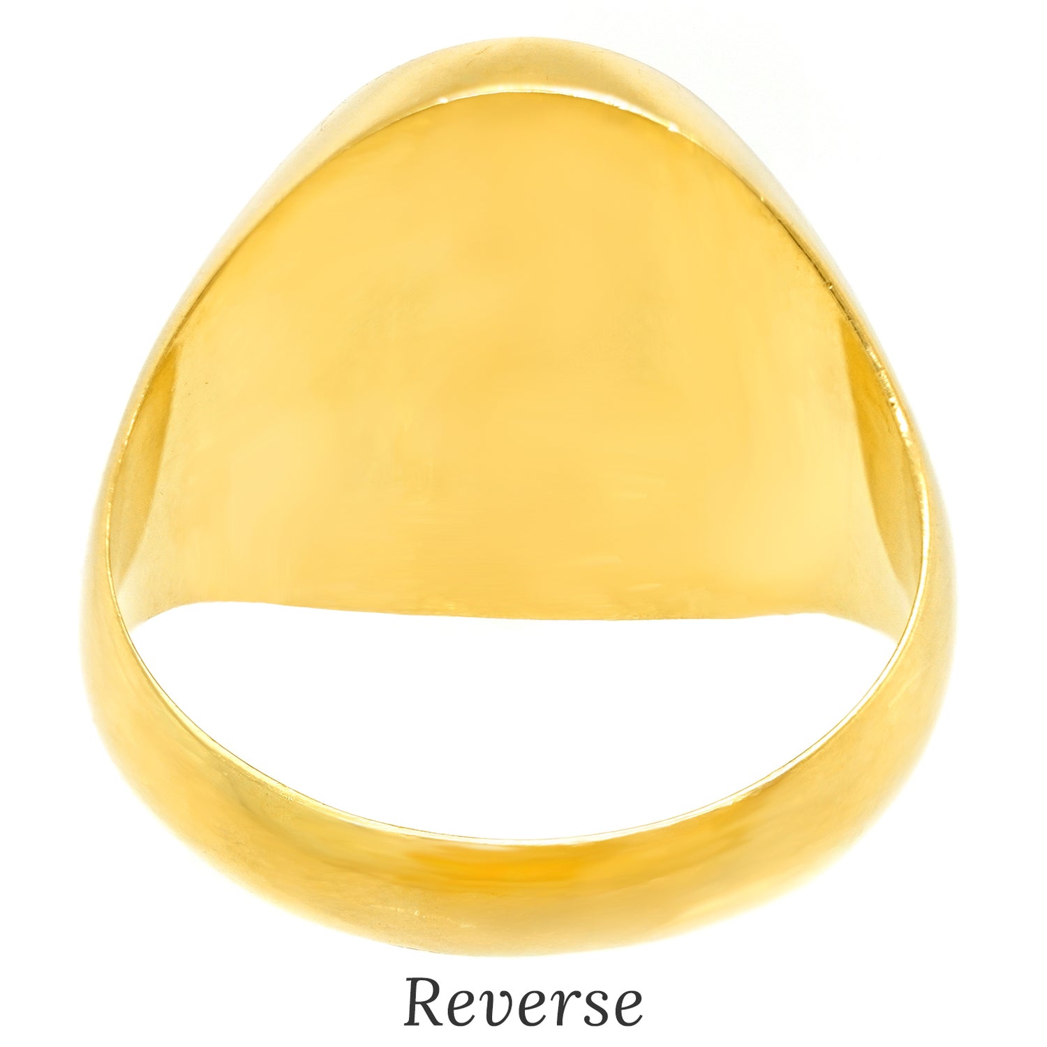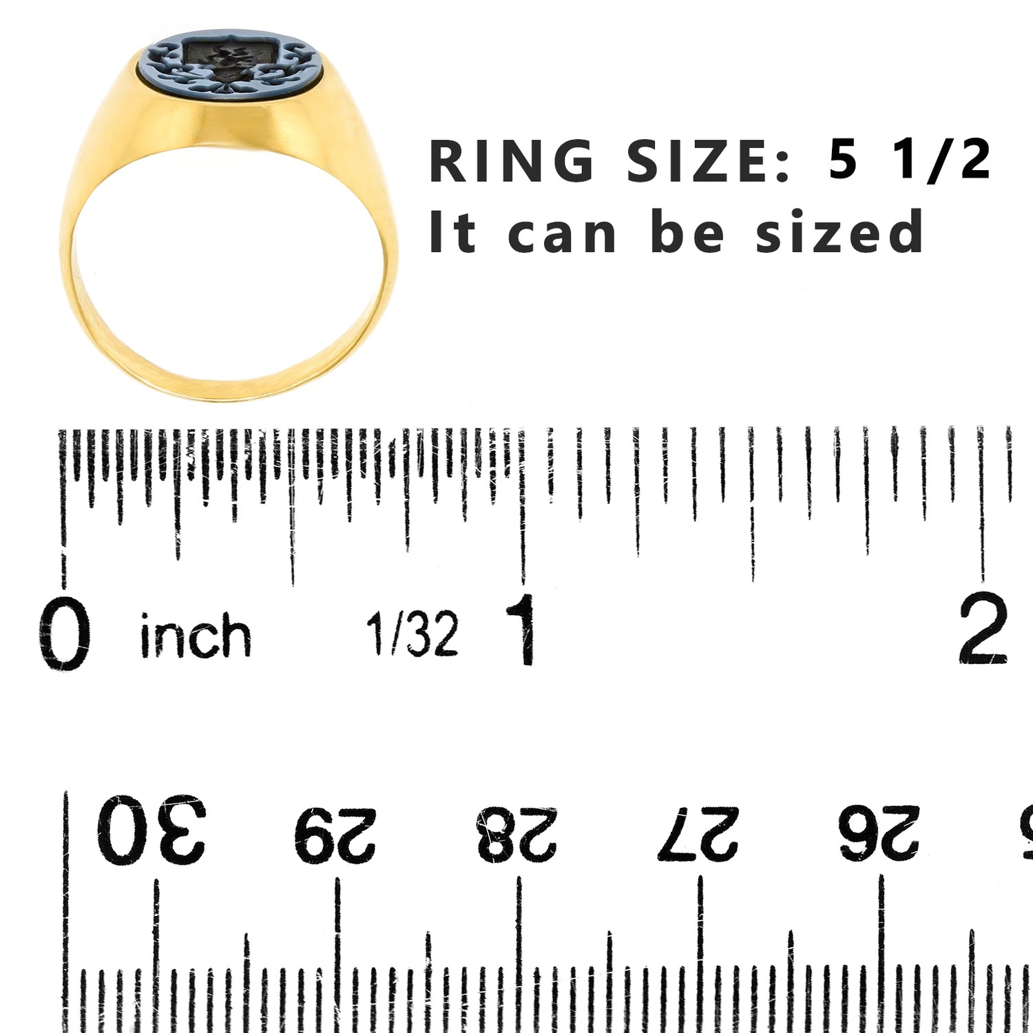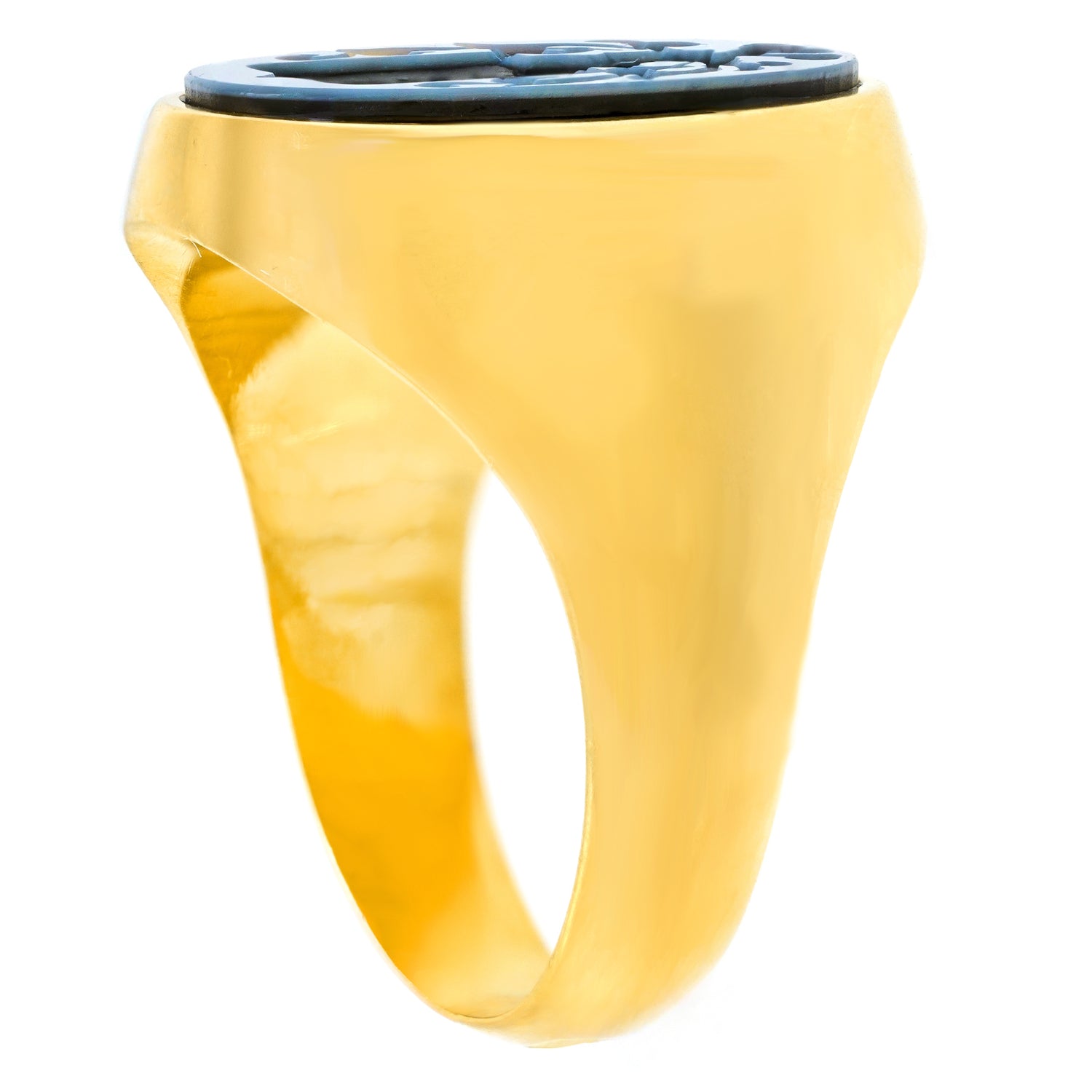 Circa 1960s, 18k, possibly Swiss. This classic signet ring is set with an intaglio-cut blue agate. Effortlessly everyday, the look is town and country chic. It is decorated with a crisp coat of arms, well made, and in excellent condition.