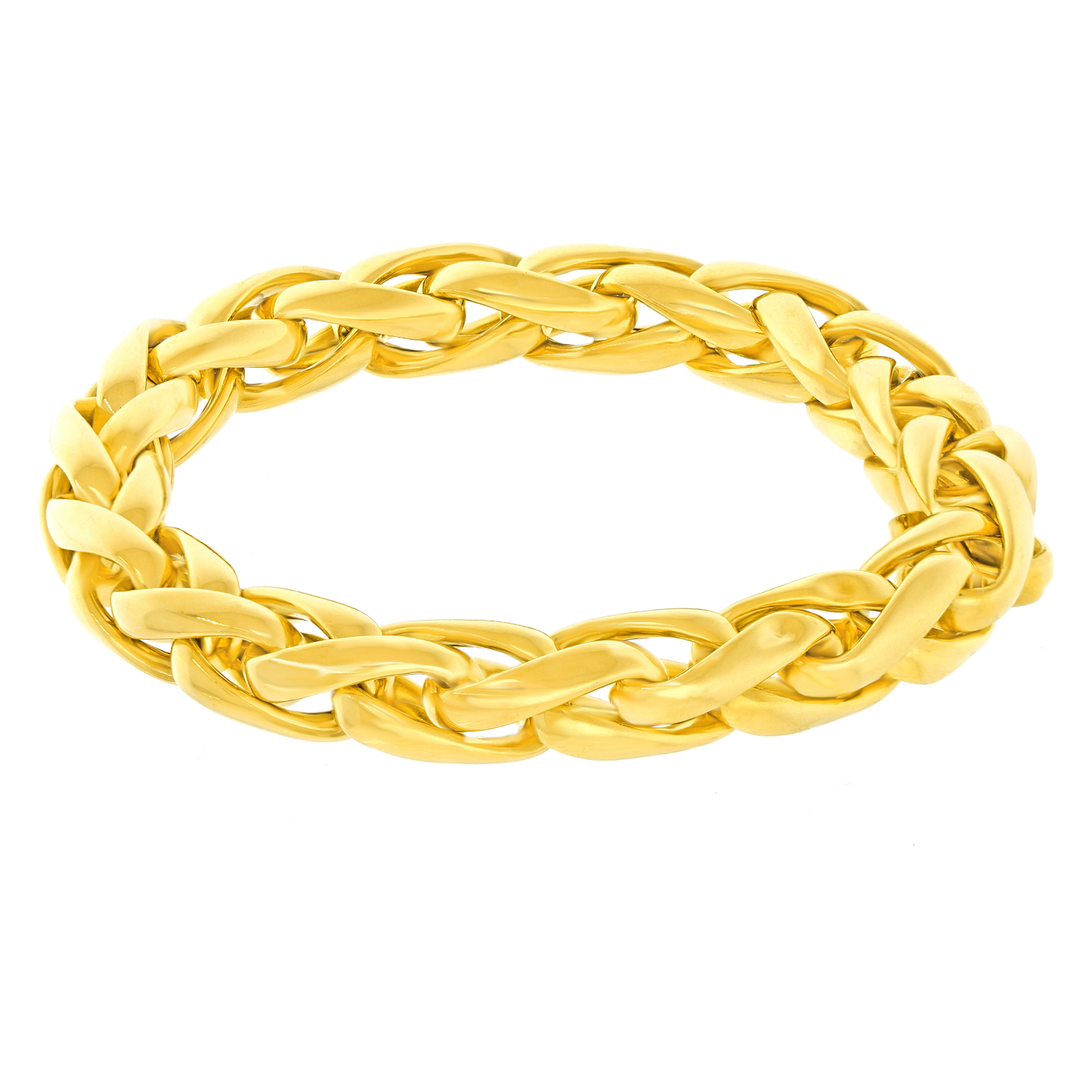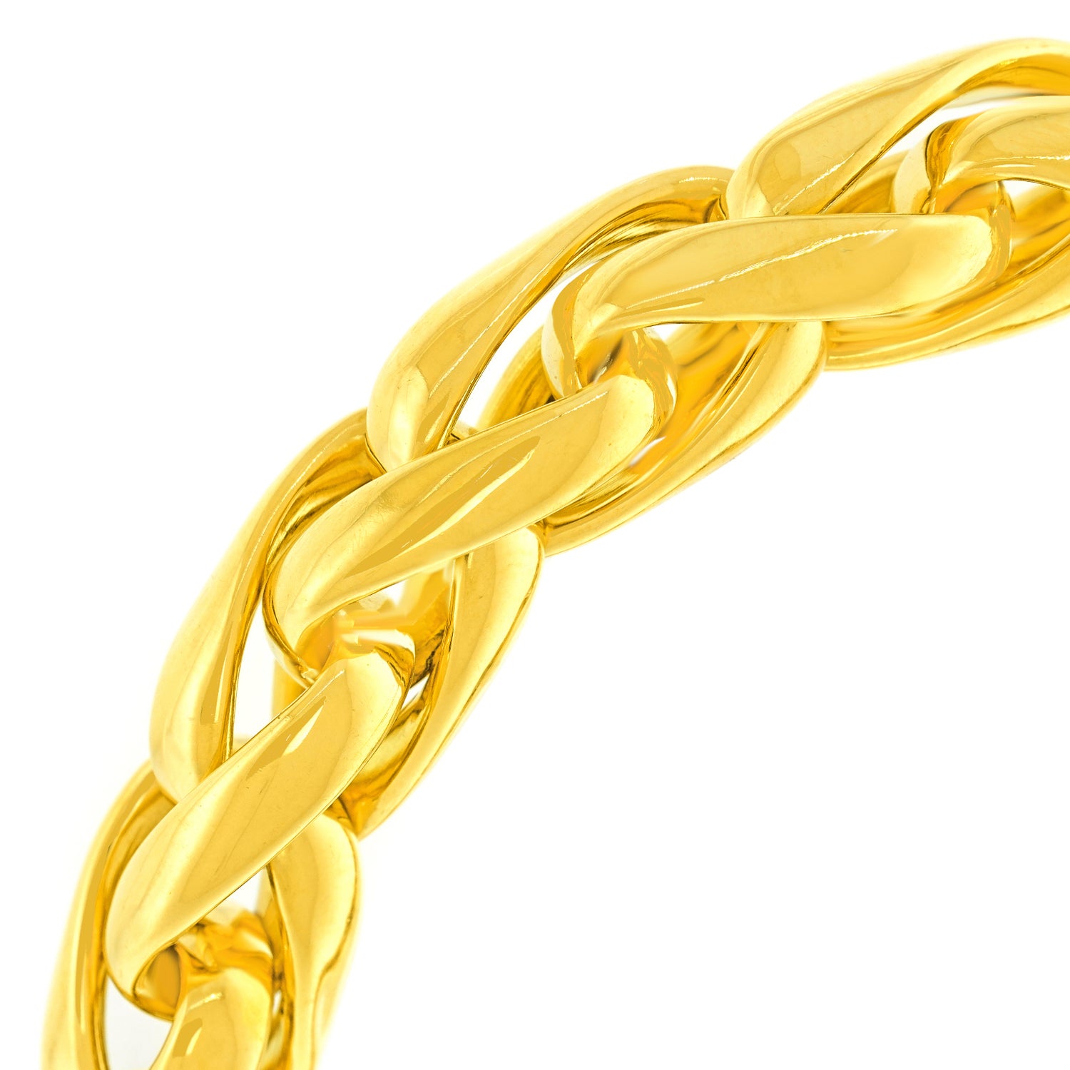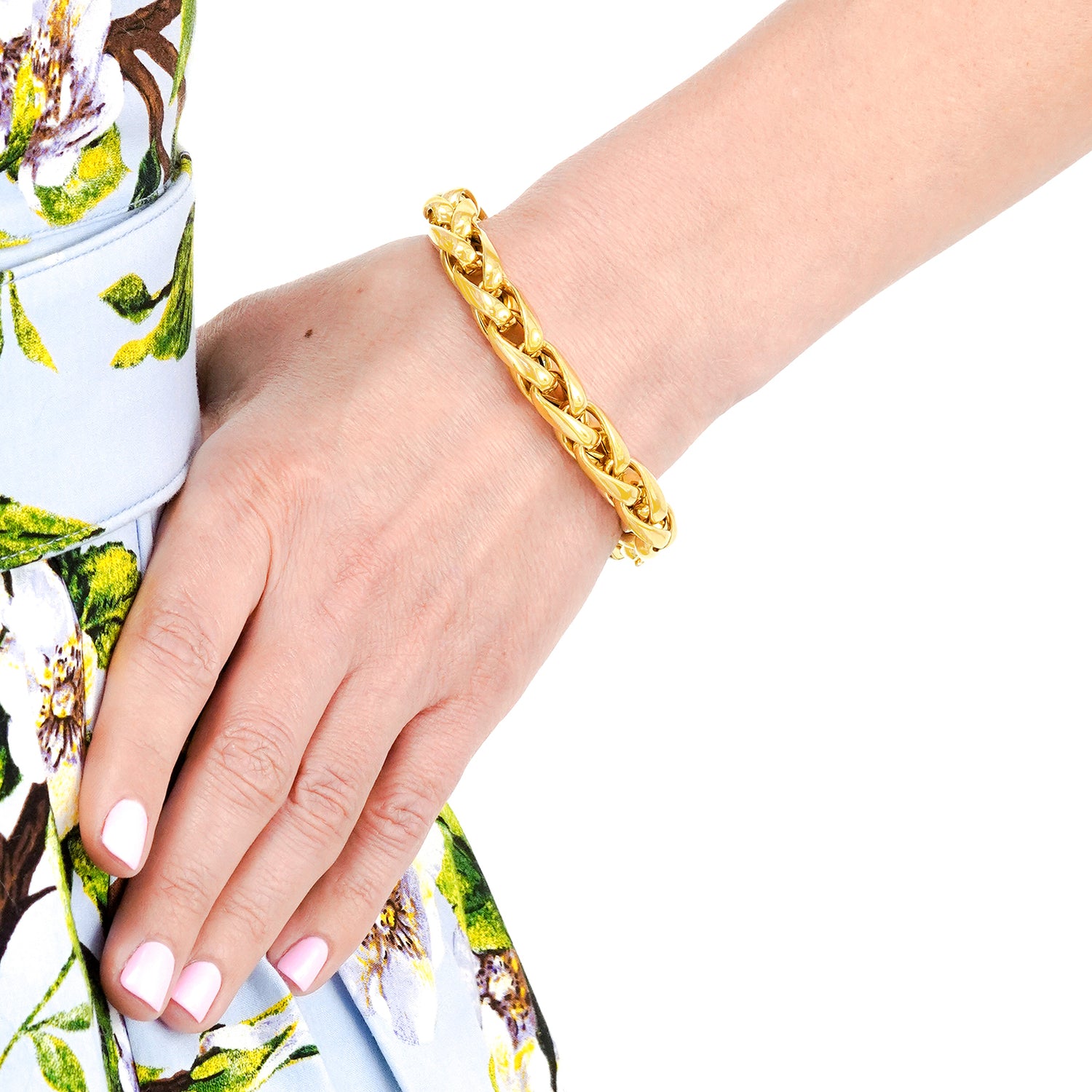 Circa 1970s, 18k. This wearable chunky yellow gold bracelet does it all; heels and jeans to little black dresses. The unusual double link motif is reminiscent of a Russian braid …Town and Country chic at its every day best. Finely fabricated, it is in very good condition.
