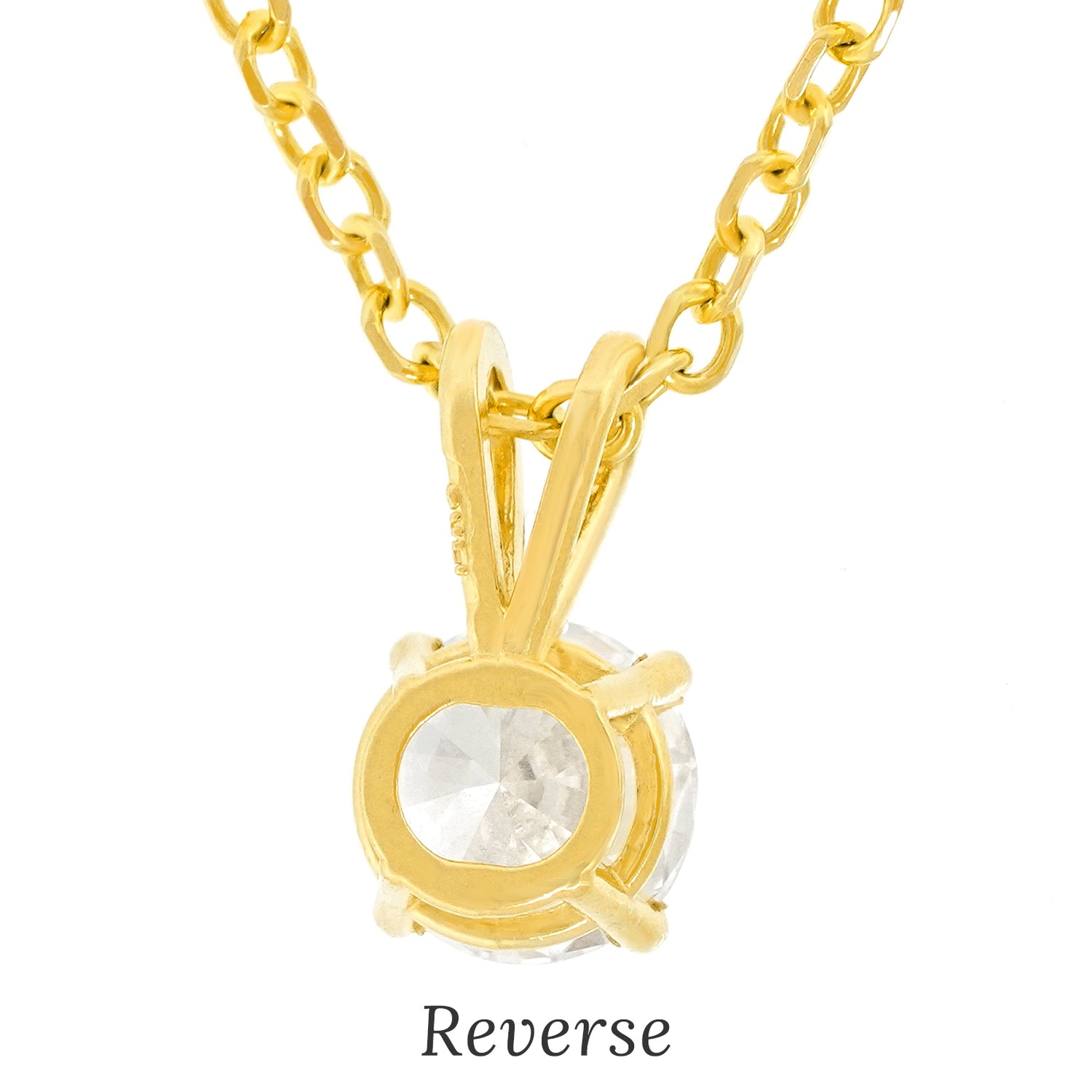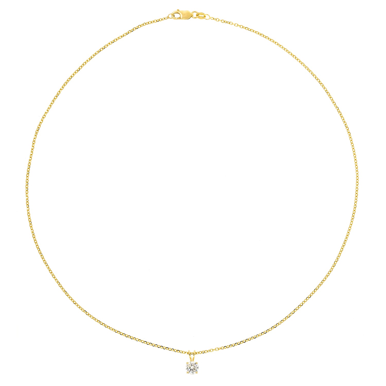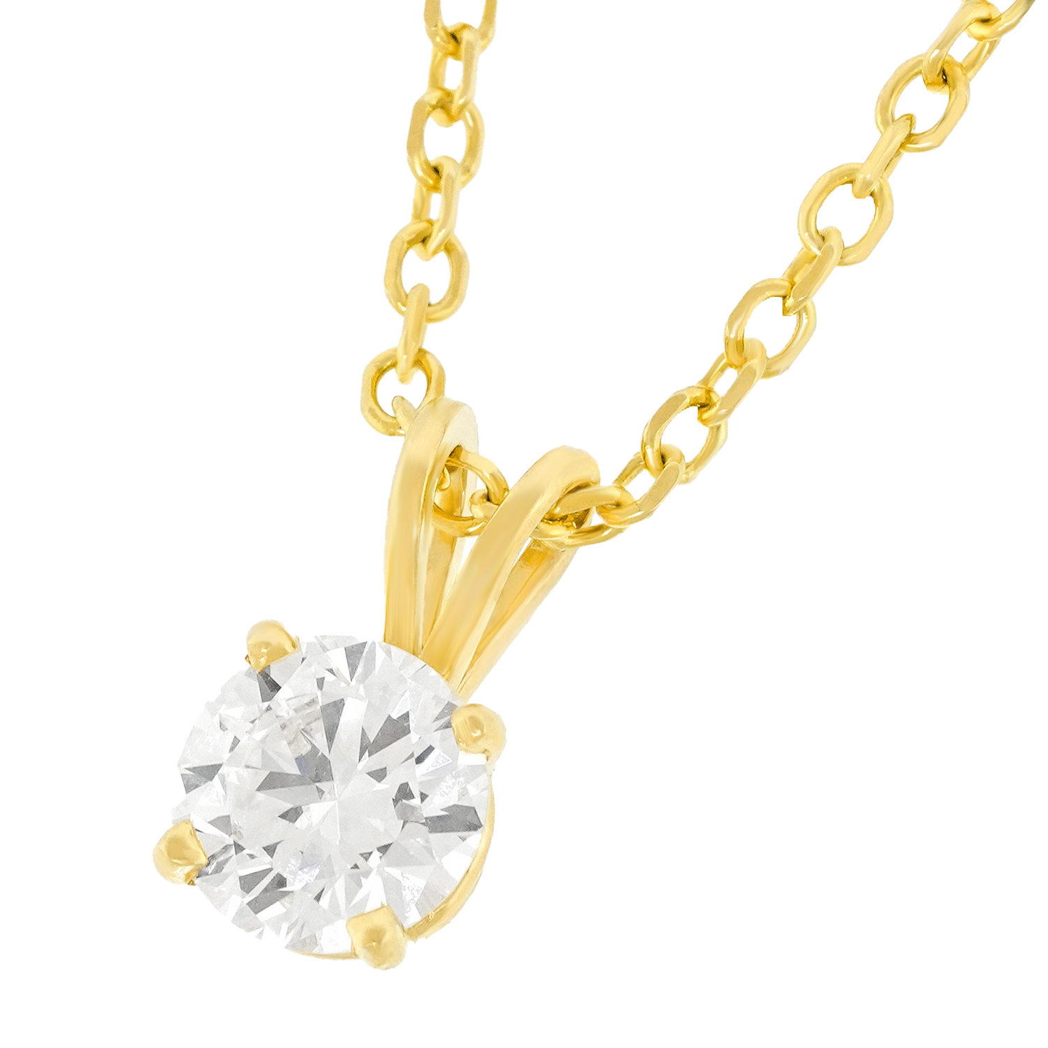 Circa 1980s, 14k, American. This .75 carat diamond solitaire pendant is classic style at its very best, the perfect “goes anywhere, goes with everything” necklace. Meticulously fabricated in 14k yellow gold, the diamond is very white and sparkly (G color, VS clarity). The chain shown is included. Excellent condition.
