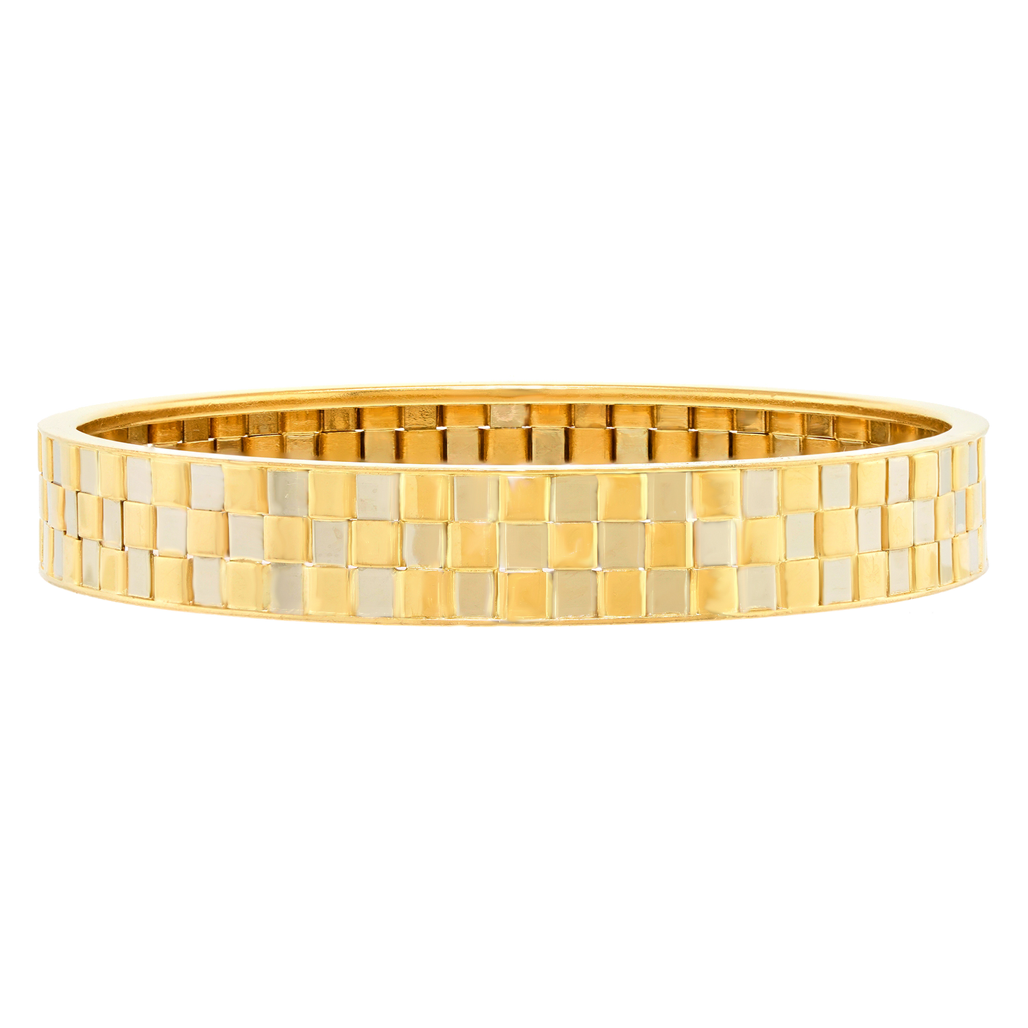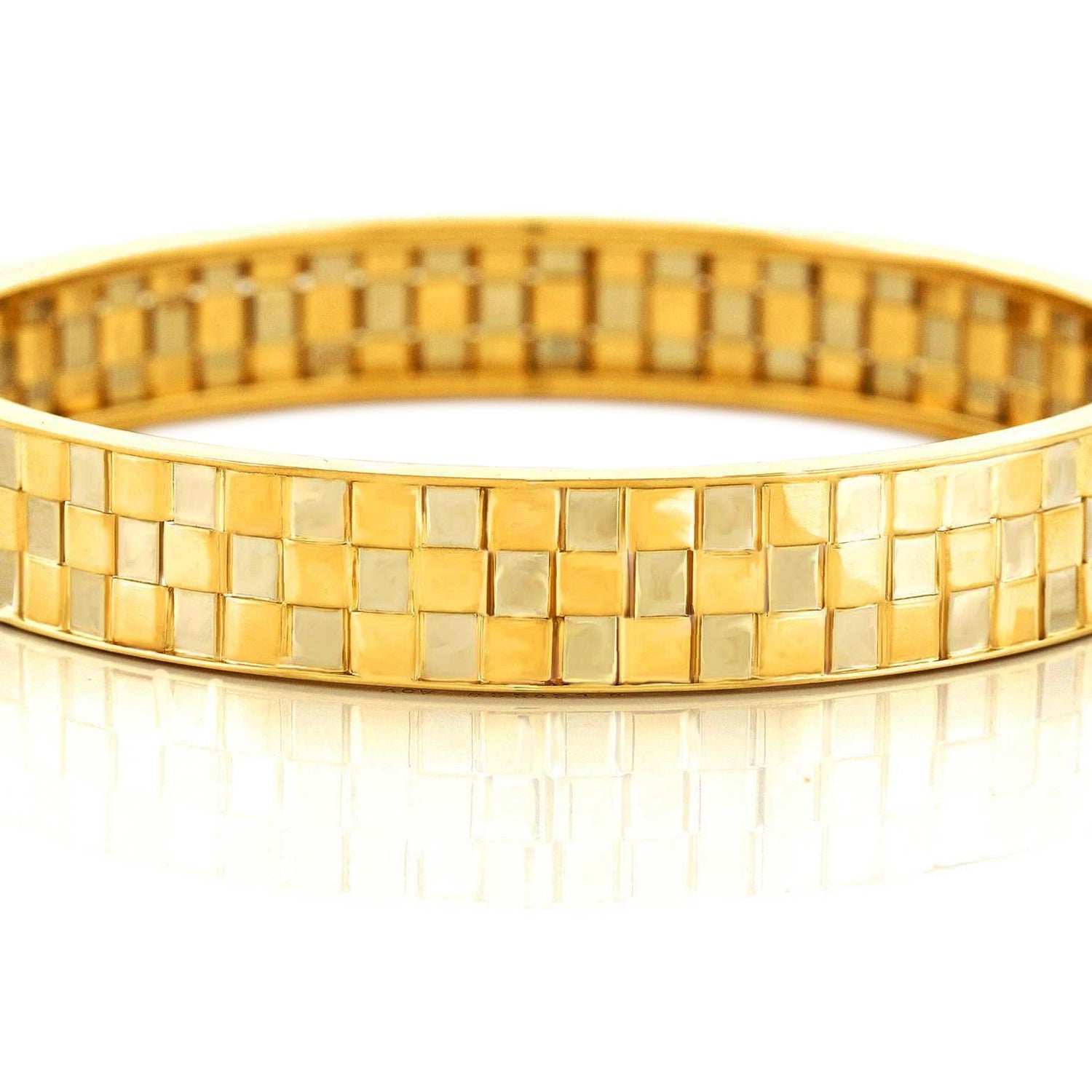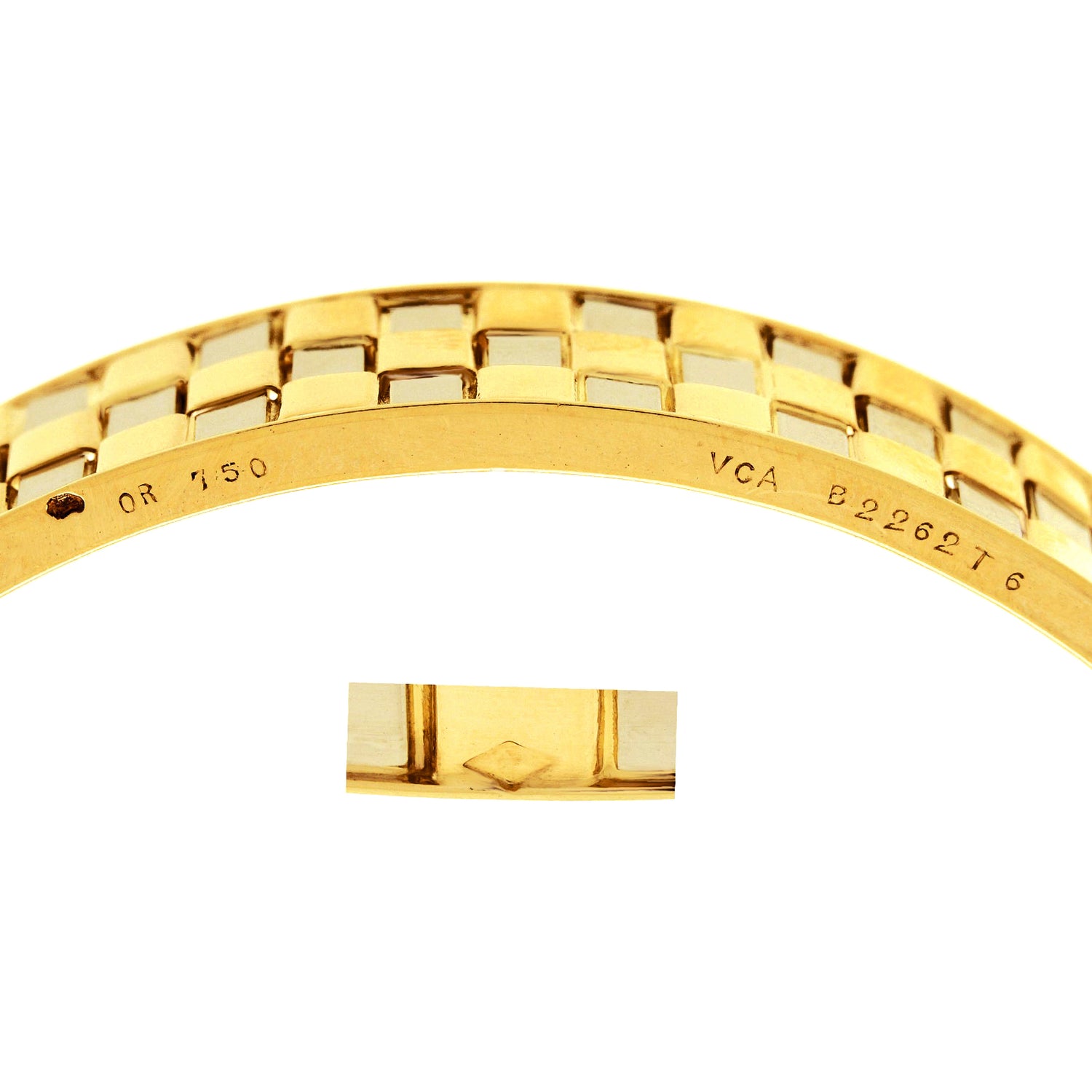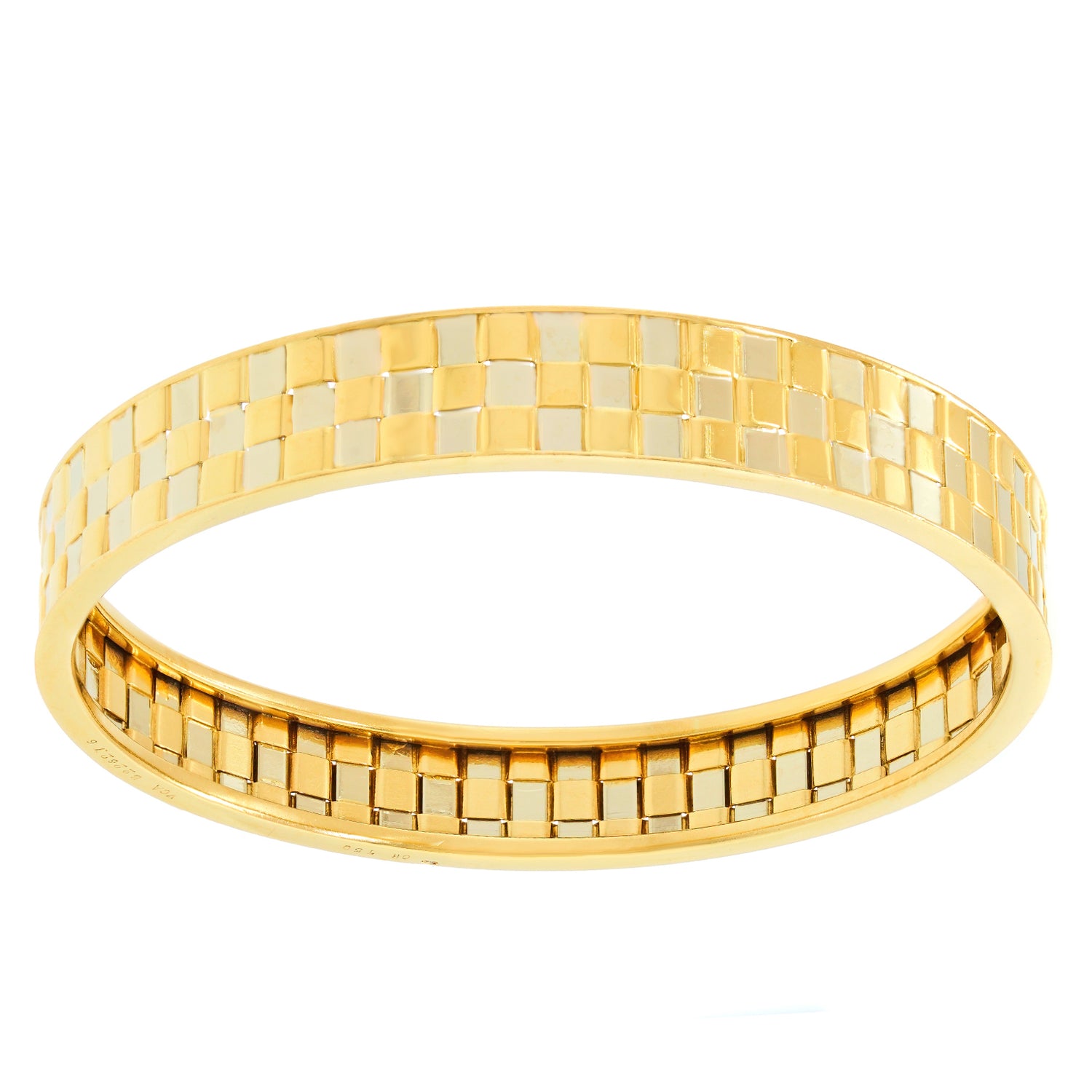 Circa 1970s, 18k, Van Cleef & Arpels, France. Art informs fashion in this chic Mod sixties bangle by Van Cleef and Arpels. The mix of white and yellow gold creates exciting movement of light, and the use of hand-fabrication in creating a true basket weave gives it visual authority. The look is an evocative mix of glamour and visionary French style.