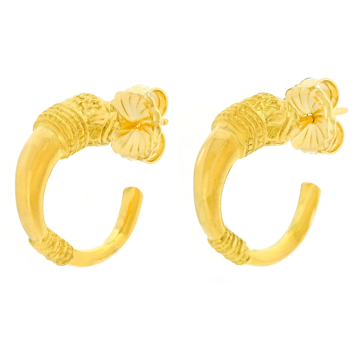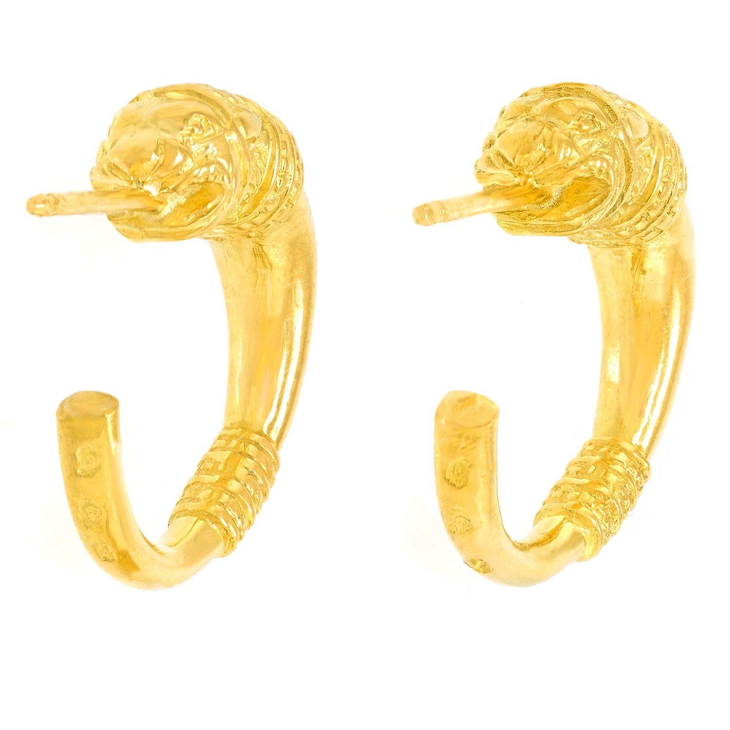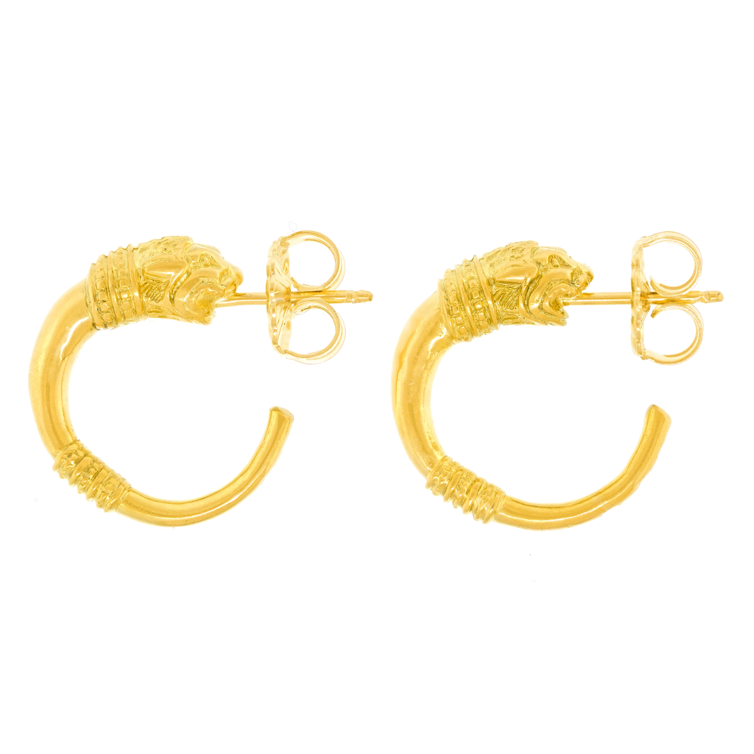 Circa 1960s, 18k, French. These earrings are delightfully sixties, ...Etruscan revival at its ultimate chic. Wonderfully decorated with spectacular lions heads, the look is Town and Country chic at its Gallic best. Quality construction throughout in eighteen karat gold completes the picture. Excellent condition.