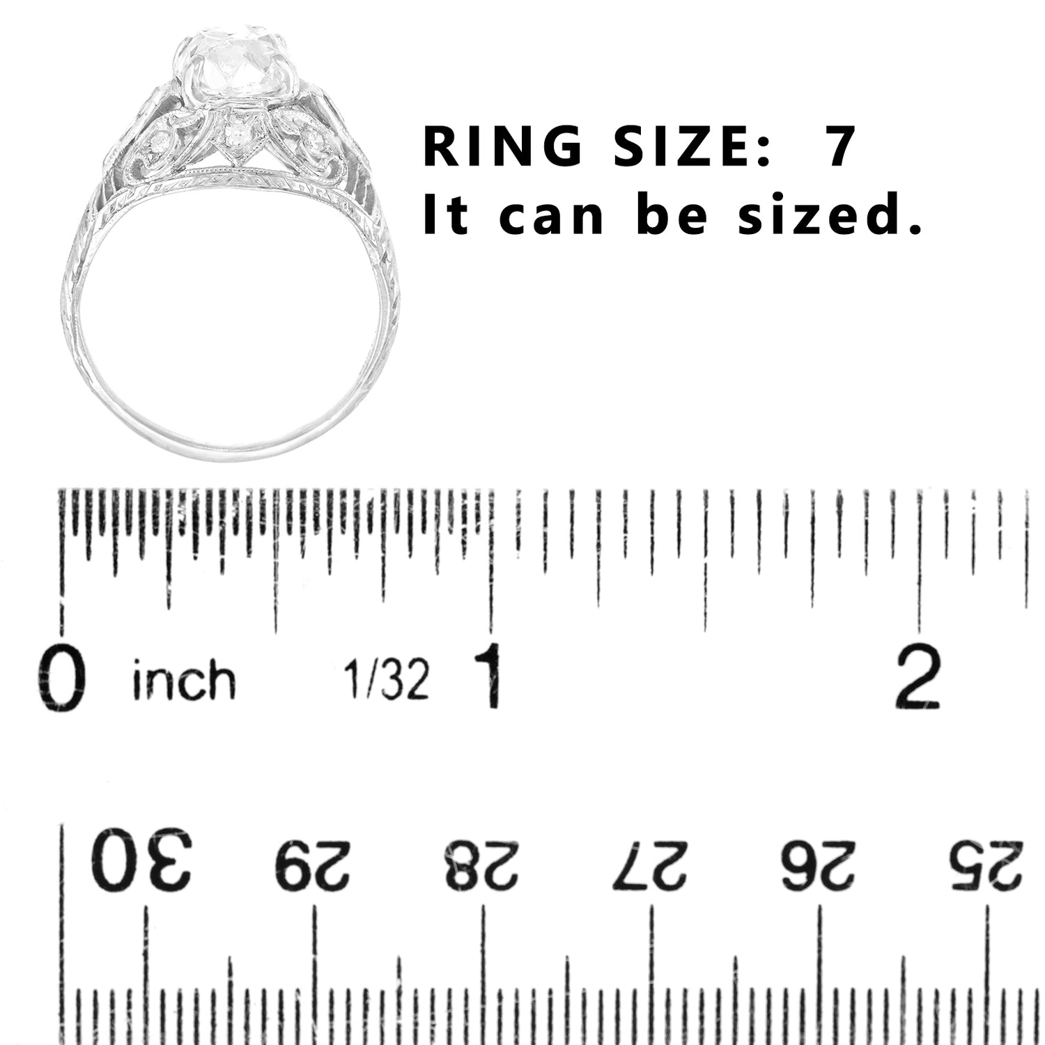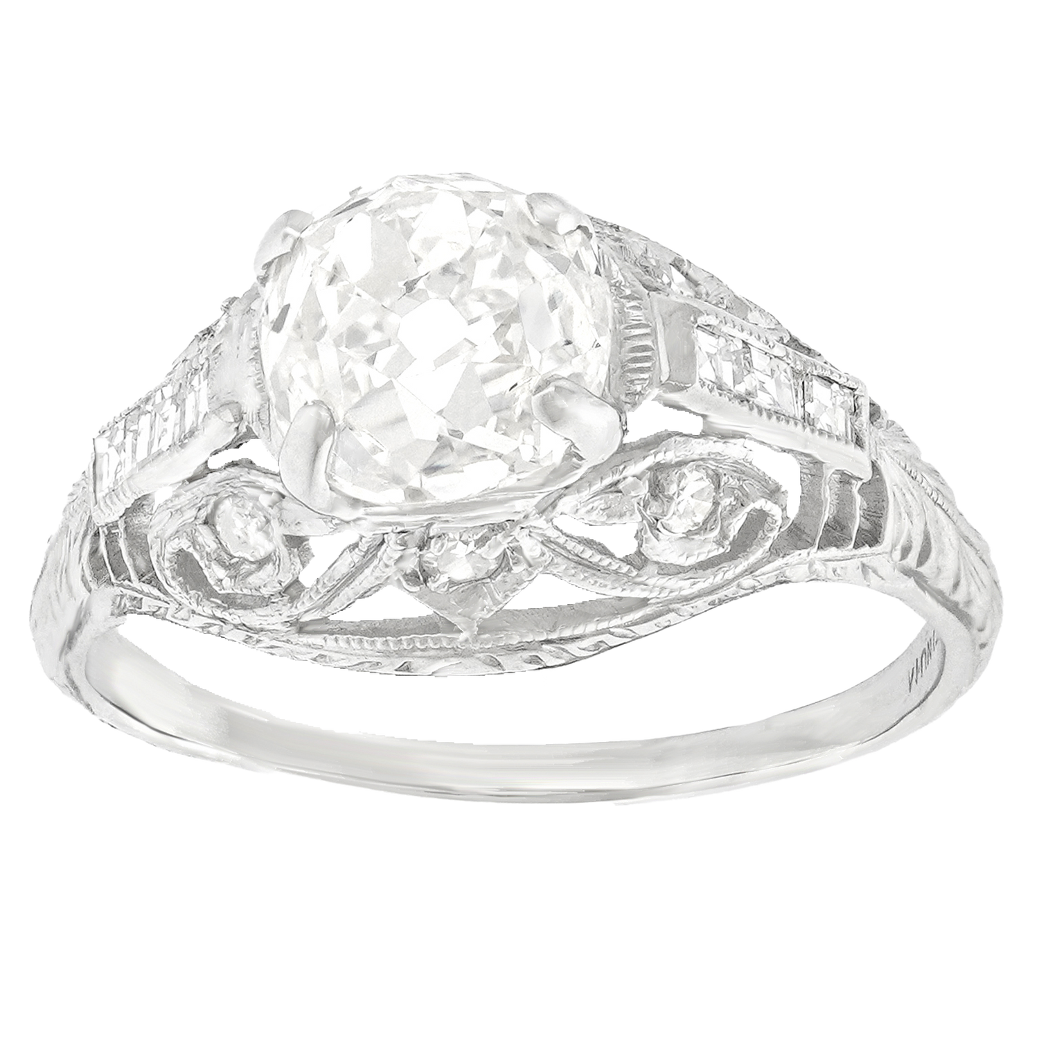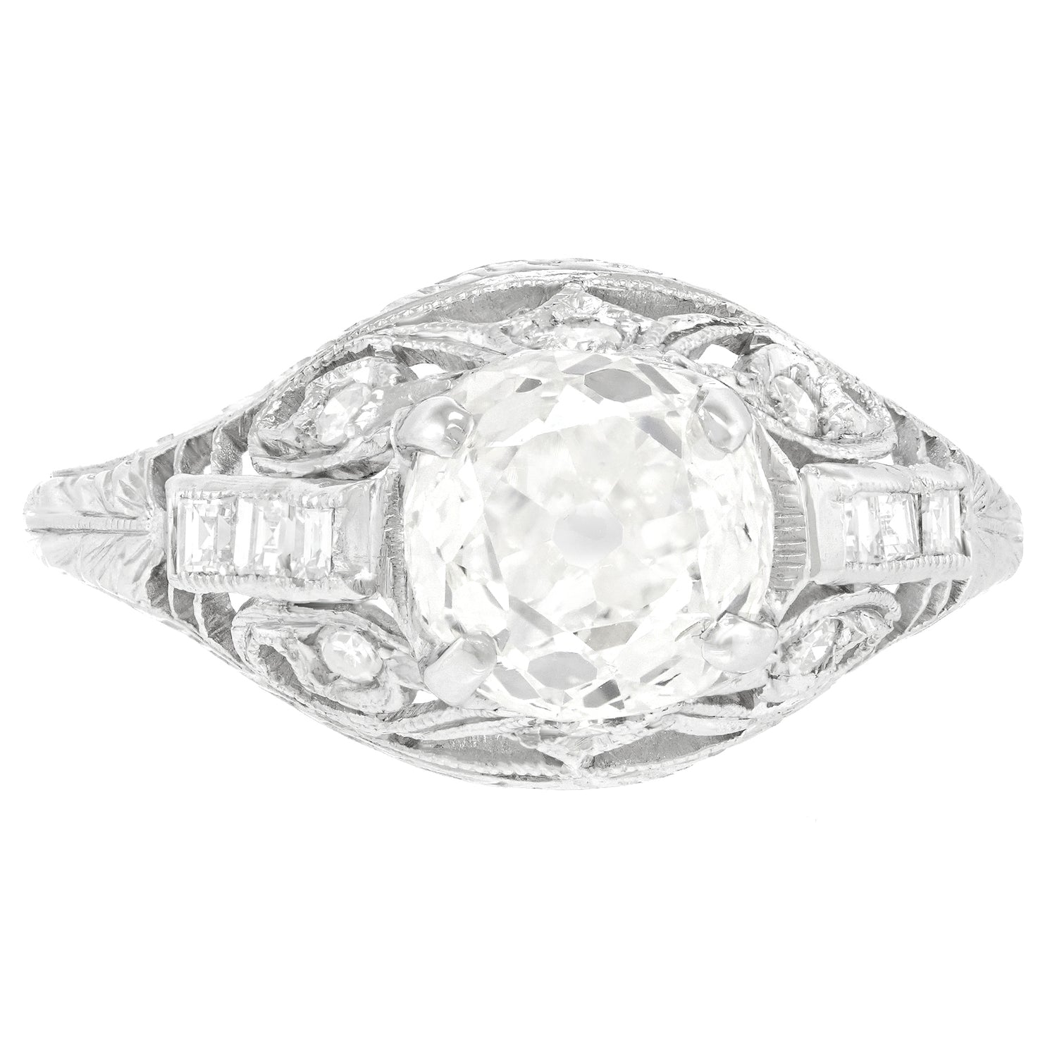 Circa 1920s, Platinum, American. This stunning Art Deco ring is set with a brilliant 1.95-carat diamond (K color, SI2 clarity, GIA report) accented by an additional .30 carats of fine diamonds. Its fluid geometry, and finely wrought details, give the ring a distinctive Deco look. Perfect as an engagement ring or as a vintage chic accessory, this outstanding ring is in excellent condition.